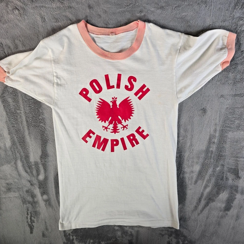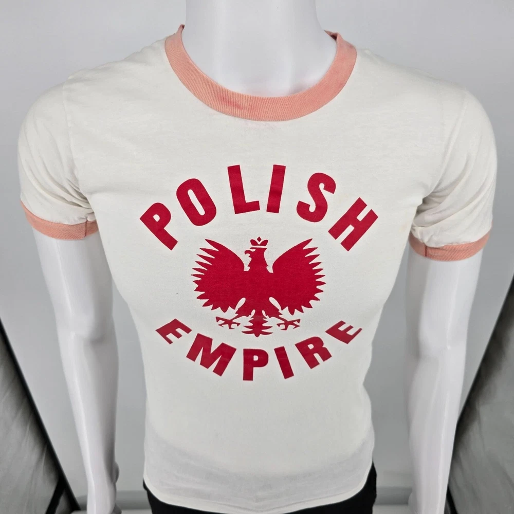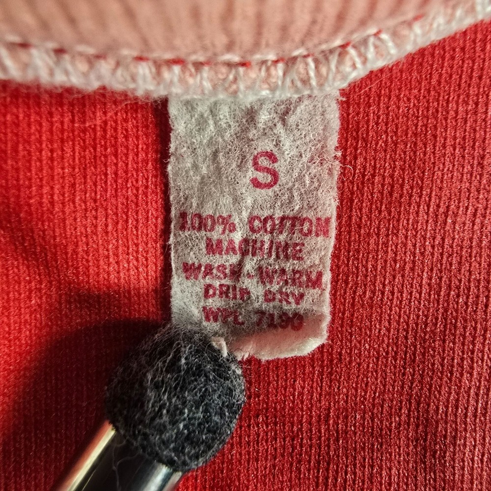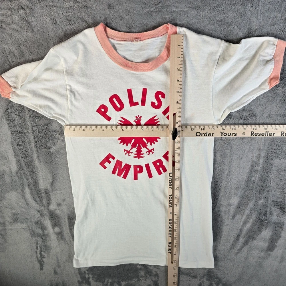 🔹 Item Details: Brand: H.L. Miller & Son (per WPL number) Material: 100% Cotton Color: White with Red/Peach Ringer Trim Decade of Manufacture: 1970s Country of Manufacture: USA Notable Features: Single Stitch hem, ringer collar and cuffs, stylized eagle crest graphic 🔹 Condition Notes: Good used vintage discoloration. Faint discoloration on front of shirt to side of logo near pit. Fainter discoloration in same area on back of shirt. Light to moderate fabric wear throughout. See photos. 🔹 Size Notes: Vintage Tag Size: Small Modern Measured Size: XXS/2XS (30.5) 🔹 Measurements (Approximate): Chest (pit to pit): 30.5 inches Collar to Hem: 24 inches 🔹 Shipping & Returns: Ships worldwide from Lexington, KY. Ships within 3 business days of purchase. Returns accepted within 60 days for domestic orders and 30 days for international orders.