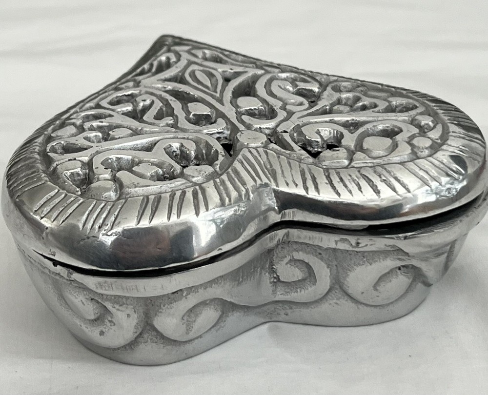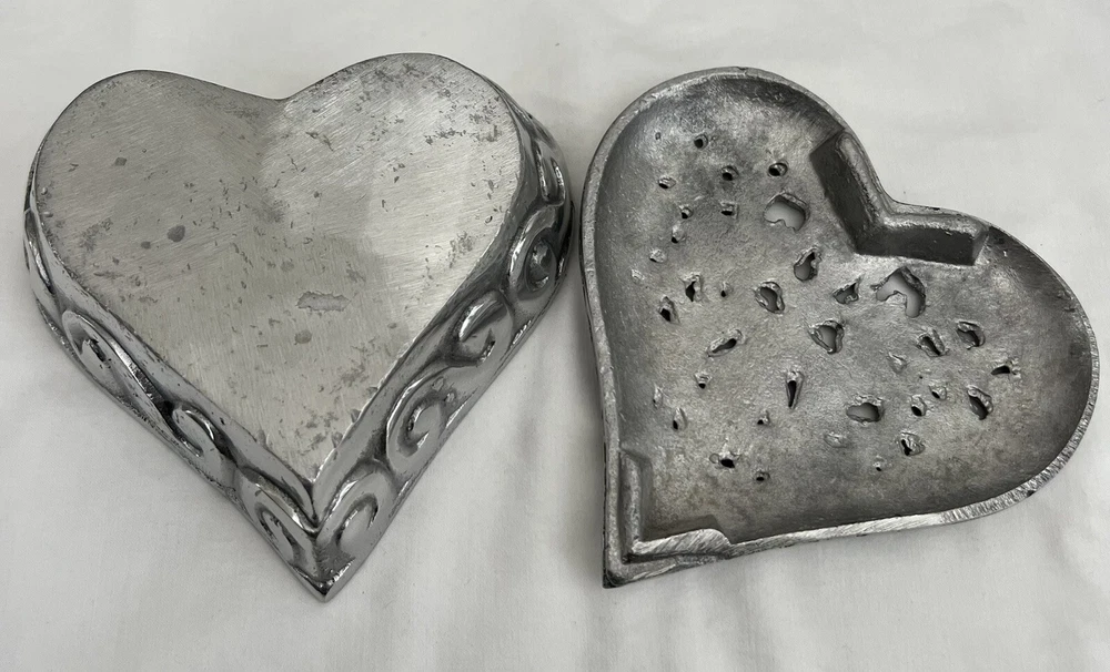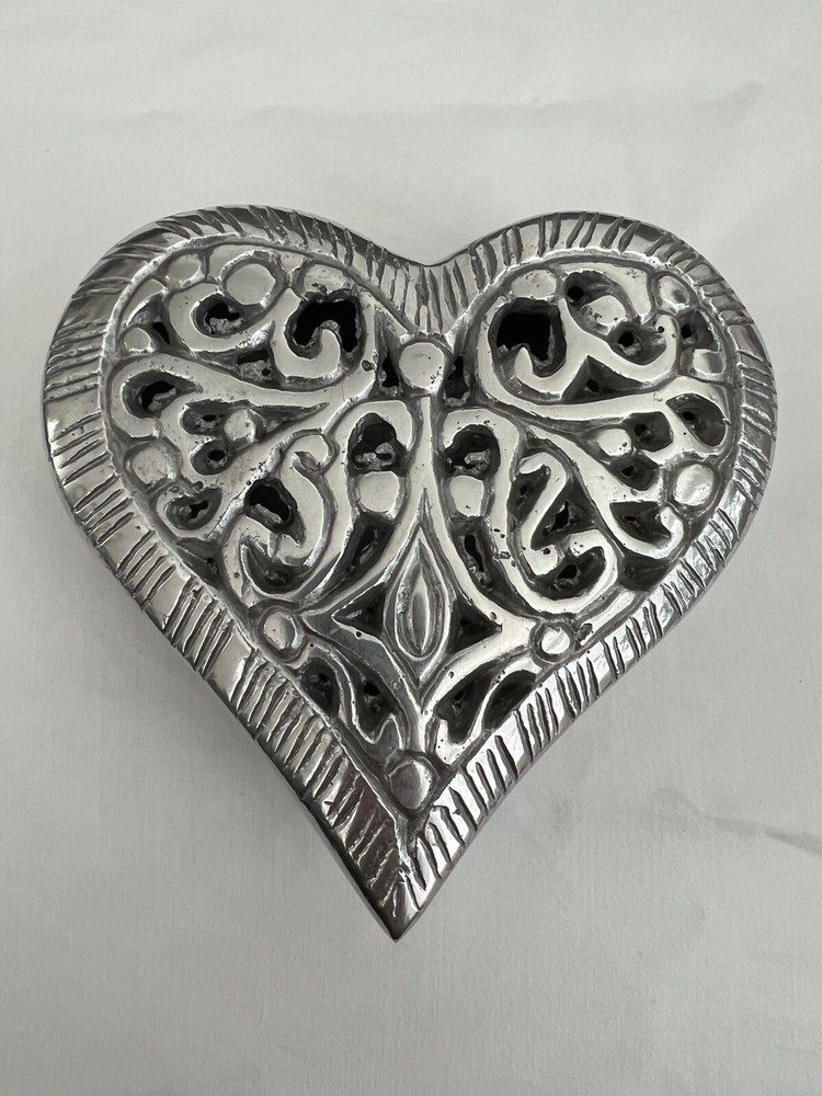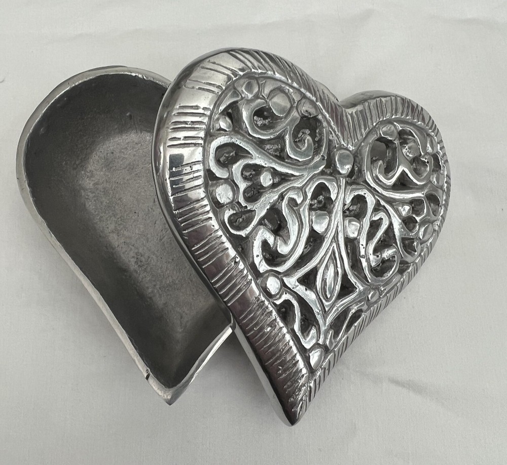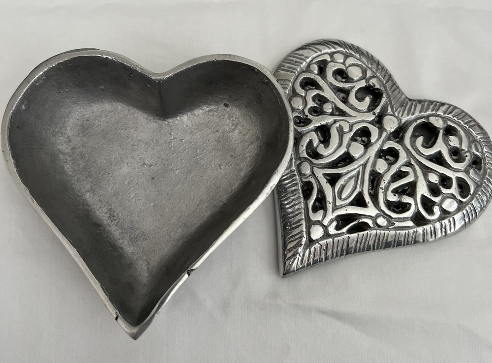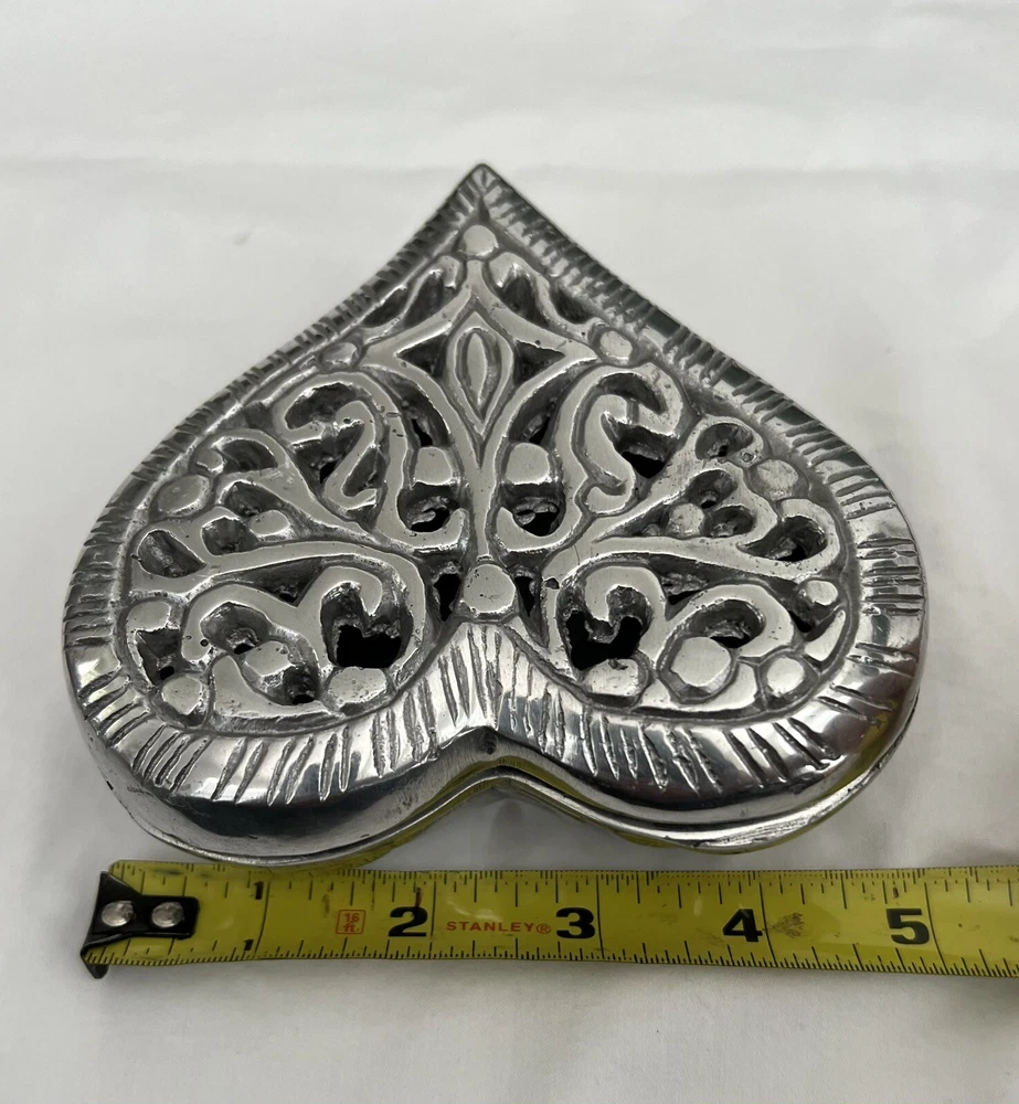 See photos for size and details. Box is vintage and shows some wear. Nice metal heart dish for your collection or makes a great gift ! 5" X 5" X 2"