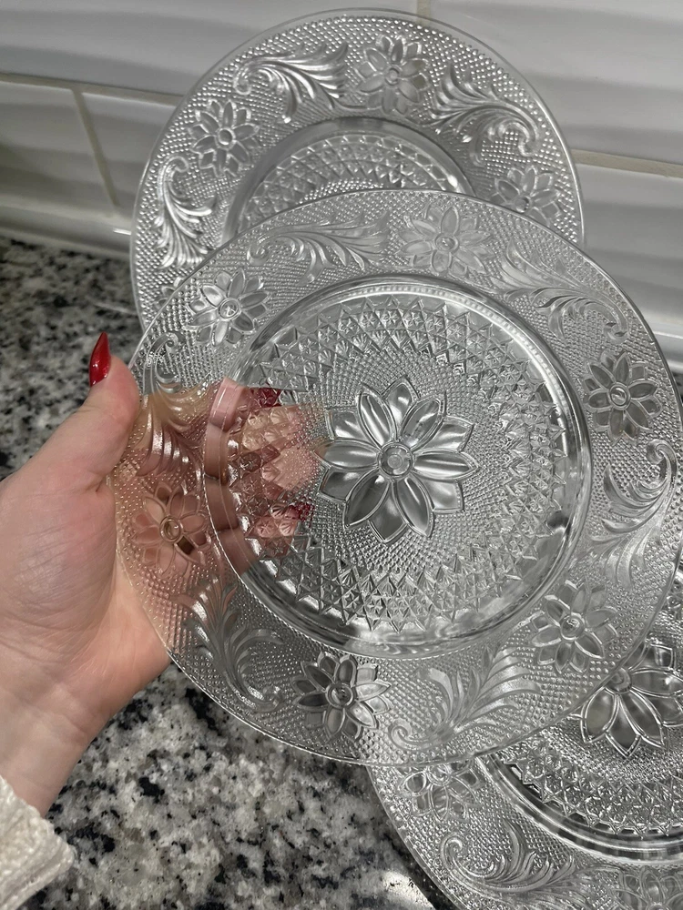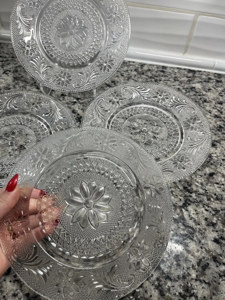 Set Includes: Luncheon Plate Material: Glass Product Line: Tiara Collection Vintage: Yes Handmade: Yes Era: Late 20th Century (1970-1999) Number of Items in Set: One Theme: Floral Style: Mid-Century Modern Item Weight: 2 lbs. Manufacturer Warranty: NA Origin: America Item Length: NA Care Instructions: Dishwasher Safe Backstamp: None MPN: S-4 Finish: Glossy Time Period Manufactured: 1970-1979 Type: Luncheon Plate Item Height: NA Country/Region of Manufacture: United States Brand: Indiana Glass Color: Clear Department: Adult Antique: No Original/Licensed Reproduction: Original Shape: Round Pattern: Sandwich Year Manufactured: 1970 Features: Decorative, Dishwasher Safe Production Technique: Fused Glass Occasion: All Occasions Production Style: Pressed Glass