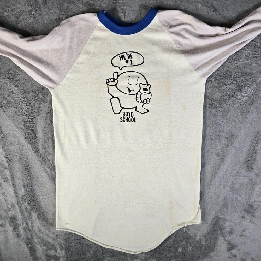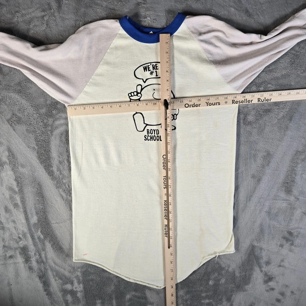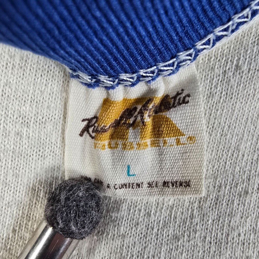 ๐น Item Details: Brand: Russell Athletic Material: 70% Cotton, 30% Polyester Color: Natural/Beige Body with Light Taupe Sleeves and Blue Ribbed Collar Decade of Manufacture: 1970s Country of Manufacture: USA Notable Features: Ringer collar, curved hem, contrasting three-quarter sleeves, single stitch cuffs ๐น Condition Notes: Fair/distressed used vintage condition. Significant spots of yellow and red staining on both the font and the back. Significant areas of discoloration throughout. Moderate to heavy fabric wear throughout. See photos. ๐น Size Notes: Vintage Tag Size: Large Modern Measured Size: Medium ๐น Measurements (Approximate): Chest (pit to pit): 39 inches Collar to Hem: 29 inches at lowest point of scoop, 25 inches at highest part of scoop at hips ๐น Shipping & Returns: Ships worldwide from Lexington, KY. Ships within 3 business days of purchase. Returns accepted within 60 days for domestic orders and 30 days for international orders.