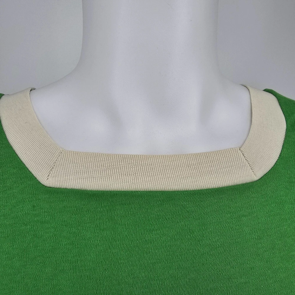 ๐น Item Details: Brand: Sears Material: Unknown (tag illegible- feels like 50/50 cotton/poly blend) Color: Green Decade of Manufacture: 1970s Country of Manufacture: Unknown (but almost certainly United States) Notable Features: Square crew neckline, contrast collar and cuffs, single stitch hem ๐น Condition Notes: Good used vintage condition. Discoloration at collar and at both cuffs. Moderate fabric wear, fading, and pilling throughout. See photos. ๐น Size Notes: Vintage Tag Size: Unknown (tag illegible) Modern Measured Size: Small ๐น Measurements (Approximate): Chest (pit to pit): 35.5 inches Collar to Hem: 24.5 inches ๐น Shipping & Returns: Ships worldwide from Lexington, KY. Ships within 3 business days of purchase. Returns accepted within 60 days for domestic orders and 30 days for international orders.