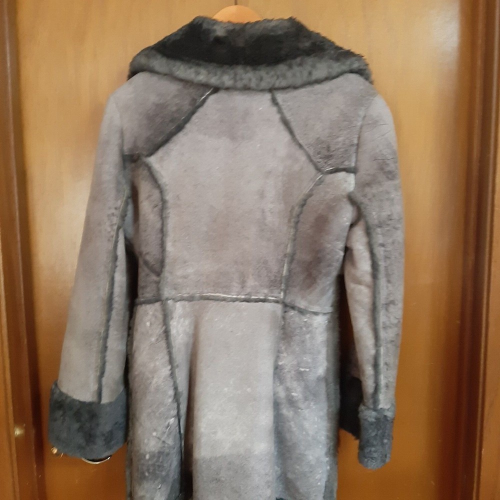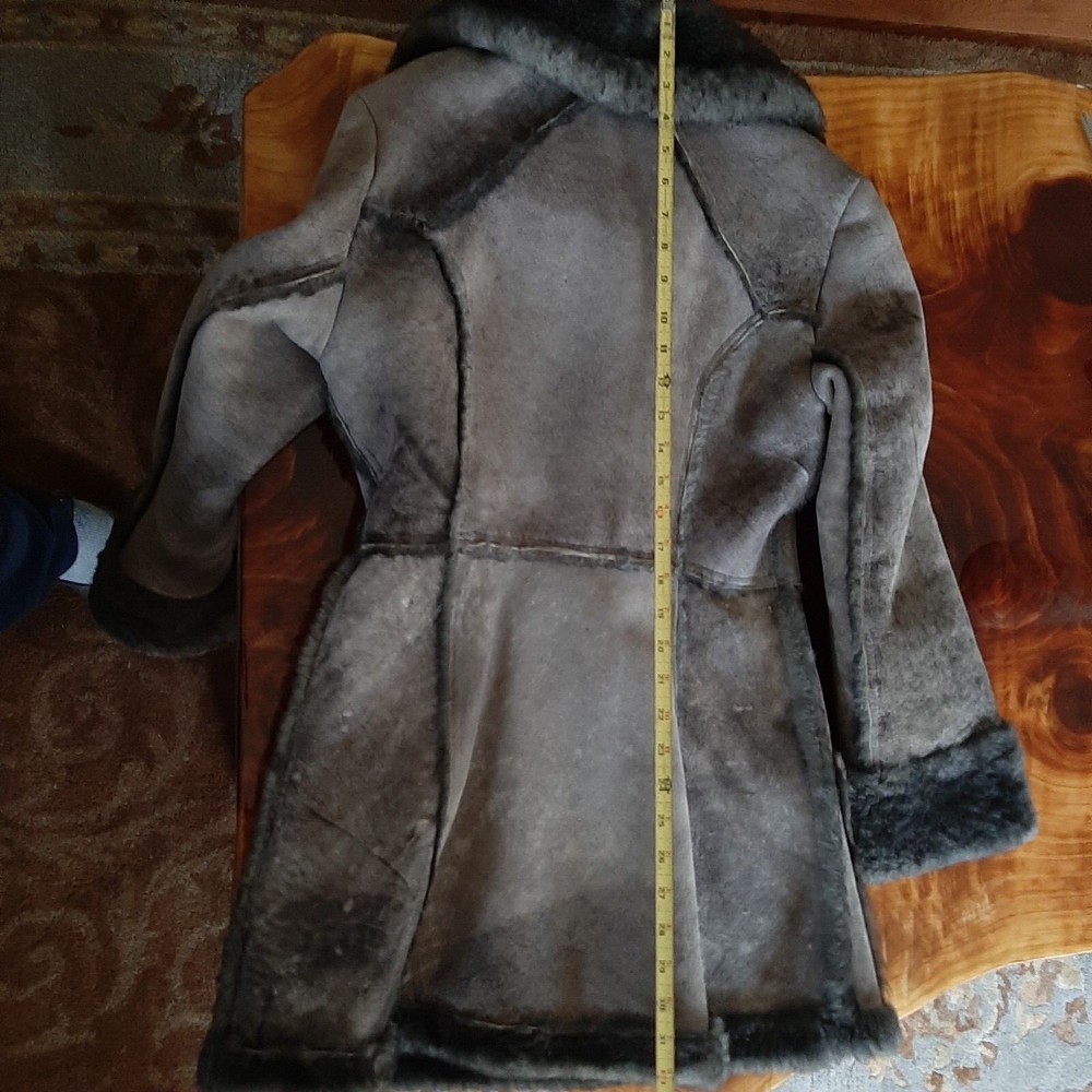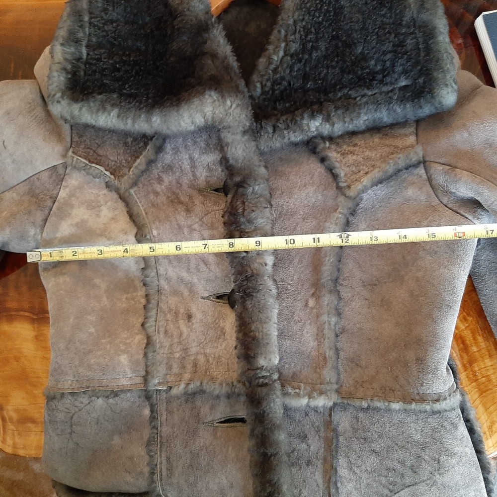 Vintage 1970's Shearling Lambs wool Women's coat Probably a size small/no size tag. Original owner, hubby bought me when we were dating in the 1970's. no size tag but appears to be a small possibly medium. 17 in across breast/ 32 in length, arm length 23.5. From non smoking home. Always kept in closet with shoulder duster on. Found spare button will be included