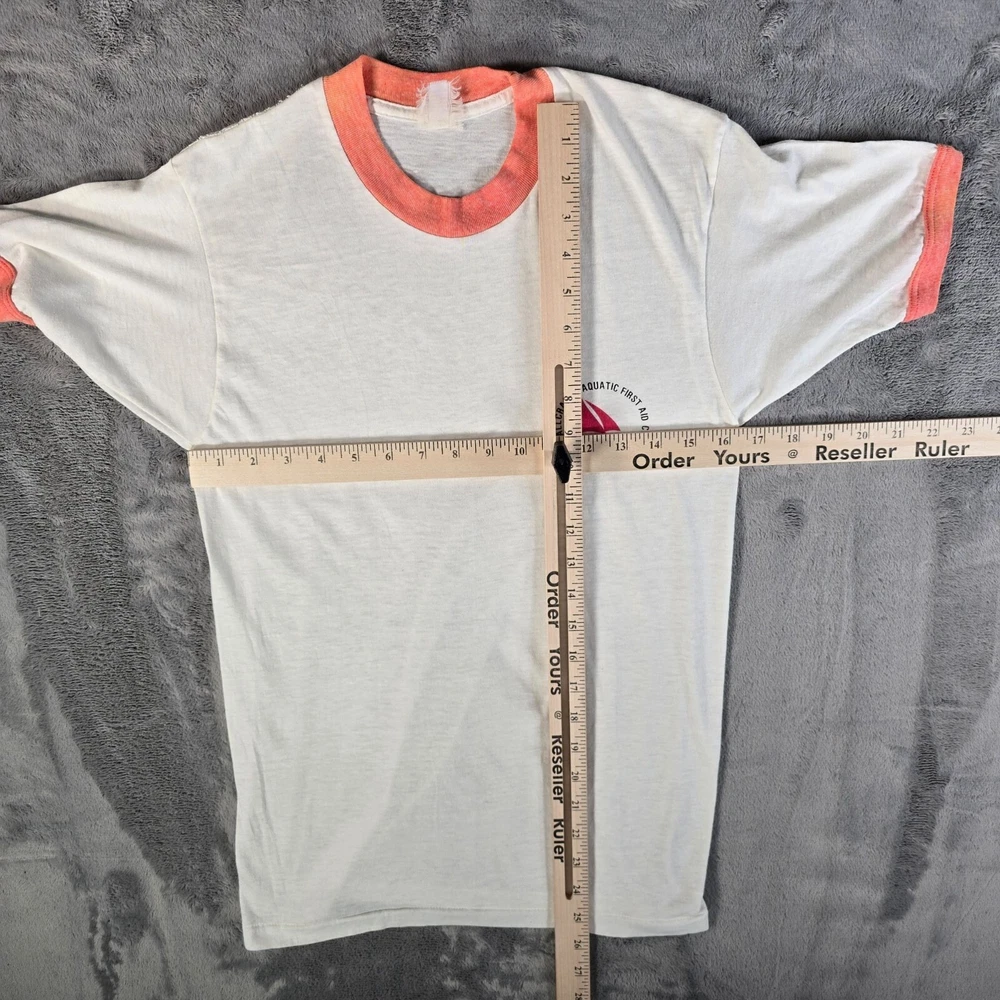 ๐น Item Details: Brand: Unknown (tag illegible) Material: Unknown (likely cotton-poly blend) Color: White with Heathered Orange Ringers Decade of Manufacture: 1970s (most likely date range is late 1970s but early 1980s is also a possibility) Country of Manufacture: Unknown (but almost certainly USA) Notable Features: Ring collar and cuffs, single stitch hem ๐น Condition Notes: Good used vintage condition. Tag illegible. Multiple small stains on back of shirt in middle. Deep vertical fold lines in the middle of both the front and the back of the shirt. Light to moderate fabric wear throughout. See photos for details. ๐น Size Notes: Vintage Tag Size: Unknown Modern Measured Size: Extra Small (32.5) ๐น Measurements (Approximate): Chest (pit to pit): 32.5 inches Collar to Hem: 25.5 inches ๐น Shipping & Returns: Ships worldwide from Lexington, KY. Ships within 3 business days of purchase. Returns accepted within 60 days for domestic orders and 30 days for international orders.