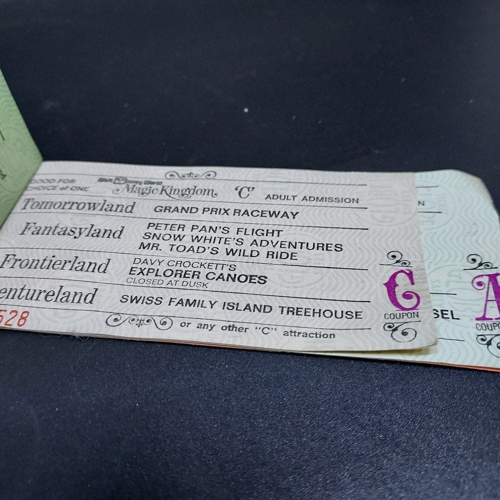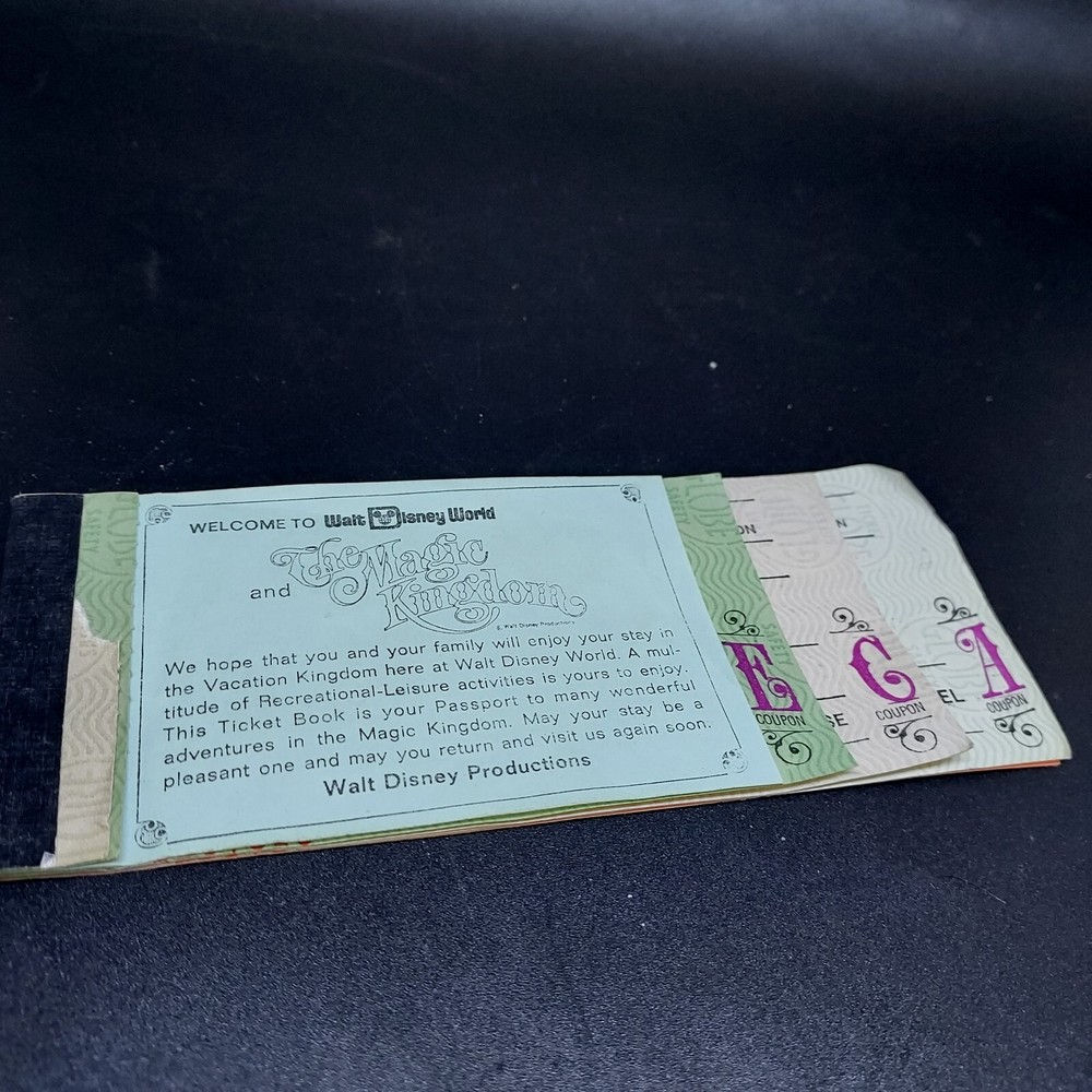 Here's a chance to own a piece of Disney history! 1970s Magic Kingdom adventure ticket booklet. Has been used,but contains 1(A),2(C) and 1 (E) ticket. Bring back memories of your visit or add to your collection.
