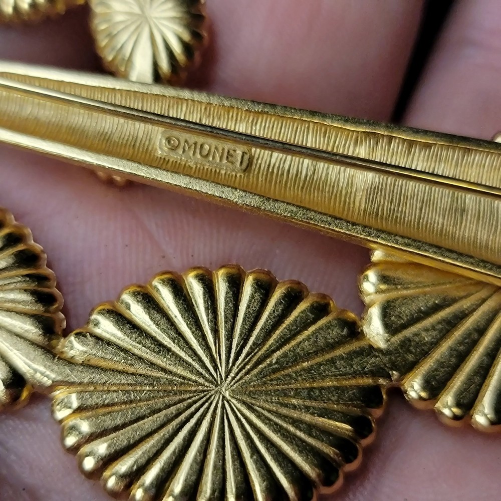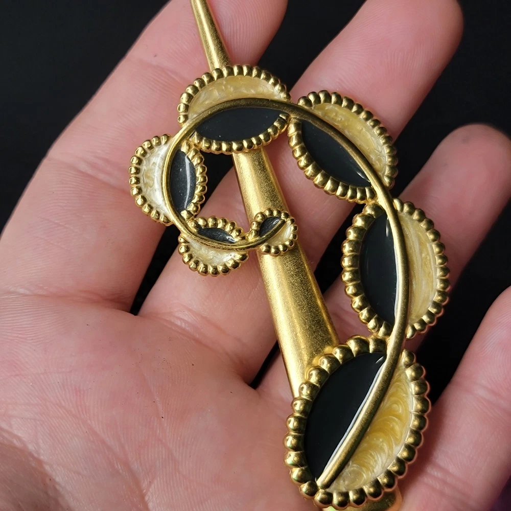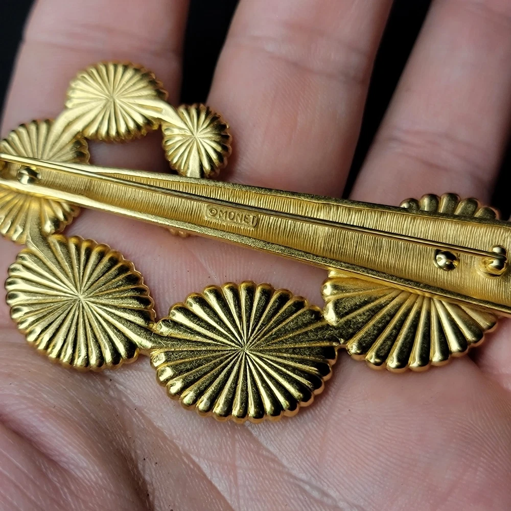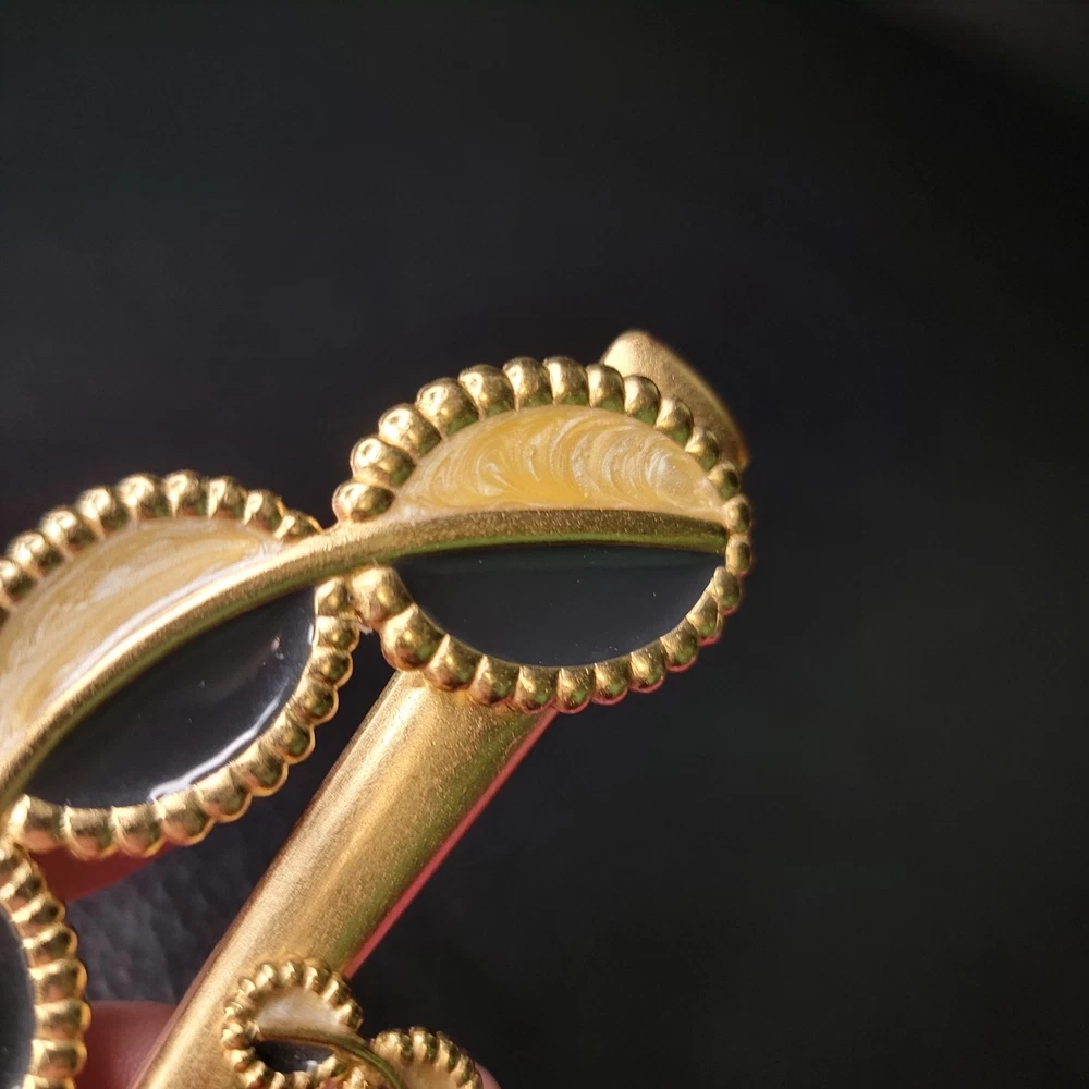 The product is a vintage 1970s MONET for YSL gold enamel modernist designer runway brooch. This brooch features a modernist design in gold enamel, typical of the YSL fashion house from that era. The brand and material suggest a high level of quality and craftsmanship, making it a unique and eye-catching accessory for any vintage jewelry collection.