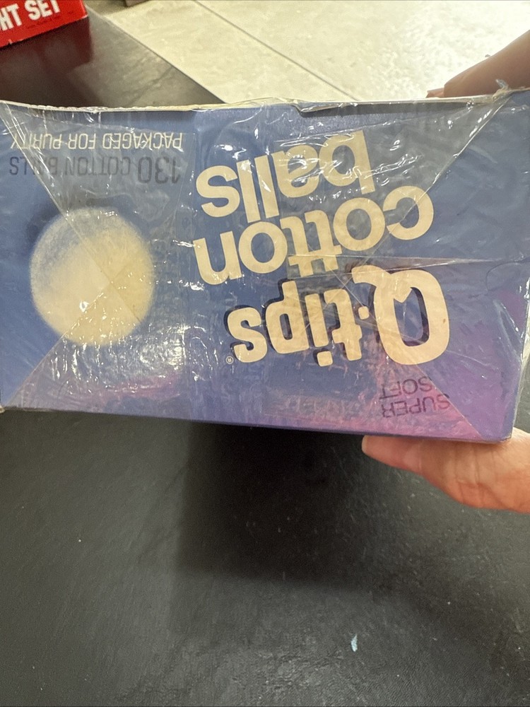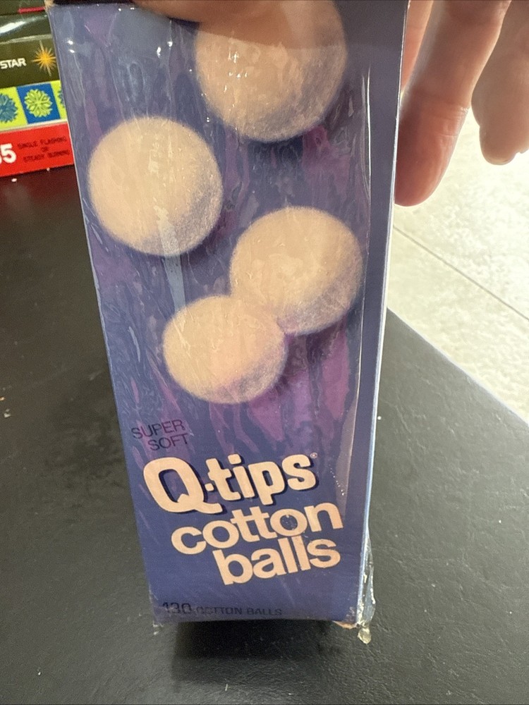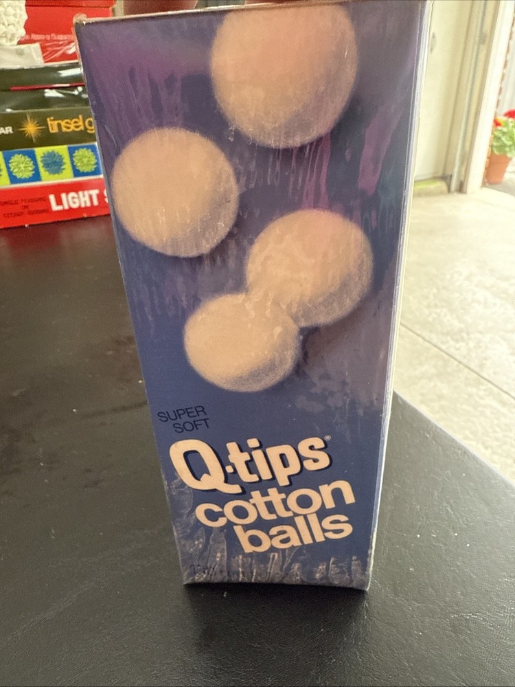The product is a vintage 1970-80 Q-tip cotton ball box that is fully sealed. This collectible advertising item is from the United States and features a blue color, making it a unique movie prop or cultural artifact. The original box with the Q-tips brand logo embodies the theme of health and beauty, adding a nostalgic touch to any collection related to vintage health and beauty products.