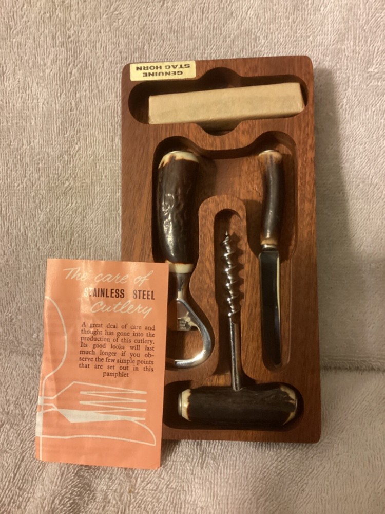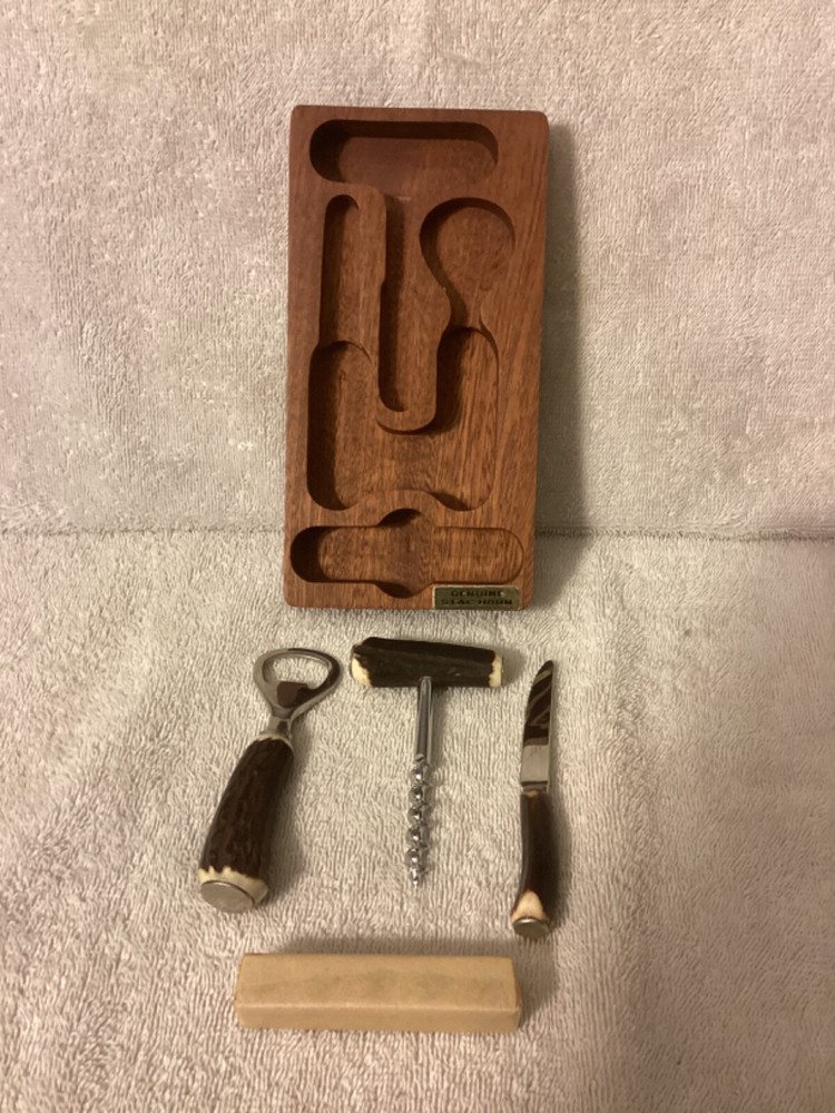 The 1972 Dice Bar Games Stancraft Butler England Wooden set features genuine Staghorn handles on various Sheffield England Stainless Steel accessories, including a knife, bottle opener, and cork remover. This drinking game set is designed for entertaining gatherings and includes a wooden holder to keep everything organized during and after play. With a vintage charm and unique materials, this set provides a stylish and functional addition to any home bar or game night collection. The dice shown are not included but to show what they look like, as they are sealed in the paper pack as pictured aside the dice.