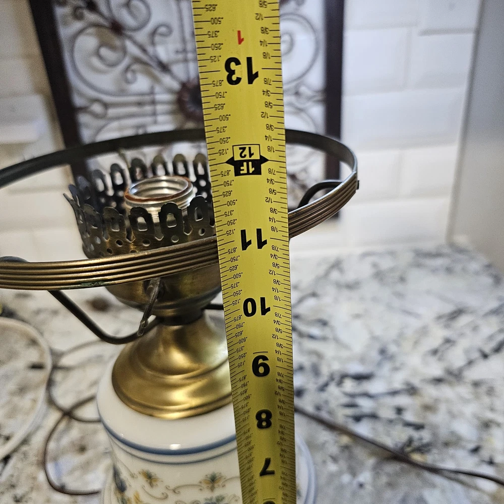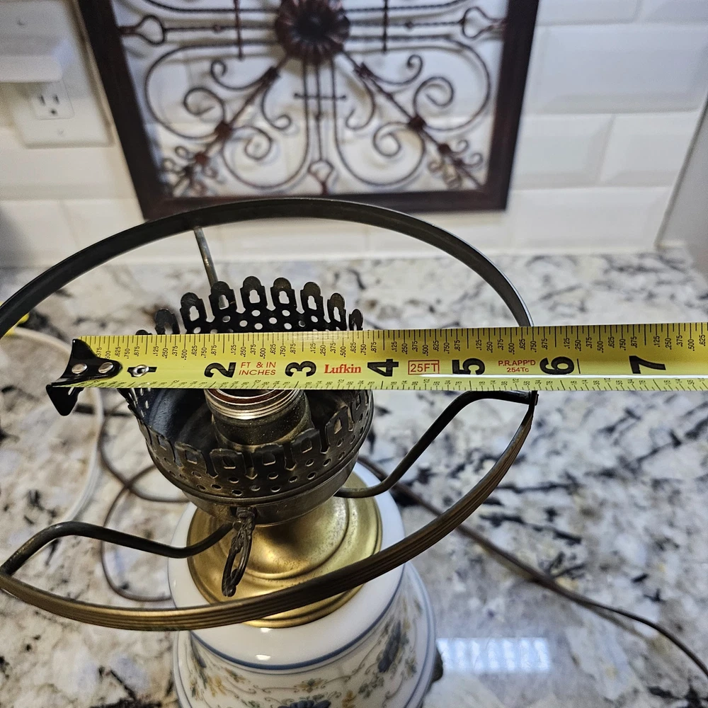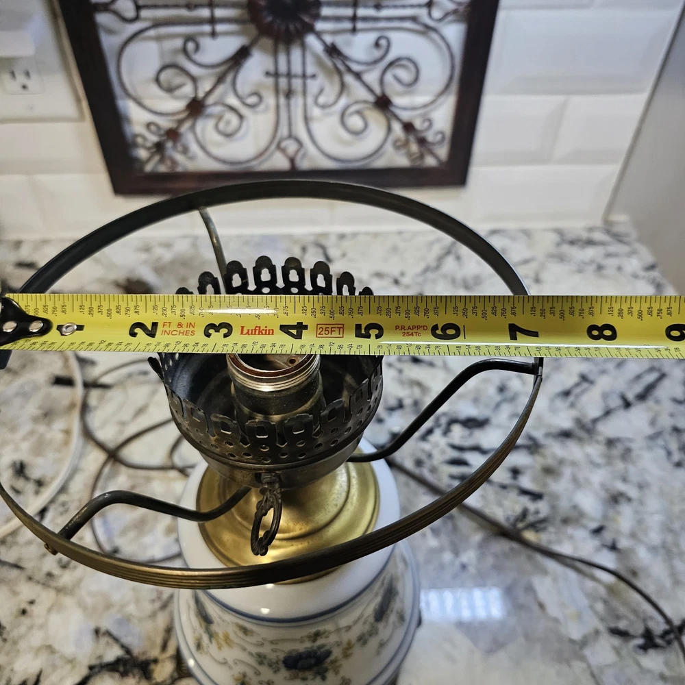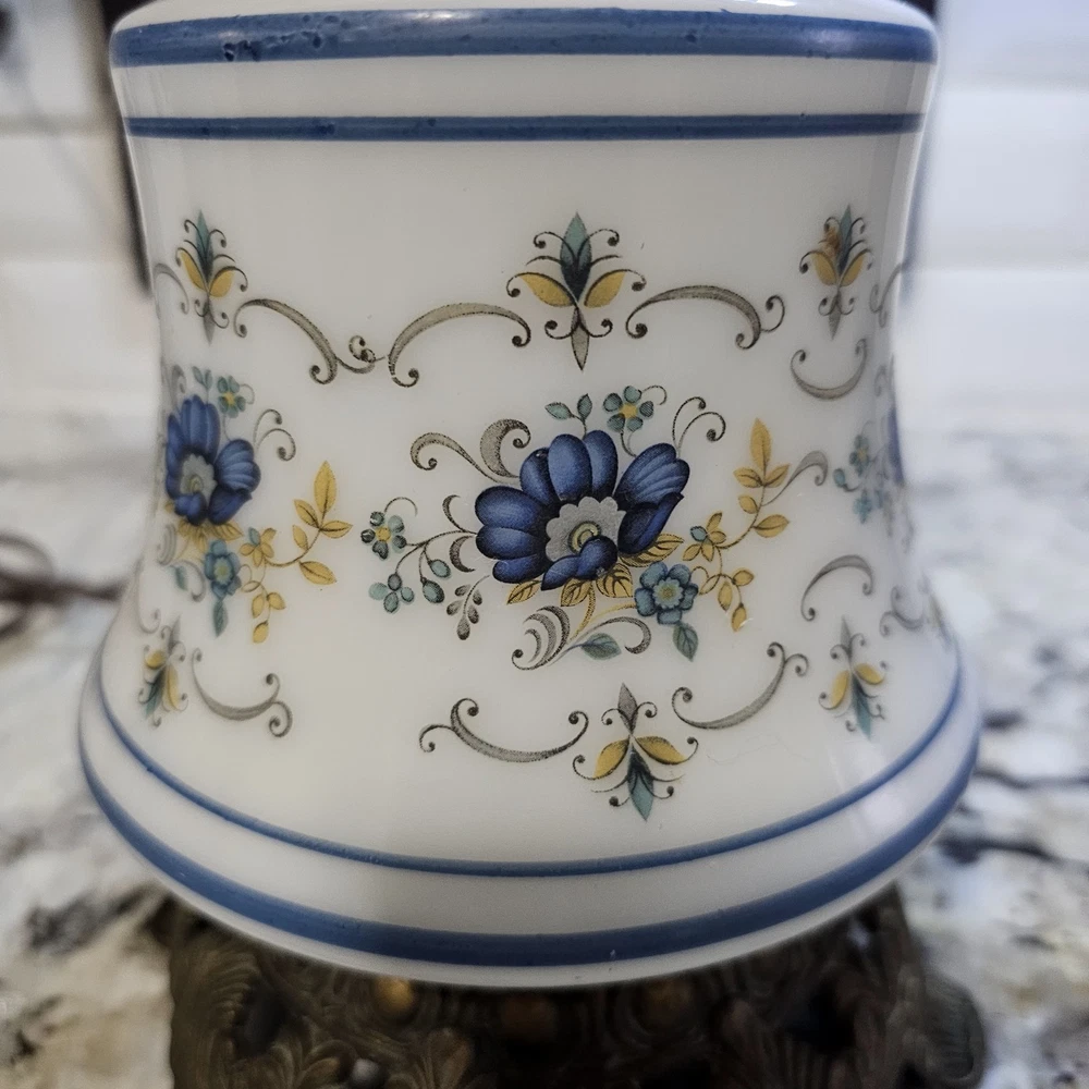 This vintage 1973 Quoizel Hurricane Lamp features an antique design with a shaded globe-shaped shade. The lamp is made of brass and glass, with a mid-century modern style in white color. It is an original parlor lamp with an electric power source, showcasing a blue and white Abigail Adams floral pattern. 3 way Lamp Tested works bulbs not included. Not in the original packaging