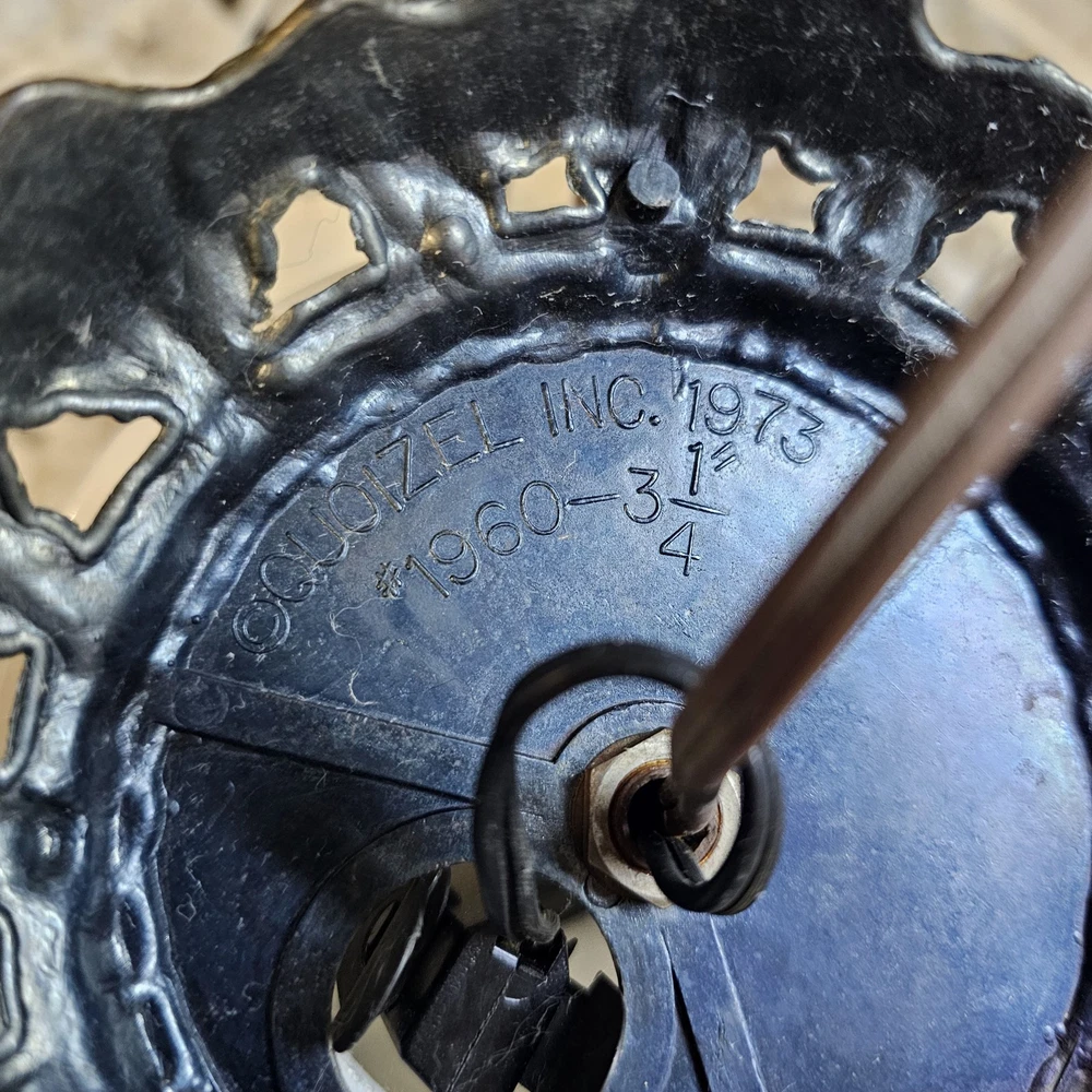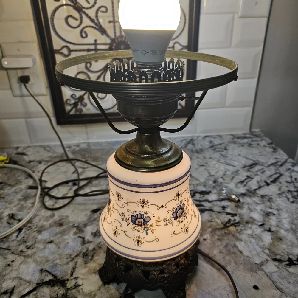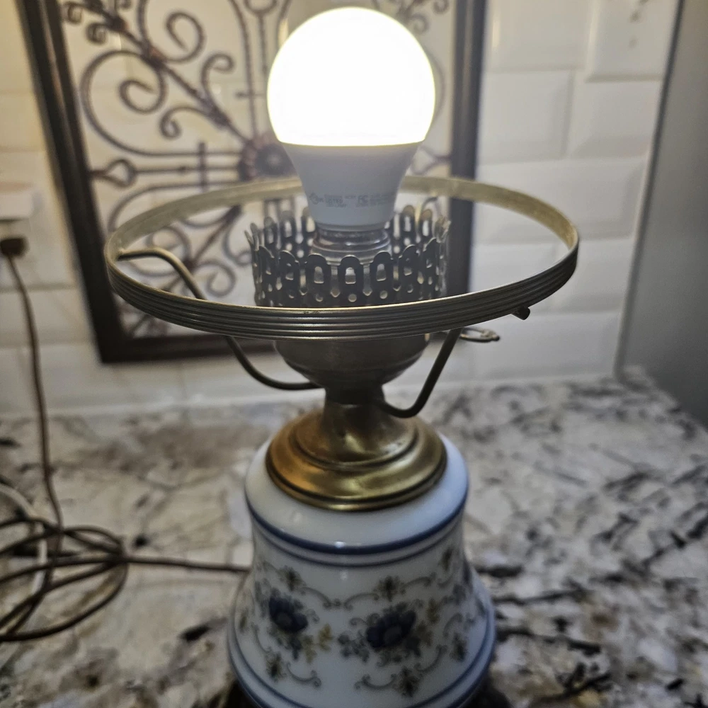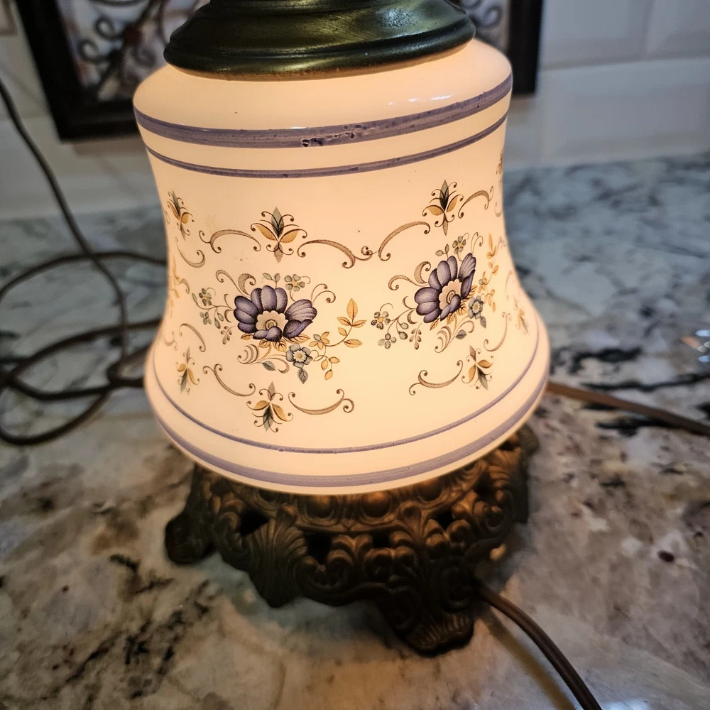 This vintage 1973 Quoizel Hurricane Lamp features an antique design with a shaded globe-shaped shade. The lamp is made of brass and glass, with a mid-century modern style in white color. It is an original parlor lamp with an electric power source, showcasing a blue and white Abigail Adams floral pattern. 3 way Lamp Tested works bulbs not included. Not in the original packaging