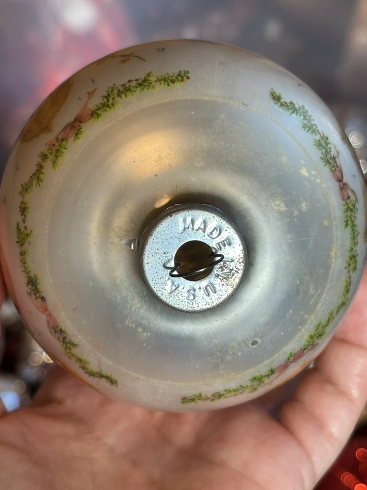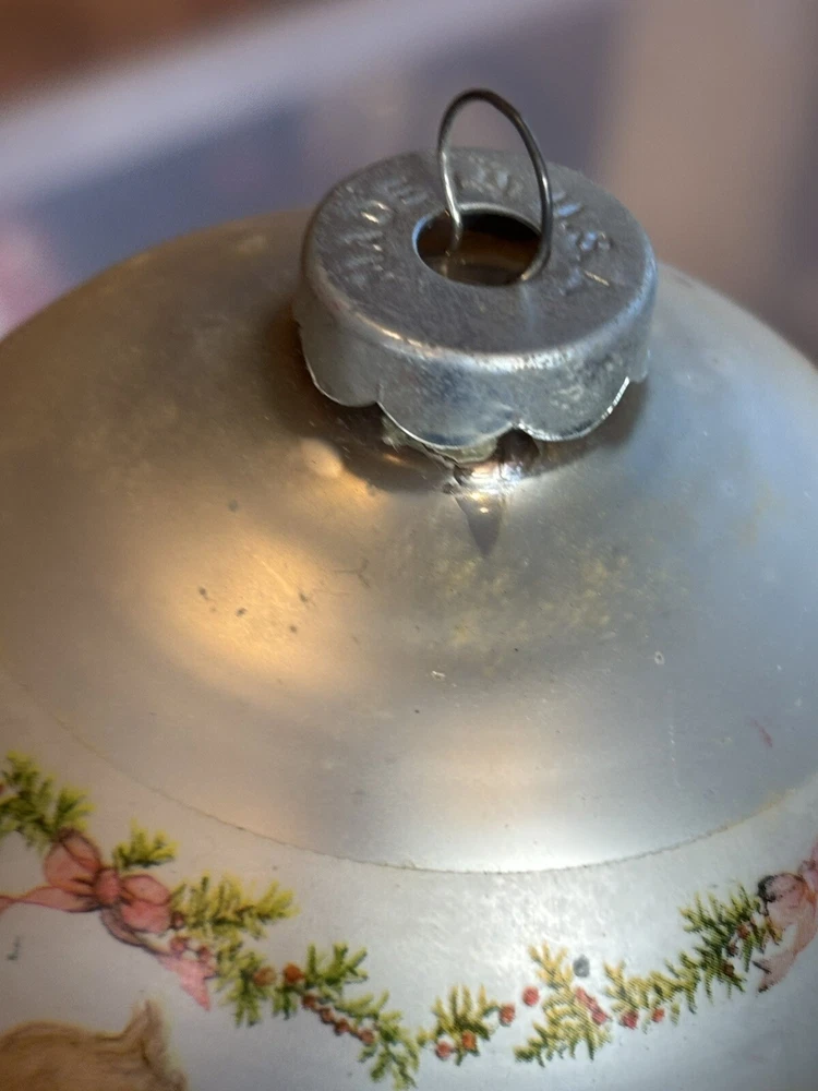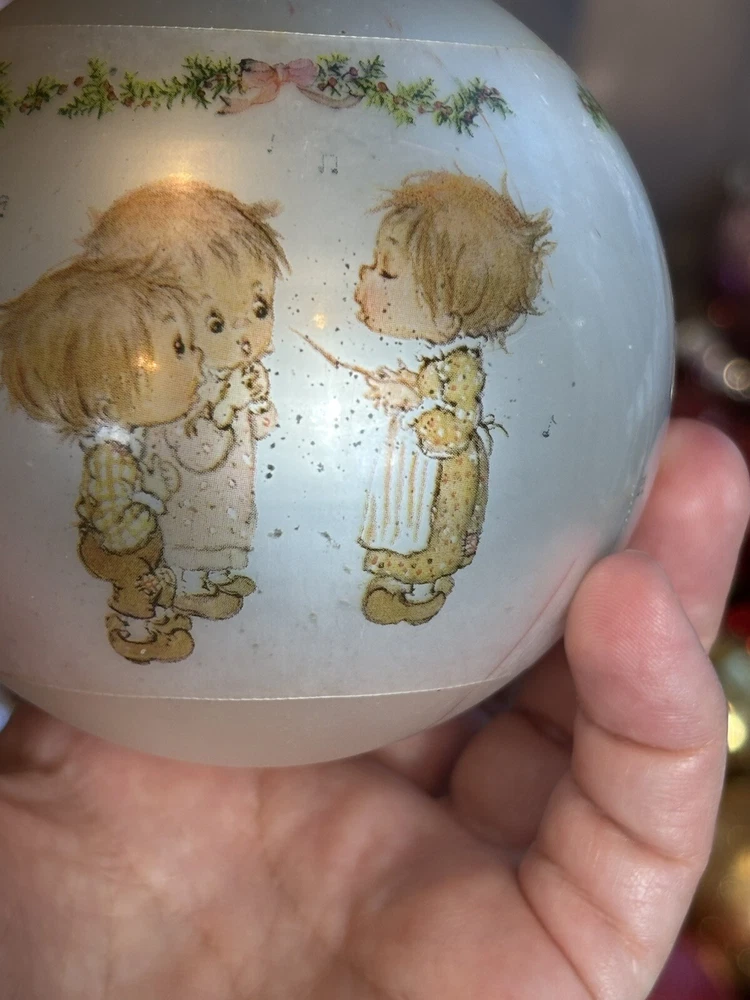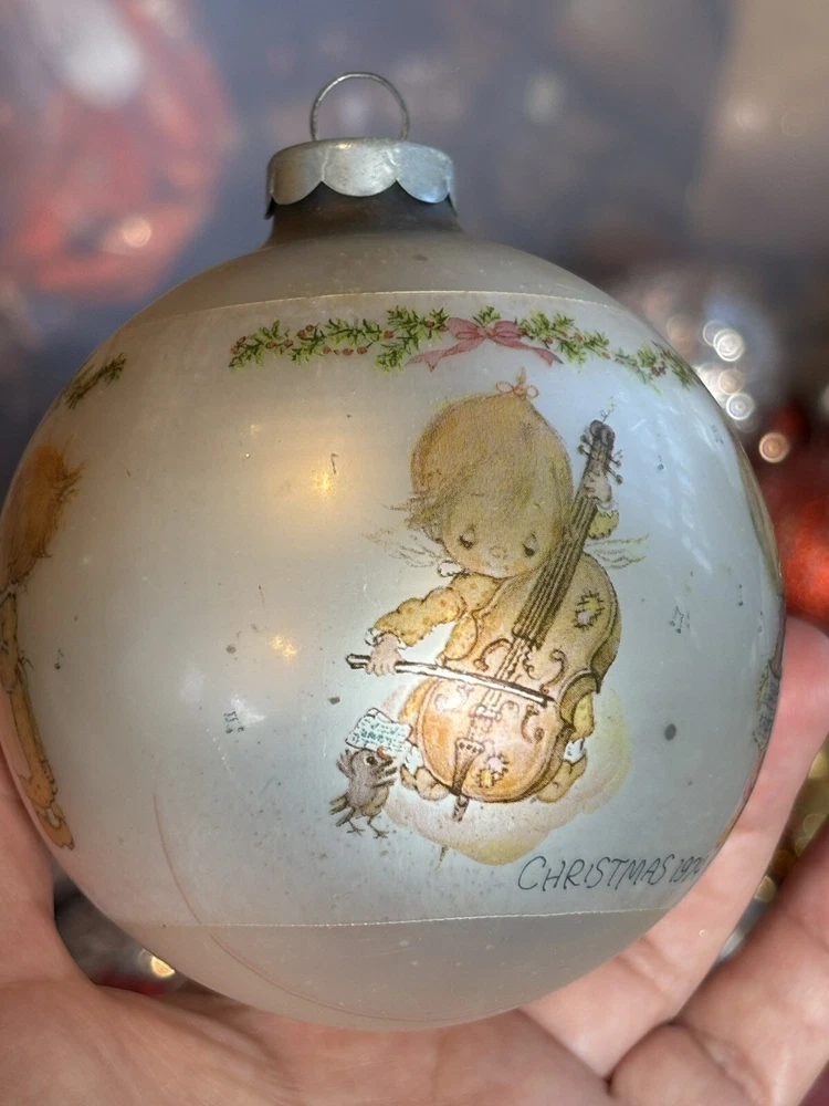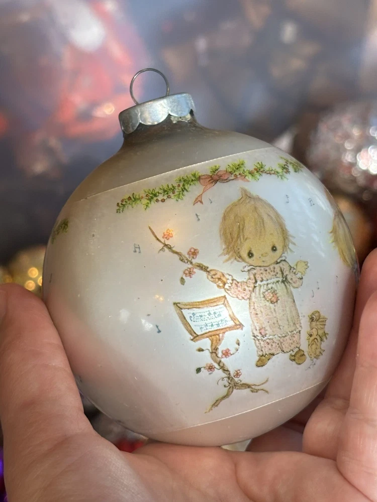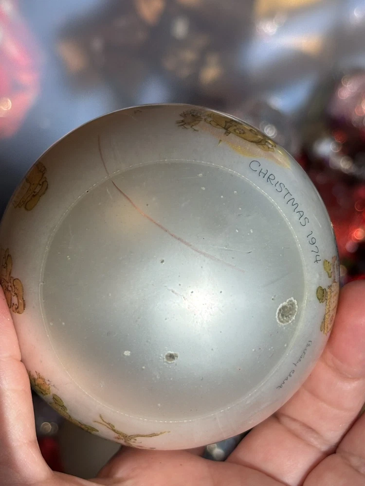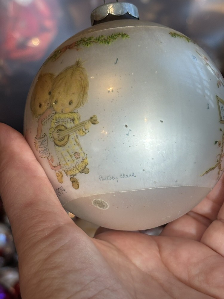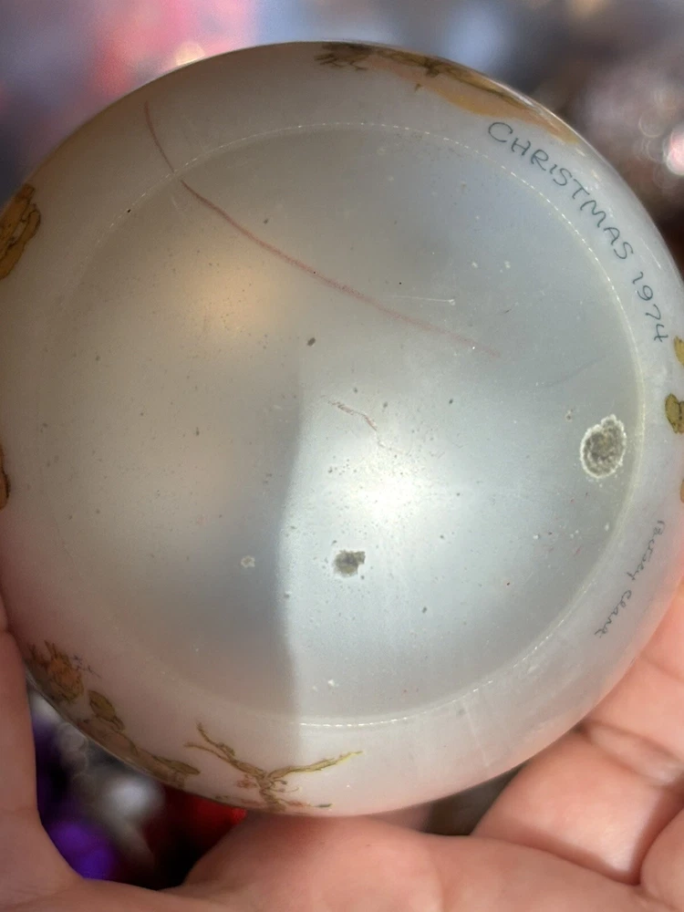 This is a vintage Hallmark Christmas Ball ornament from 1974 featuring a Mary Hamilton design. The ornament is round in shape, large in size, and made of glass. It is multicolored and depicts a character named Marie. This collectible item is part of the Hallmark Keepsake collection and has a Christmas theme. It is an original piece from the United States, perfect for a multipurpose recipient during the holiday season. Vintage pieces, over 50 years old. Normal scuffs, age discoloration