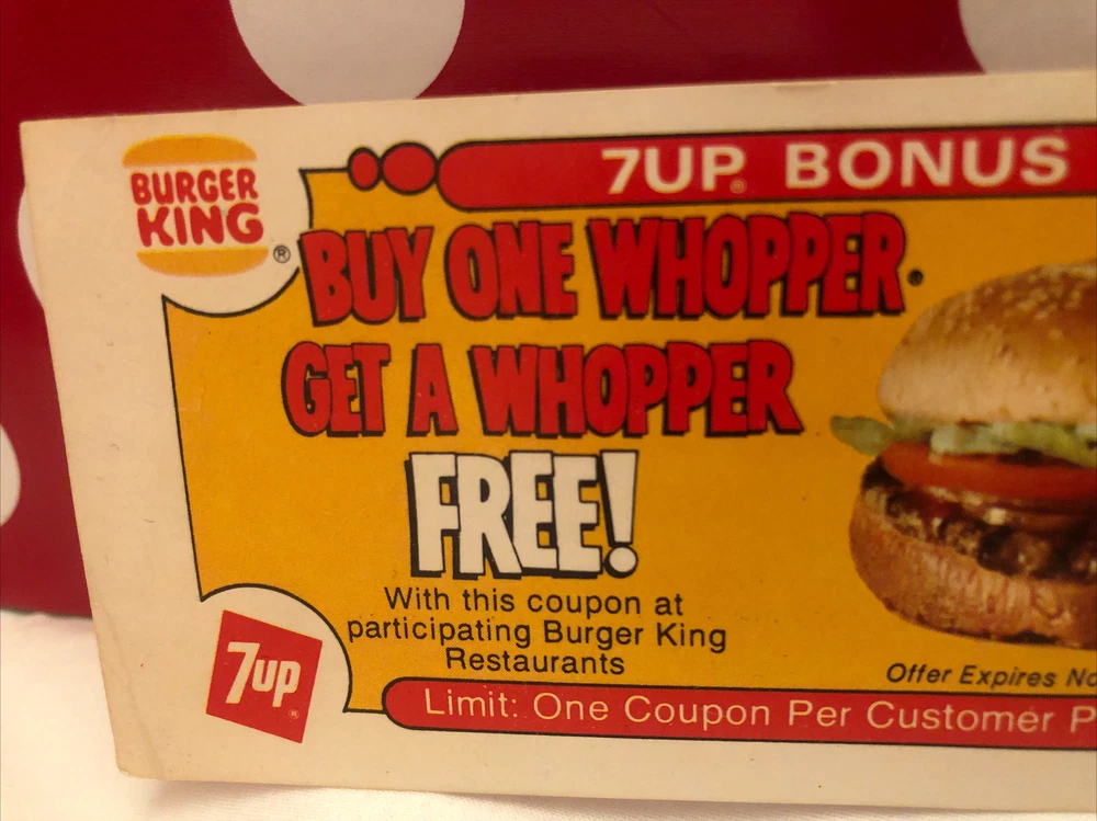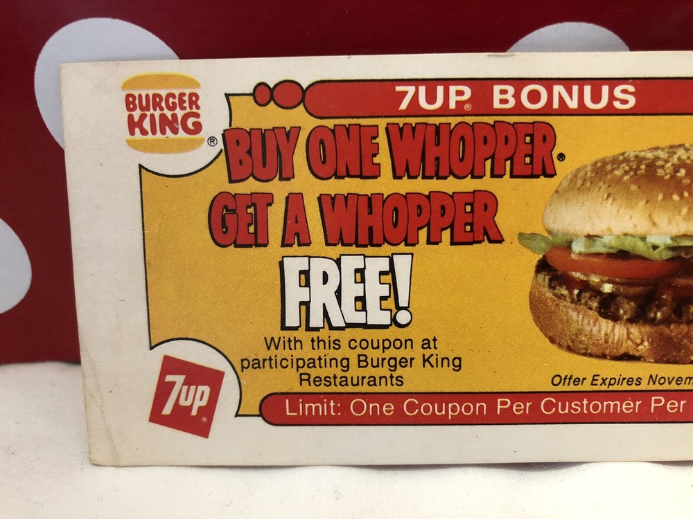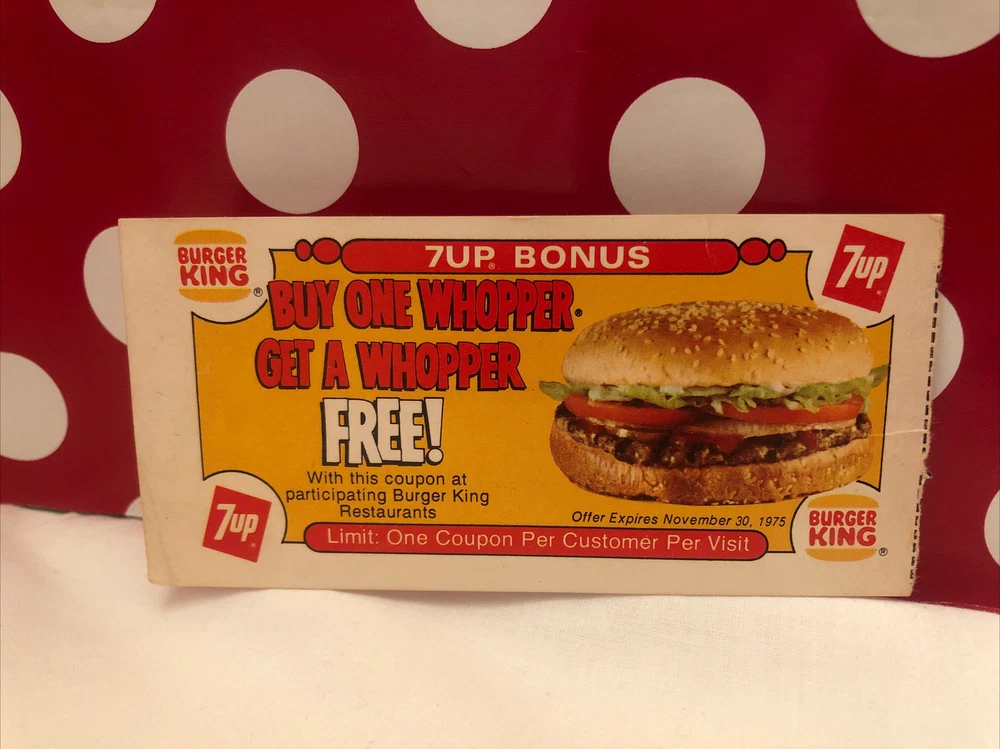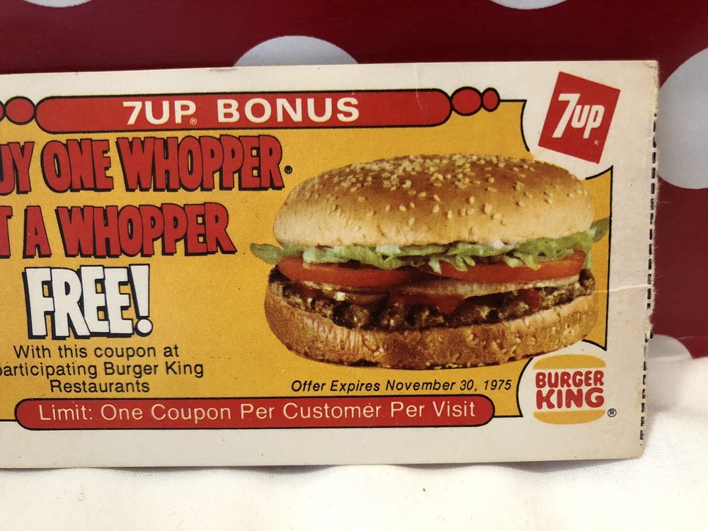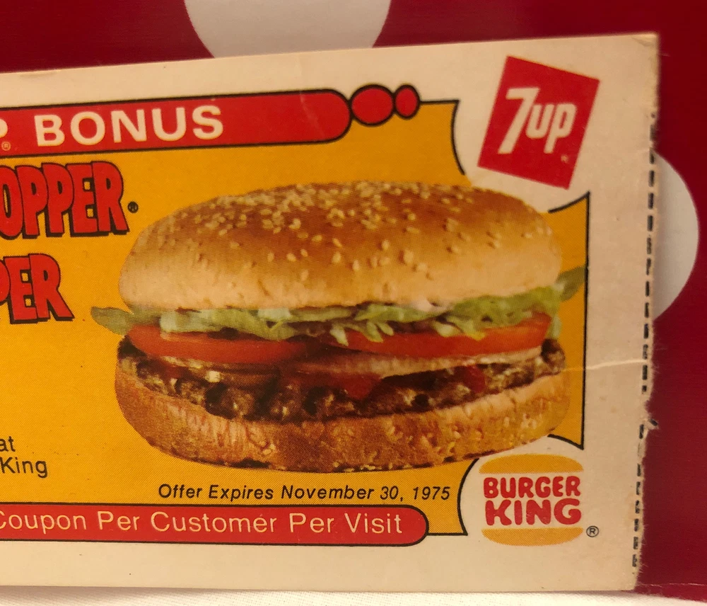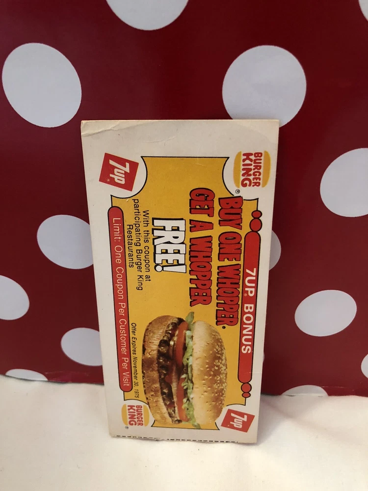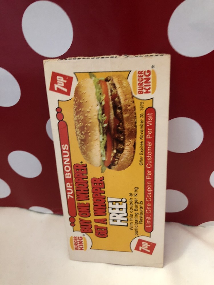 Very rare Vintage 1975 Burger King Restaurant Whopper 7-Up Coupon! It measures about 2 1/4 inches by a little over 4 1/2 inches. It’s a paper coupon! It’s in good condition with some light wear, as you can see in the pictures. Please see all the pictures for more details. This comes from our smoke-free, pet-free home. Thanks for looking!