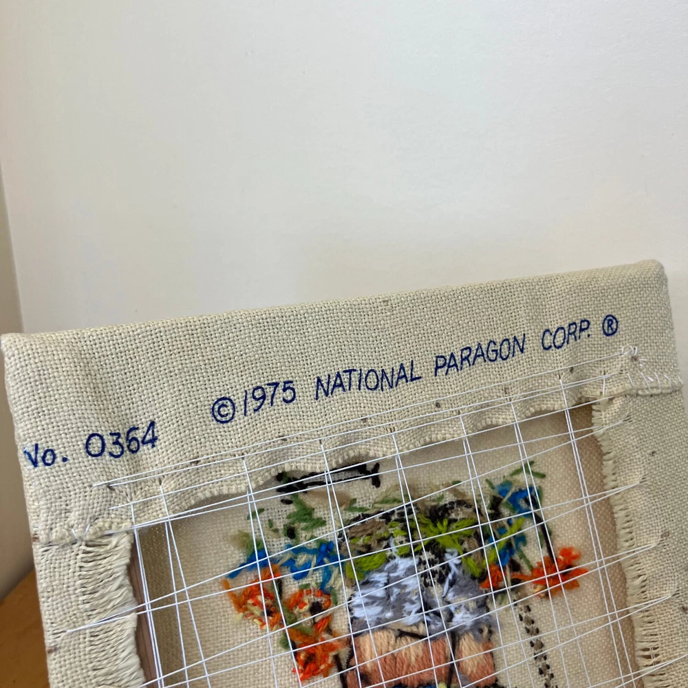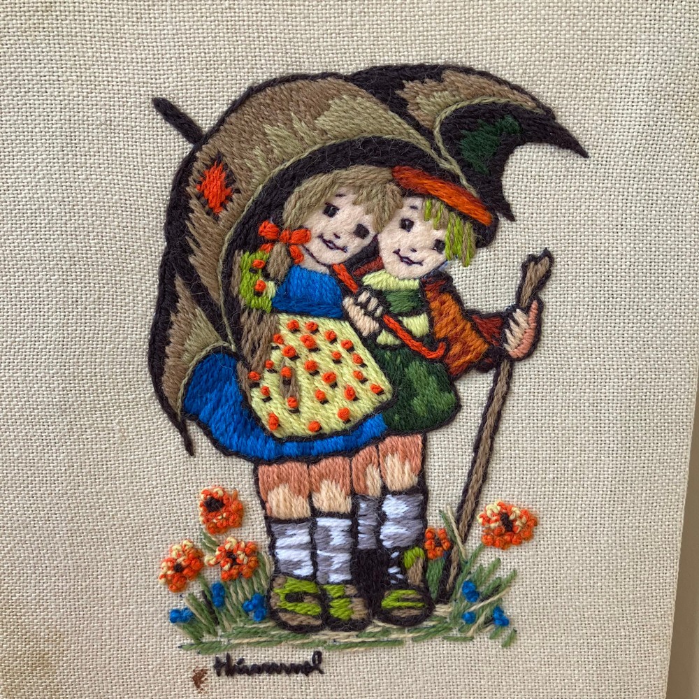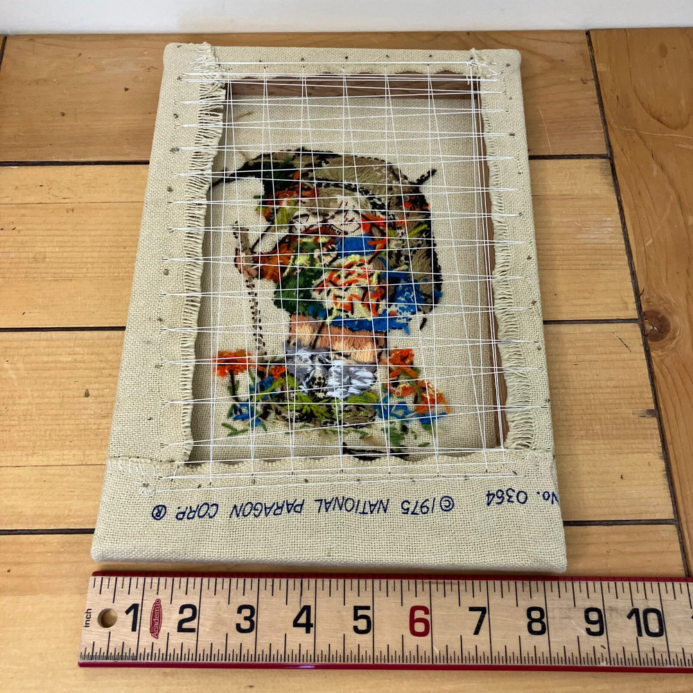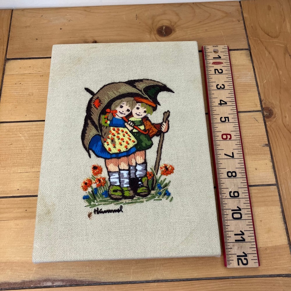 Completed crewel embroidery design Hummel's "Umbrella Children", made from Paragon Kit #0364 from 1975. Fabric is stretched & sewn over wooden frame as shown. Approx. 11 1/2" tall x 8 1/8" wide. Pre-owned condition: fabric has several marks/stains from age/storage. The pictures show the actual item that you will receive. Ships from Alberta, Canada. Tax applies to purchases.