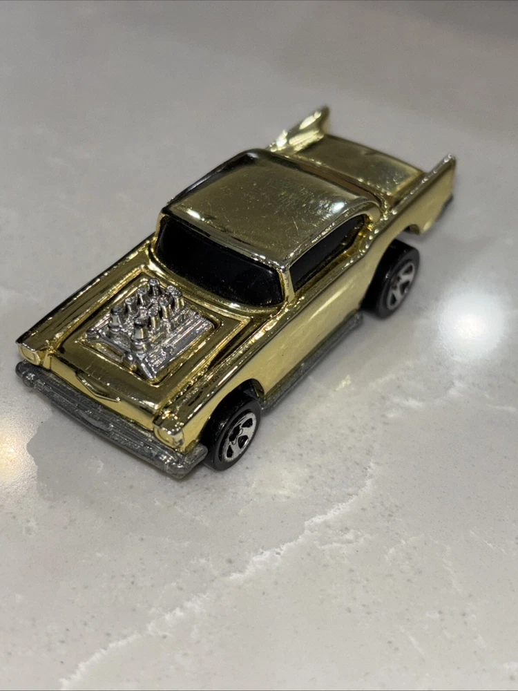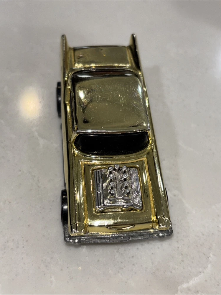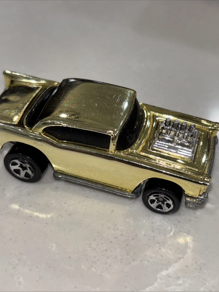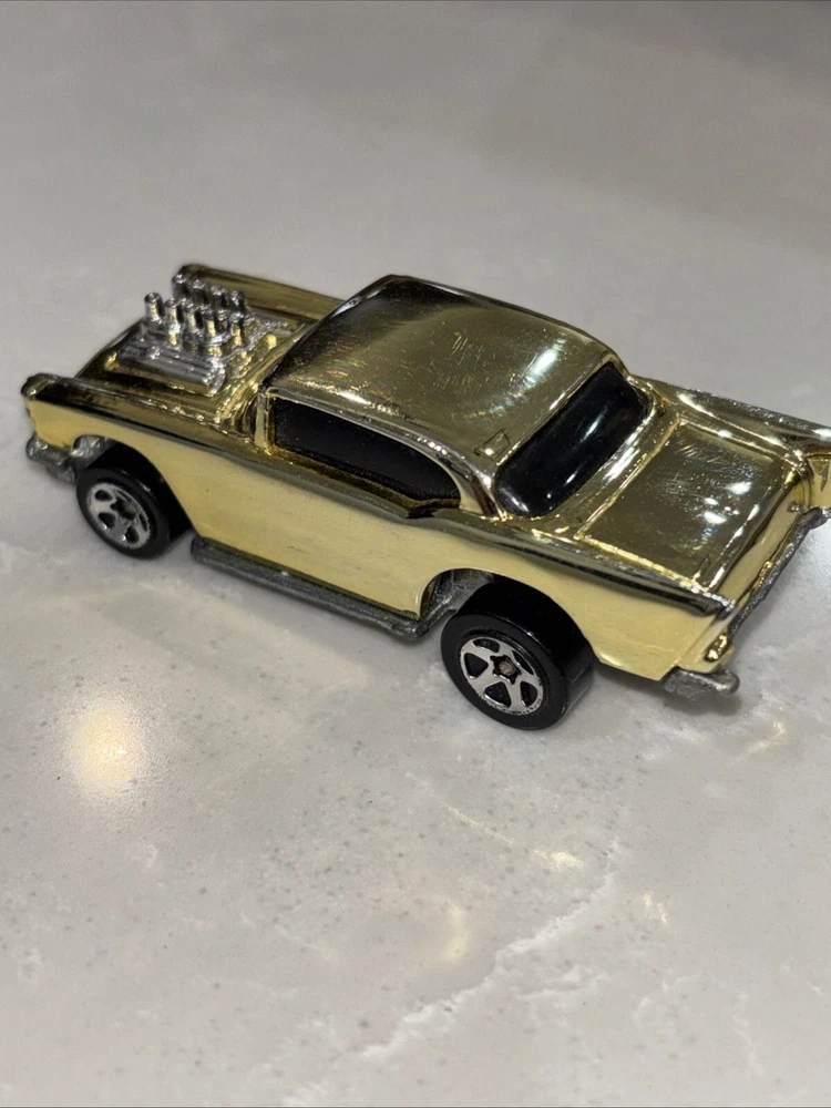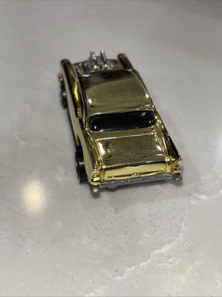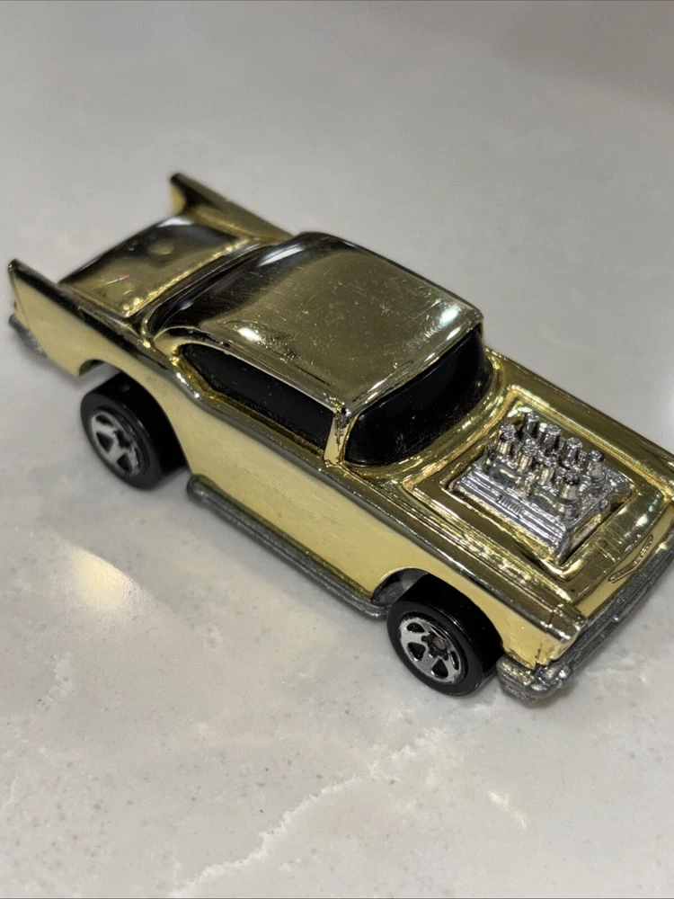 The vintage Hot Wheels car is a 1976 model of a 1957 Chevrolet, featuring a gold chrome body and chrome engine. It is part of the Chevy U92 series and is designed for both boys and girls who enjoy collecting toy cars. Manufactured in China, this classic diecast vehicle from Hot Wheels appeals to collectors of contemporary toy cars and vehicles with its unique design and retro aesthetic.