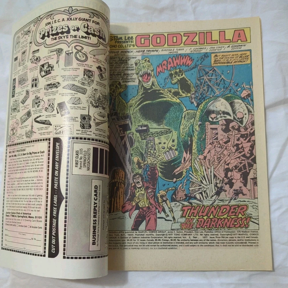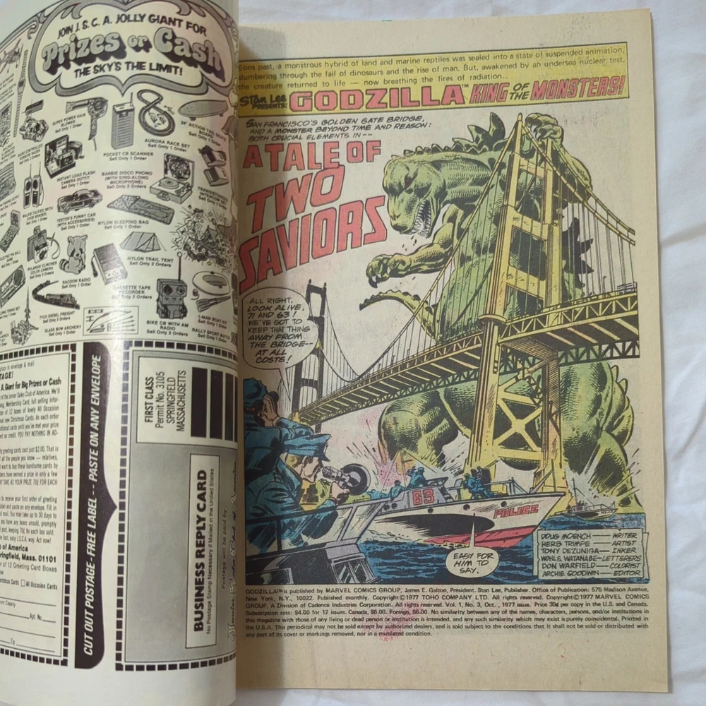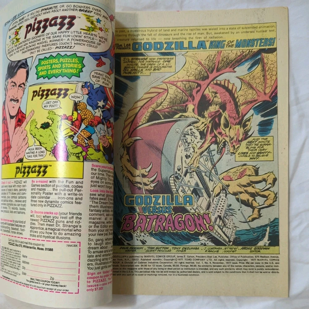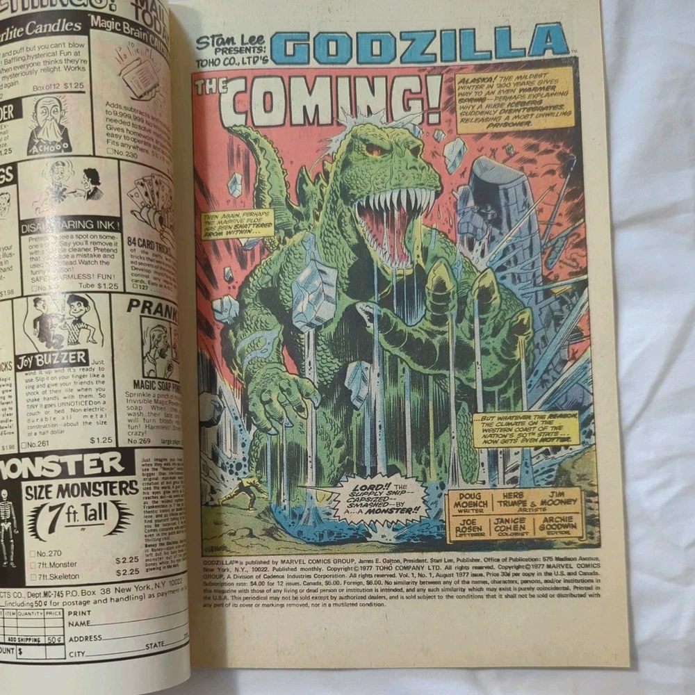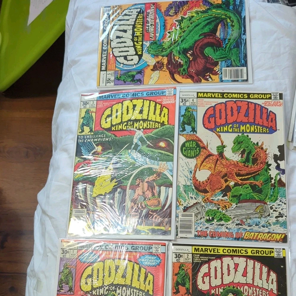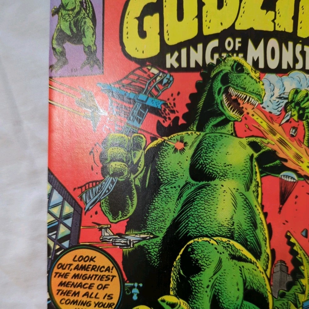 The product is a collection of four comic books titled "Godzilla King of the Monsters" # 1,2,3,4,5 published by Marvel Comics in 1977 during the Bronze Age era of US Comics. The series features the iconic character Godzilla, known for his monstrous abilities and legendary strength. The comics fall under the genre of Monster and are a must-have for fans of the Godzilla franchise and comic book collectors alike. NM++ +Original collector