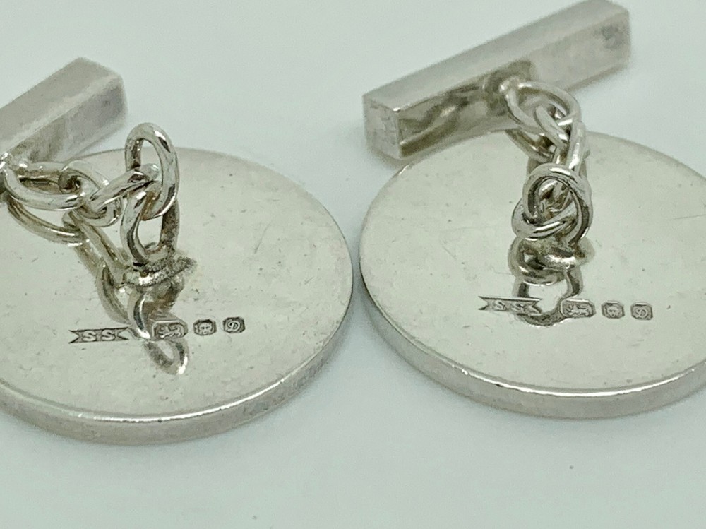 A superb pair of vintage (hallmarked for 1978) sterling silver cufflinks, the design reads Ste Pierre Smirnoff - this is what Smirnoff vodka was branded as in its early days. Probably produced to commemorate an anniversary, nice pieces of breweriana memorabilia. Nice quality weight. Maker/Markings: Marked with english hallmarks - SS, Lion Passant, Leopards Head, Date Letter D for 1978 Condition: Very Good Used Condition, general wear to the silver - Please look at photos Measurements: Face of Cufflink 20mm ~ 3/4" Weight: 14g Combined Shipping on all items SC5667-4 Vintage 1978 English Sterling Silver Ste Pierre Smirnoff (Vodka) Cufflinks