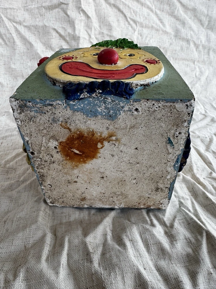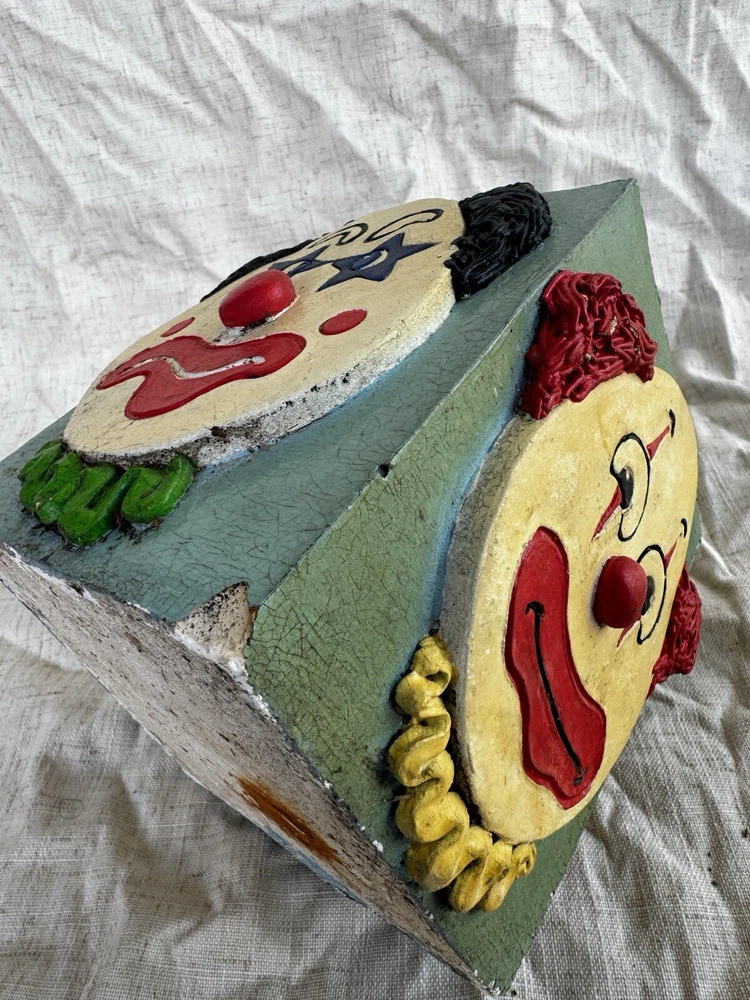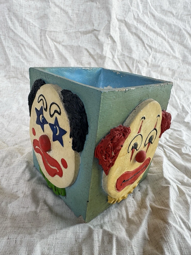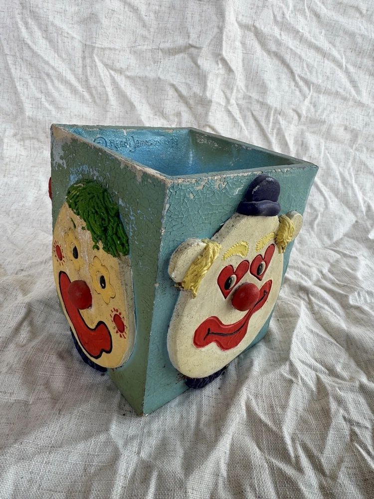 This vintage clown planter is a unique collectible from 1979, featuring a multicolor design with hand-painted details. Handmade and signed by Randi Jameson in the United States, this item is part of a clown-themed collection, perfect for all occasions. This original piece captures the whimsical theme of a circus, making it a charming addition for boys, girls, and adults alike who appreciate nostalgic decor from the 1970s. Please see all photos for details/imperfections.