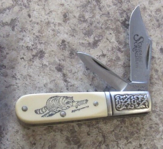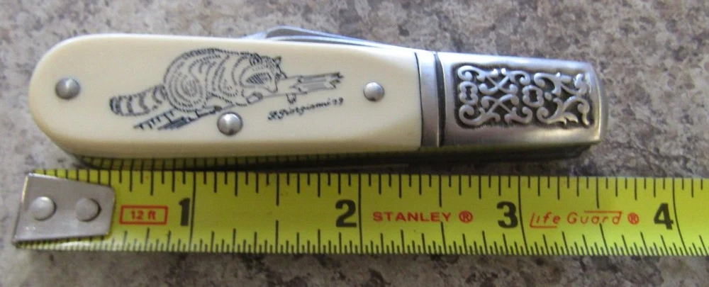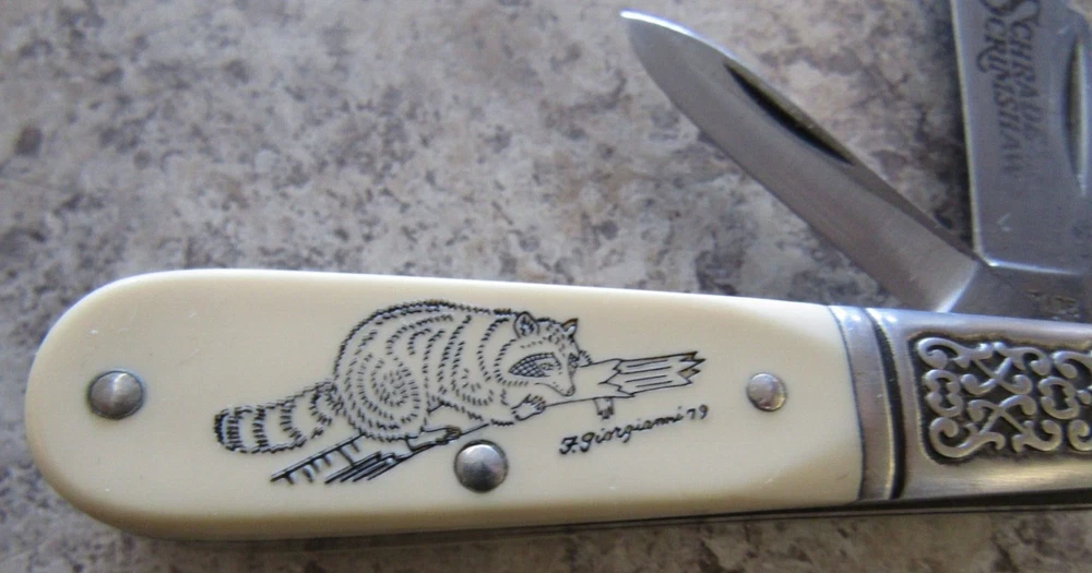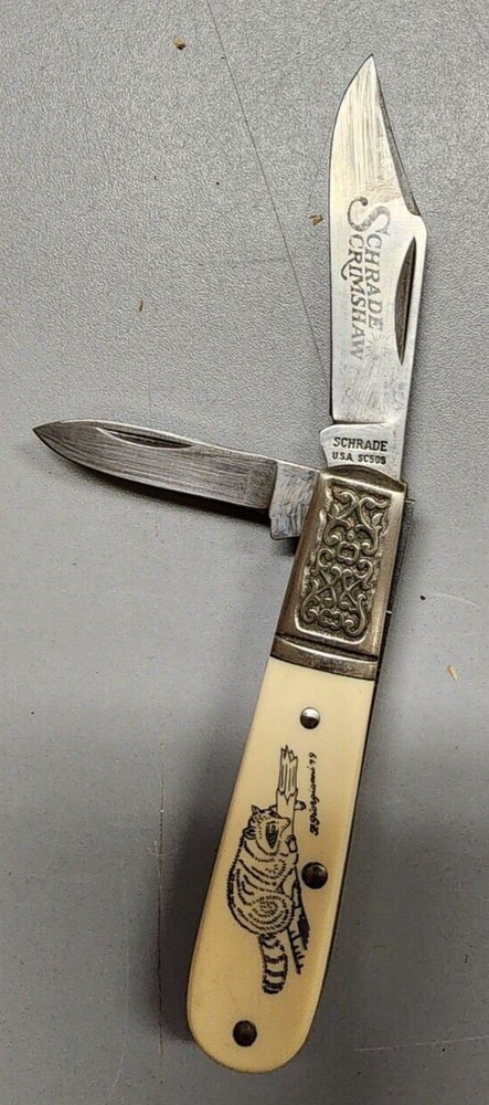 HomeVintage 1979 Schrade Scrimshaw Raccoon Barlow Knife SC506 USA Made with Sheath