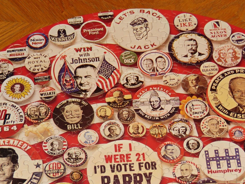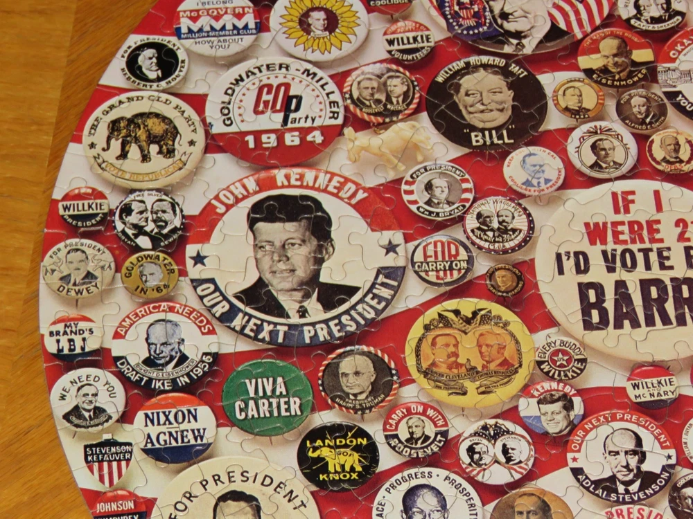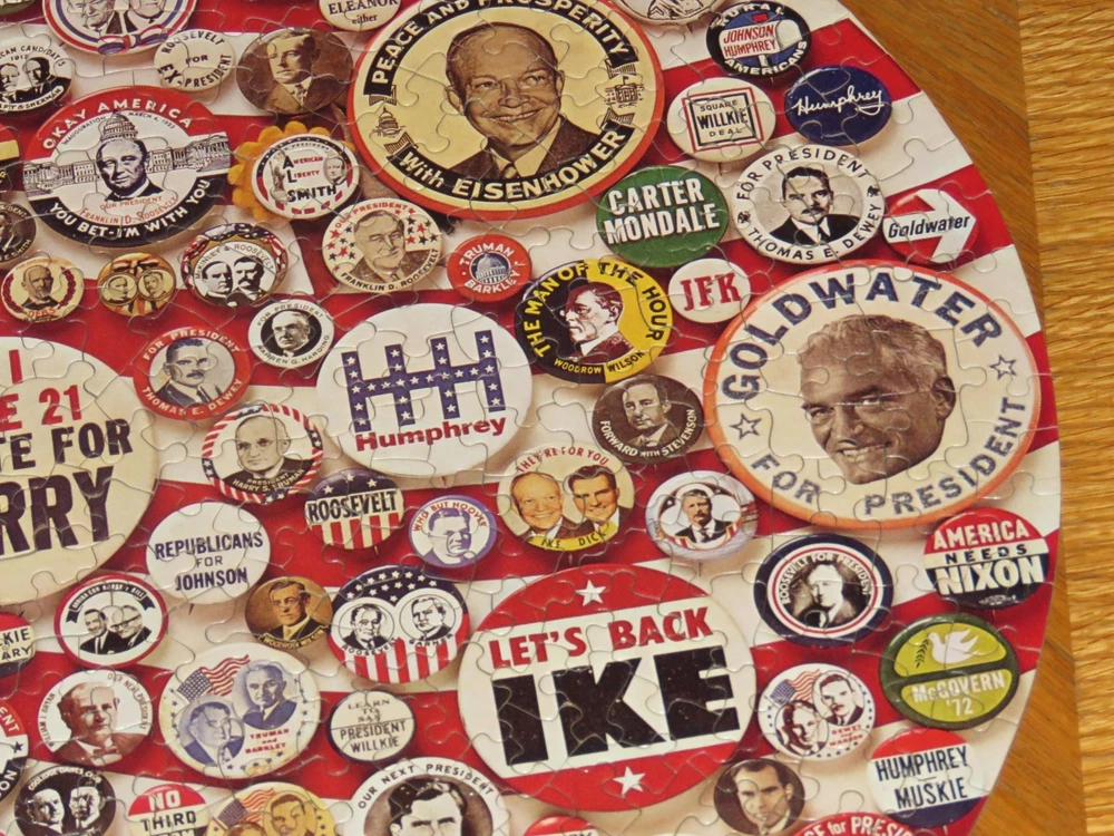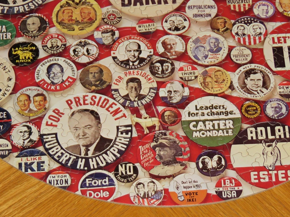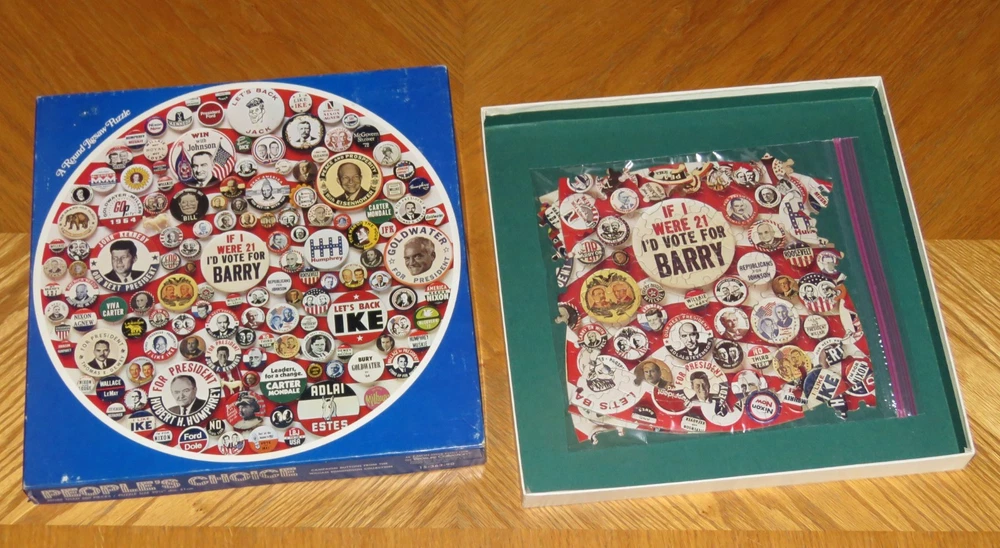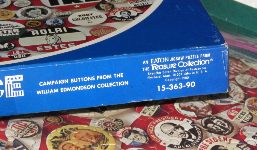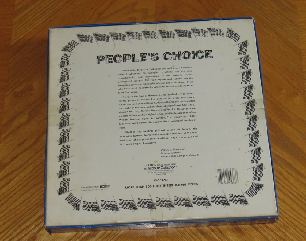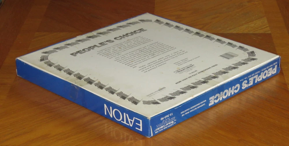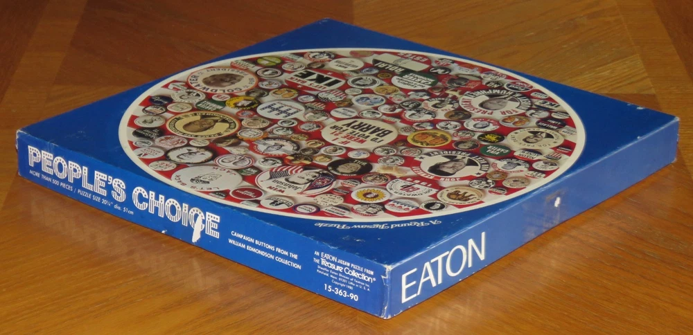 Vintage EATON Treasure Collection Puzzle - People's Choice Over 500 Pieces Finished Size: 20¼" Diameter Made in U.S.A. ©1980 Textron, Inc. Puzzle is complete and in excellent condition. Stored in a bag still assembled in sections. Puzzle is not glued and can be taken apart. Box has signs of age/ shelf wear, tape damage. Pictures are of the actual puzzle you will receive. Will be shipped in a box. Package weighs over 2 pounds.