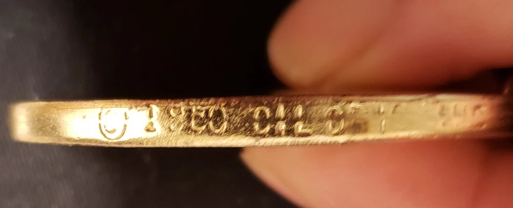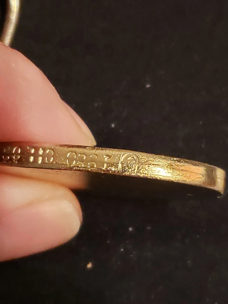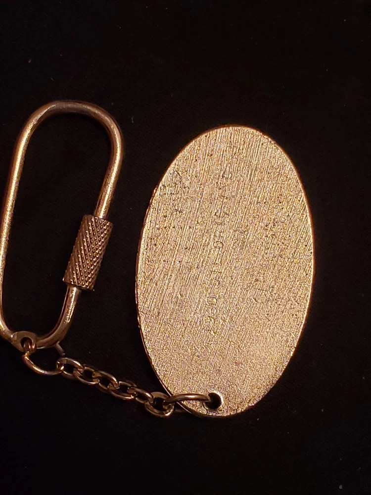 This vintage 1980 key chain features a gold color oil rig design with a detachable keyring and engraving. It is made of stainless steel and is part of the oil industry character family.