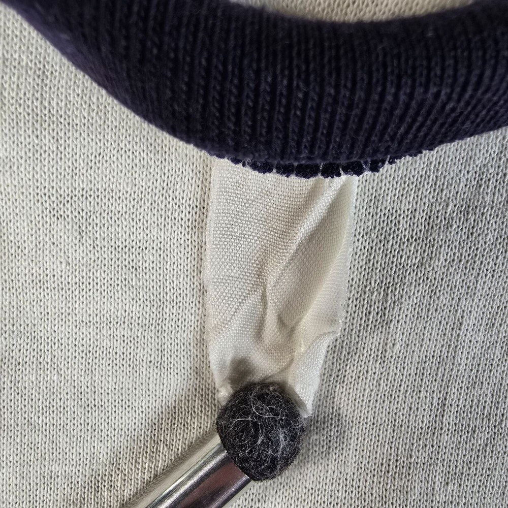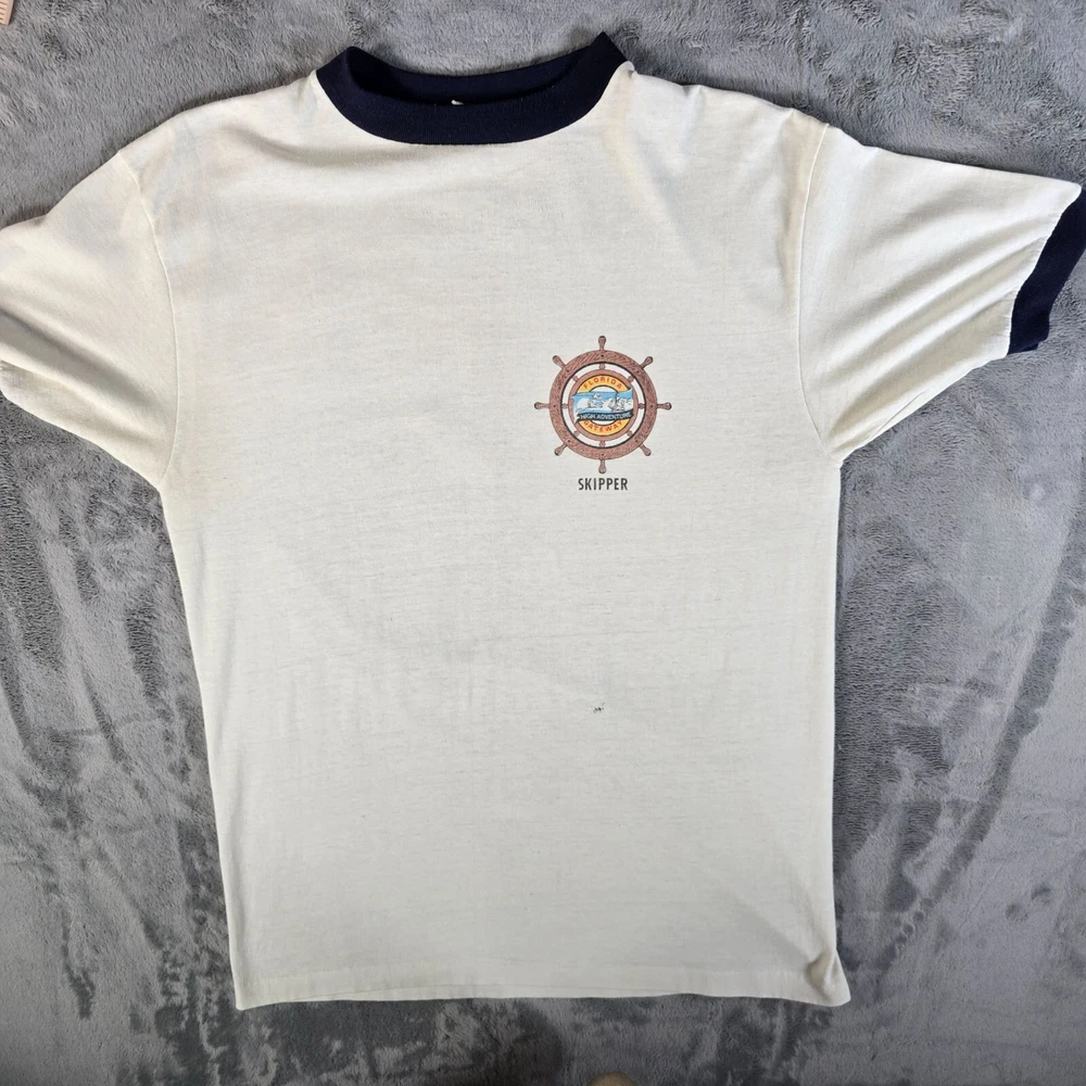 🔹 Item Details: Brand: Unknown (tag illegible) Material: Unknown (feels like cotton/poly blend) Color: White/Off-White/Cream with Navy Trim Decade of Manufacture: 1980s (1980 or 1981- see research notes) Country of Manufacture: Unkown (almost certainly USA) Notable Features: Single Stitch Hem, Ringer Cuffs and Collar Research Notes: The Florida Gateway Highway Adventure Base was opened by the Boy Scouts of America in 1980. It was only called the Gateway High Adventure Base for two years before the name was changed to Florida High Adventure Sea Base. It's now known as just "Sea Base." 🔹 Condition Notes: Good used vintage condition. Tag illegible. Visible dark marks/staining on front of shirt beneath logo. Marking/staining on back of shirt at left side of bottom hem. Light to moderate fabric wear throughout. See photos. 🔹 Size Notes: Vintage Tag Size: Unknown Modern Measured Size: Medium (39) 🔹 Measurements (Approximate): Chest (pit to pit): 39 inches Collar to Hem: 27 inches 🔹 Shipping & Returns: Ships worldwide from Lexington, KY. Ships within 3 business days of purchase. Returns accepted within 60 days for domestic orders and 30 days for international orders.