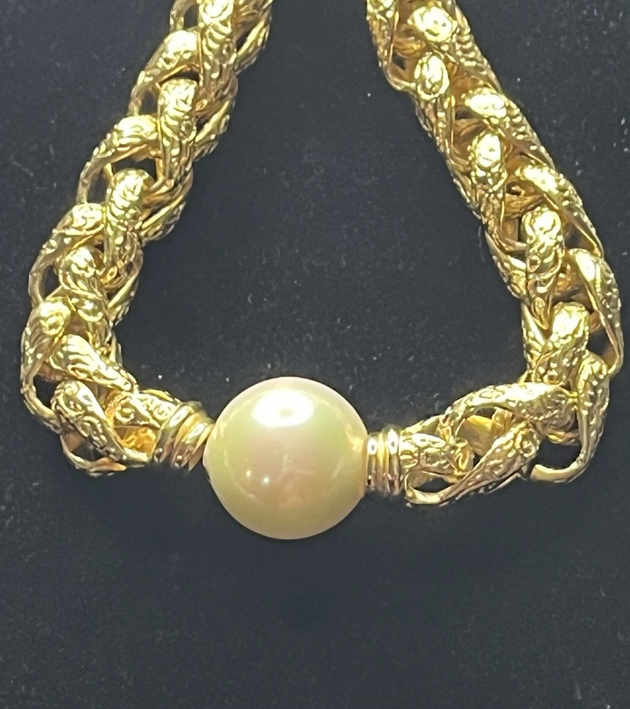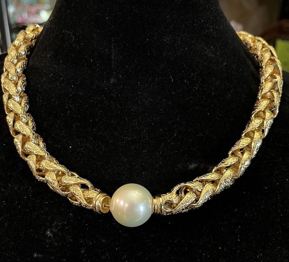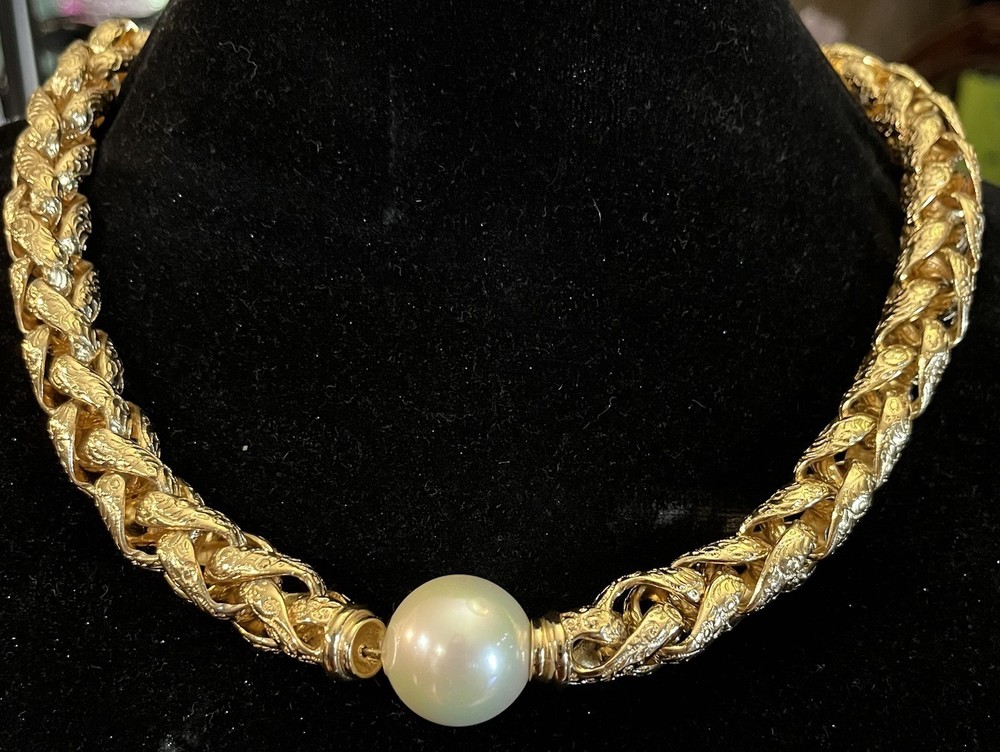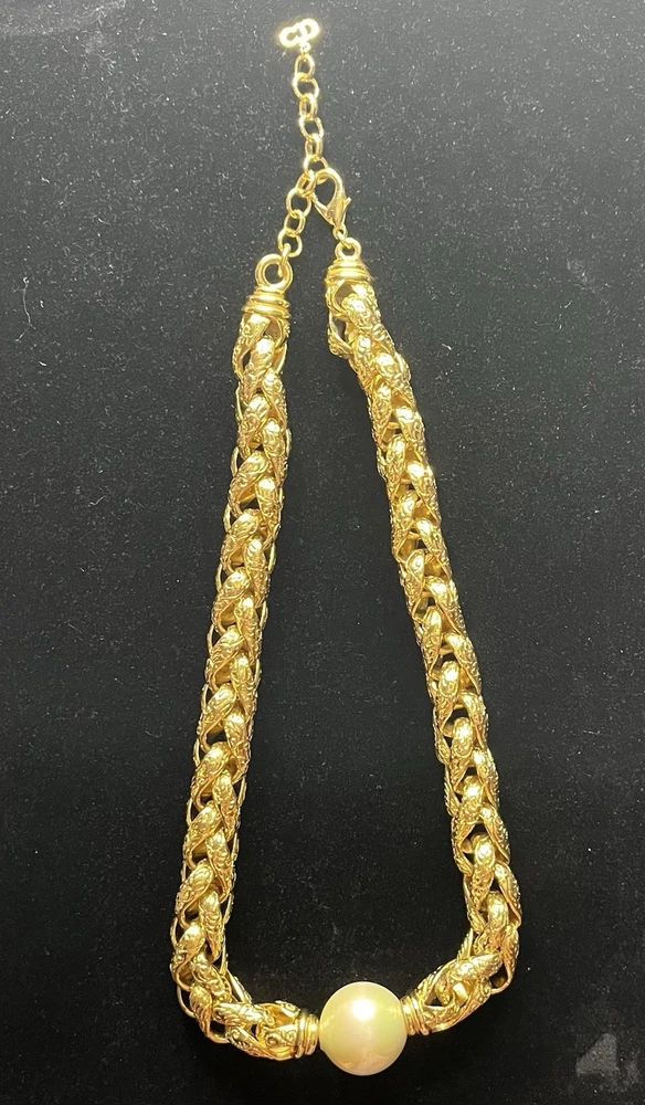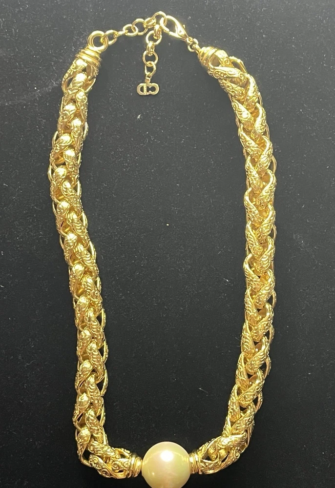 -up for sale is a Christian Dior , heavy braided chain with intricate design on chain, so pearl, large statement necklace -necklace measures 16 to 18 inch for wearing and a total of 20 1/2 inches in length -necklace has a lobster claw closure and has logo for Christian Dior hanging on the necklace -picture show size of pearl in millimeters and thickness of necklace can be worn for many different occasions from elegant to wearing jeans and a nice T-shirt -please look at all pictures for clarity, condition, which is good, design, etc.