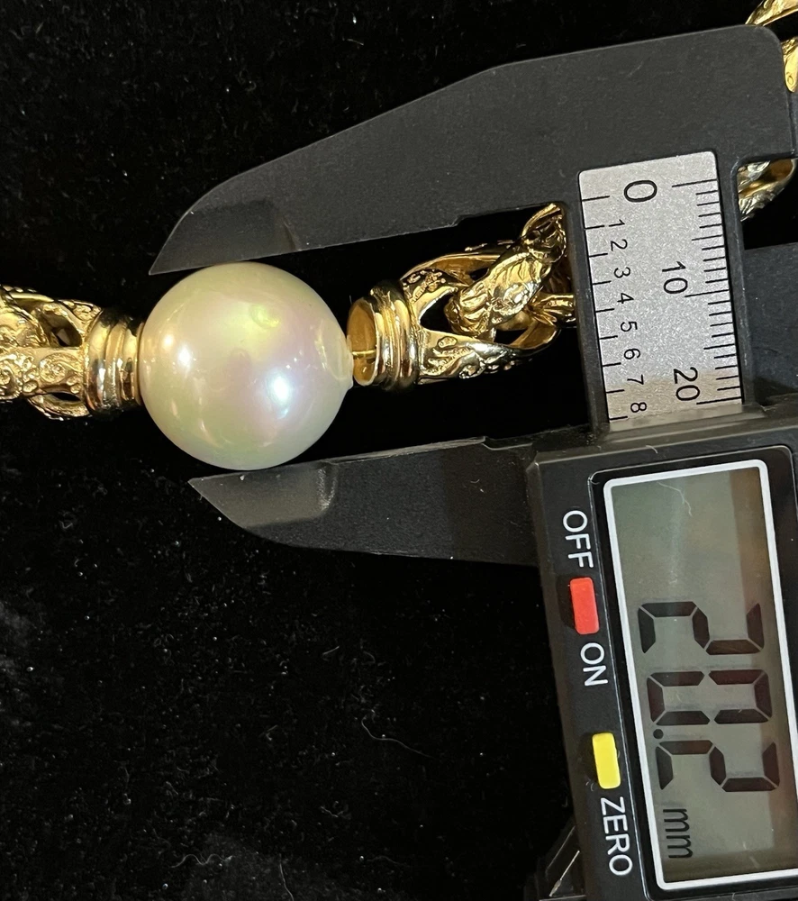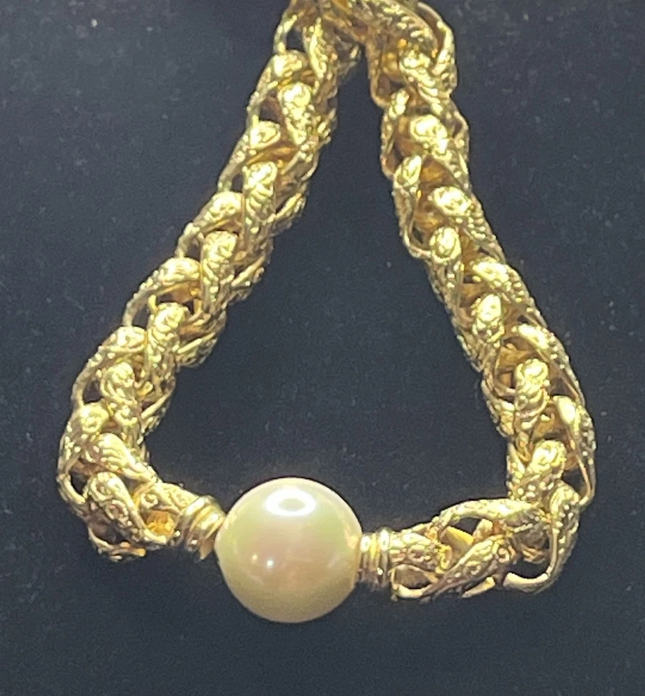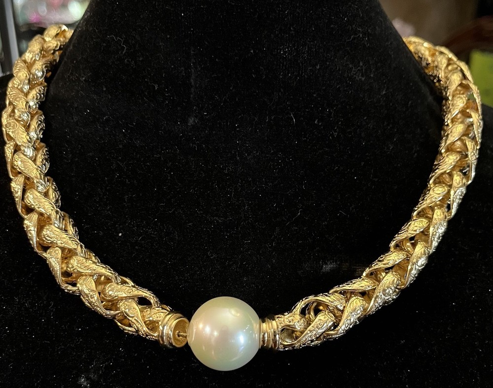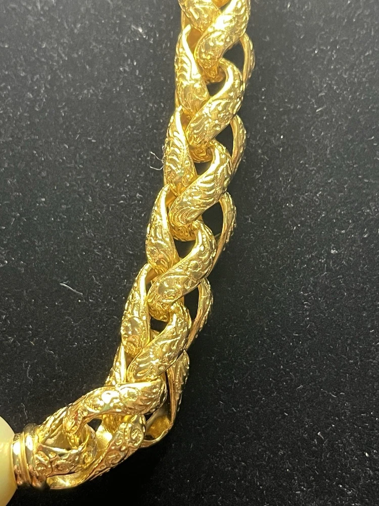 -up for sale is a Christian Dior , heavy braided chain with intricate design on chain, so pearl, large statement necklace -necklace measures 16 to 18 inch for wearing and a total of 20 1/2 inches in length -necklace has a lobster claw closure and has logo for Christian Dior hanging on the necklace -picture show size of pearl in millimeters and thickness of necklace can be worn for many different occasions from elegant to wearing jeans and a nice T-shirt -please look at all pictures for clarity, condition, which is good, design, etc.