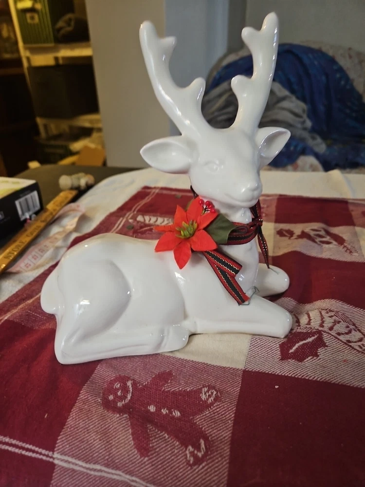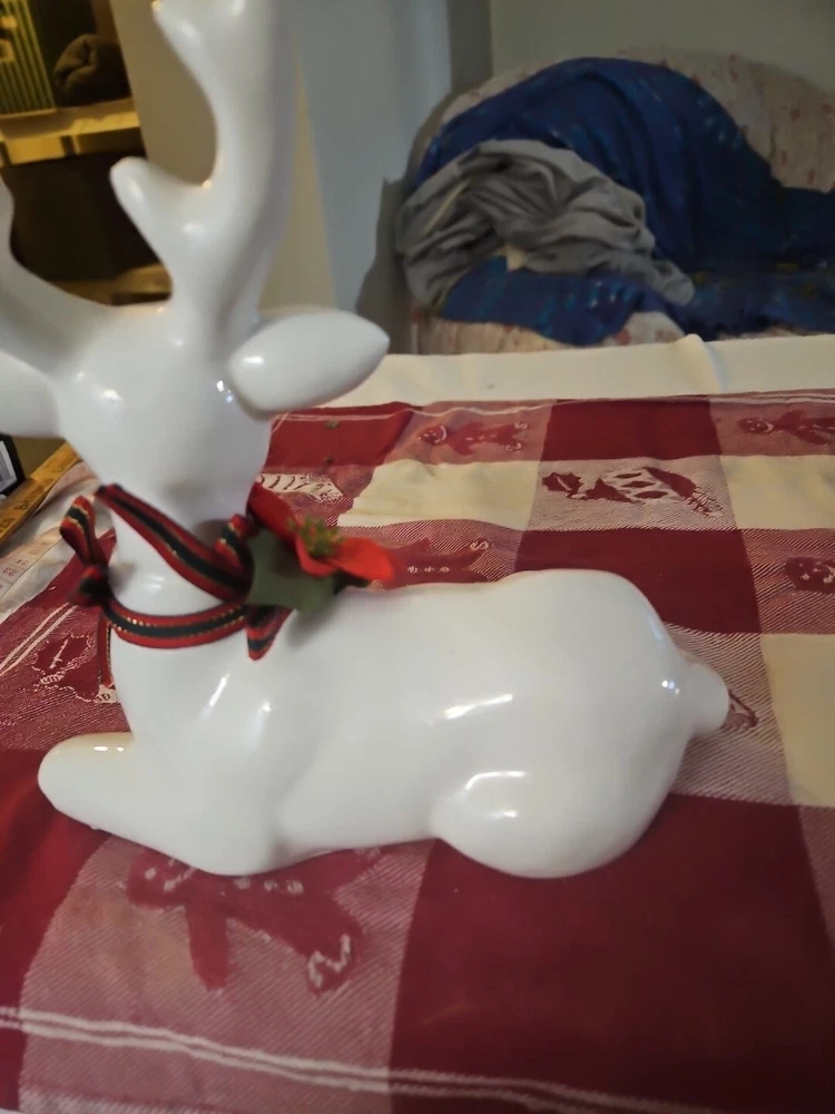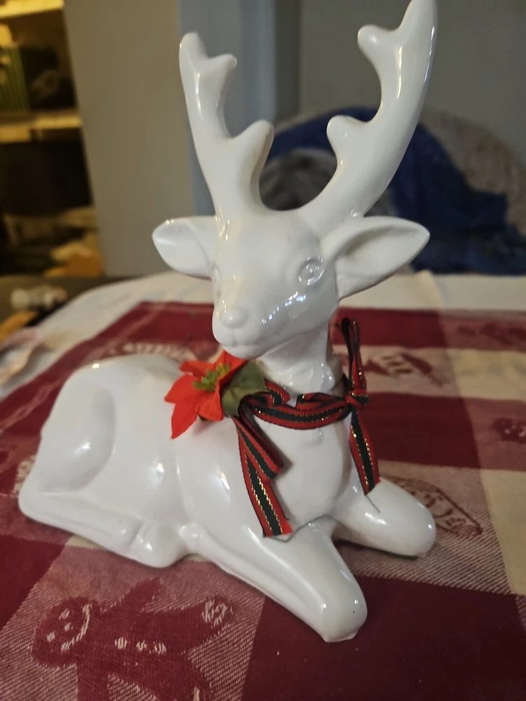 This charming ceramic deer figurine exudes holiday spirit with its festive plaid bow and tiny bells. Crafted by HomeCo, it captures the essence of a peaceful winter scene. Adorned with intricate details, this figurine makes for a delightful addition to any holiday display, evoking memories of past celebrations and cozy winter nights. Fun vintage Christmas reindeer for your holiday decor. Measures 8" tall x 7" wide. Has Made in Taiwan sticker on bottom.i • Ceramic material • Festive plaid bow with bells • Vintage holiday decor • Detailed design