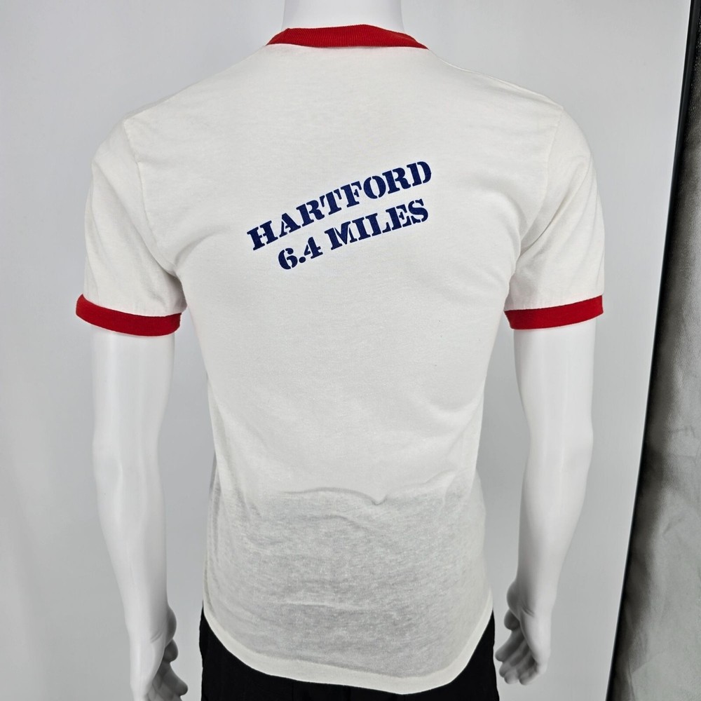 🔹 Item Details: Brand: Unknown (Tag illegible) Material: Unknown (feels like cotton/poly blend) Color: White and Red Decade of Manufacture: Early 1980s (chance of late 1970s- likely range is 1979-1982) Country of Manufacture: Unknown (almost certainly USA) Notable Features: Ringer collar and cuffs, single stitch hem Front Text: Dannon Road Runners Club Series RRCA Road Runners Club of America Back Text: Hartford 6.4 miles 🔹 Condition Notes: Good used vintage condition. Tag illegible. A few ink spots on front lower hem of t-shirt. Light to moderate fabric wear throughout. See photos for details. 🔹 Size Notes: Vintage Tag Size: Unknown Modern Measured Size: Small (34.5) 🔹 Measurements (Approximate): Chest (pit to pit): 34.5 inches Collar to Hem: 25.5 inches 🔹 Shipping & Returns: Ships worldwide from Lexington, KY. Ships within 3 business days of purchase. Returns accepted within 60 days for domestic orders and 30 days for international orders.