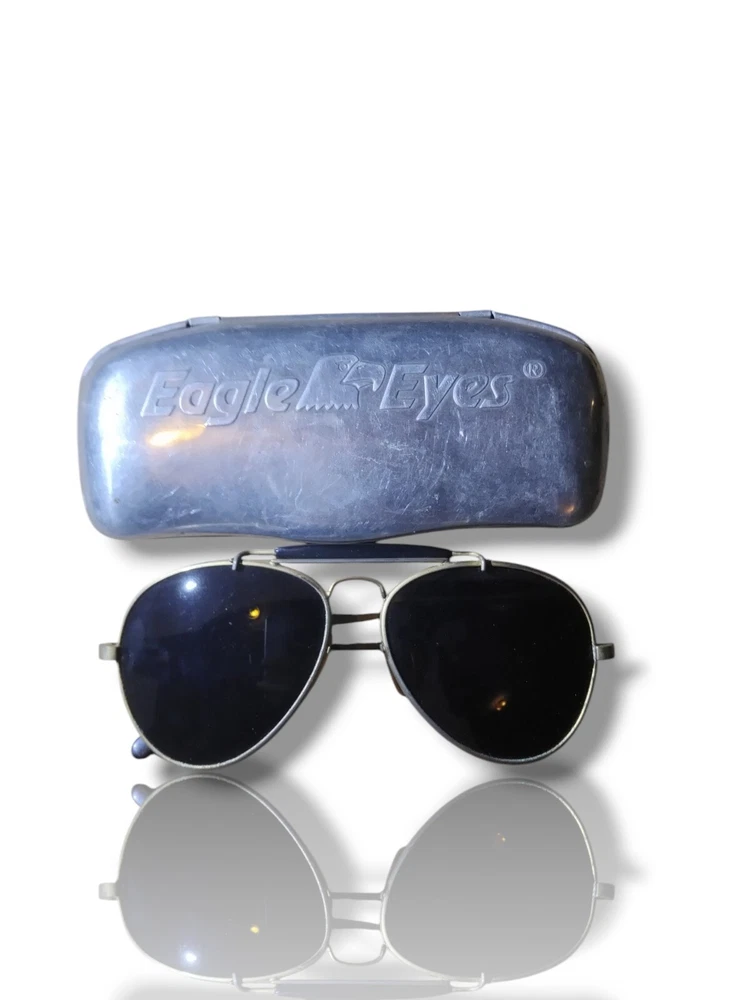 Vintage Eagle Eyes Aviator Sunglasses feature a solid gold metal frame with black glass lenses. These classic sunglasses are designed for unisex adults and have a vintage style. They are water-resistant and made in Korea. Perfect for those who appreciate a timeless aviator design with a touch of nostalgia.