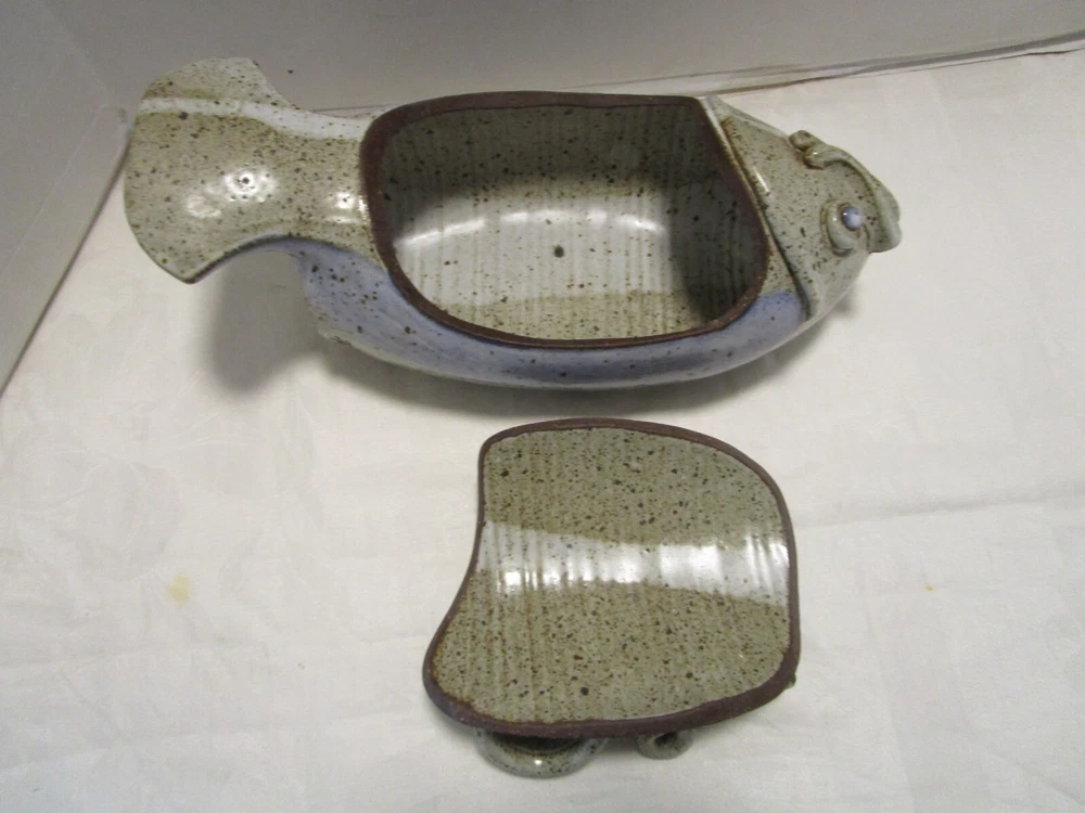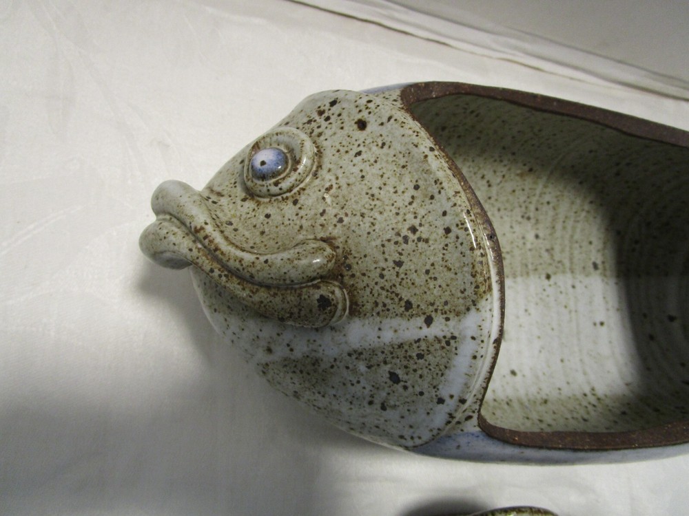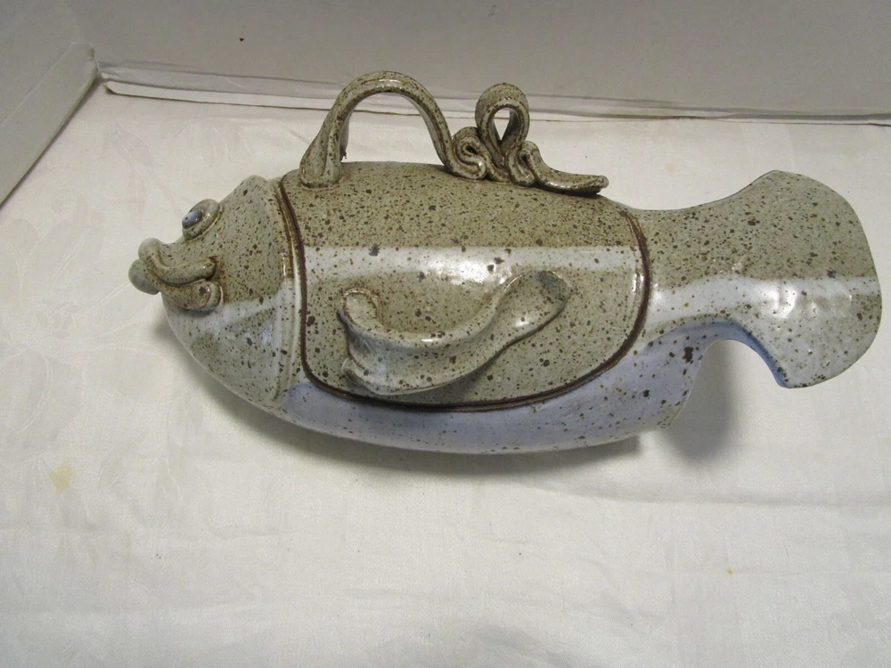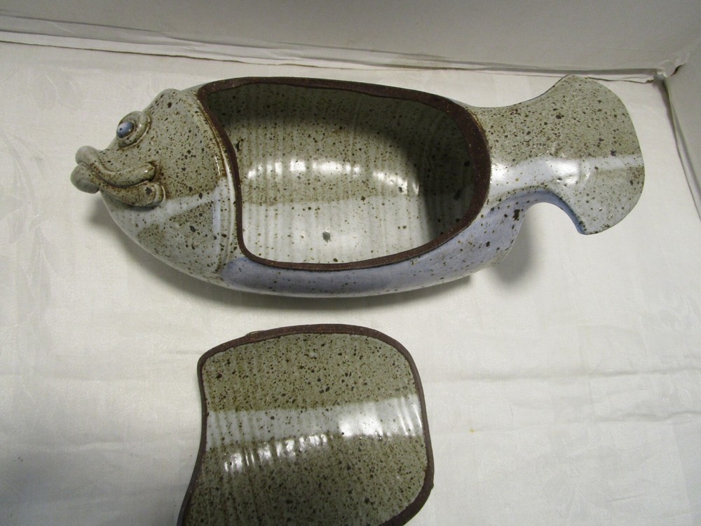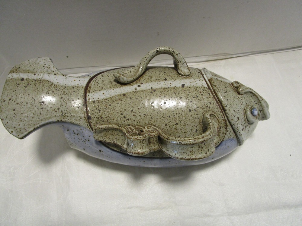 Description: 8/17/11/10 Book # 1698 Vintage Signed Studio Glazed Art Pottery Bowl Pot Lidded Fish shaped. Signed, I cannot read it- see last picture. Unique One of a Kind Versatile Multipurpose Nautical Coastal Lodge Cabin Beach House décor. Spectacular Coloration Inside and Out. Probably made in the 1980’s. Vintage by definition, is any item between 20 and 100 years old. Antique is any item 100 years old or more. It is 13” wide x 5.25” tall with lid on x 6” deep. It holds 1.50 quarts or 48 Oz. brim full. Unboxed it is 4 lbs. Excellent Vintage Condition- No Chips or cracks. Signed by the maker- see last picture. Zoom and view all pictures as they are part of the description. I DO MY BEST TO DESCRIBE EVERY LISTING BUT I AM NOT AN EXPERT AND ITEMS ARE SOLD “AS IS”. My idea of great/good may be different than yours, so EXAMINE PHOTOS CAREFULLY since they are binding and a supplement to the word description in case, I should miss something. If I fail to mention something, it does not qualify as “item not as described” if it shows in my pictures. EACH PHOTO IS WORTH A THOUSAND WORDS AND THEY ARE OF THE EXACT ITEM YOU WILL RECEIVE. RETURN POLICY: Returns are acceptable ONLY if the item doesn’t match the description, is defective, or grossly misrepresented. THIS MEANS I DO NOT ACCEPT RETURNS for FIT, SIZING, COLOR ISSUES, OR BUYER'S REMORSE. Please zoom and view ALL pictures for more details as they are part of the description. Email me with any questions you may have. Please note: Buyer pays ALL return shipping and fees. Postage fully tracked. FEEDBACK: I do not leave feedback until the end of a transaction. Transaction is considered over once I receive feedback from you confirming that you have received it and expressed satisfaction with it. If you are unsatisfied with your purchase, please contact me before leaving a neutral or negative feedback- so I can fix the issues.