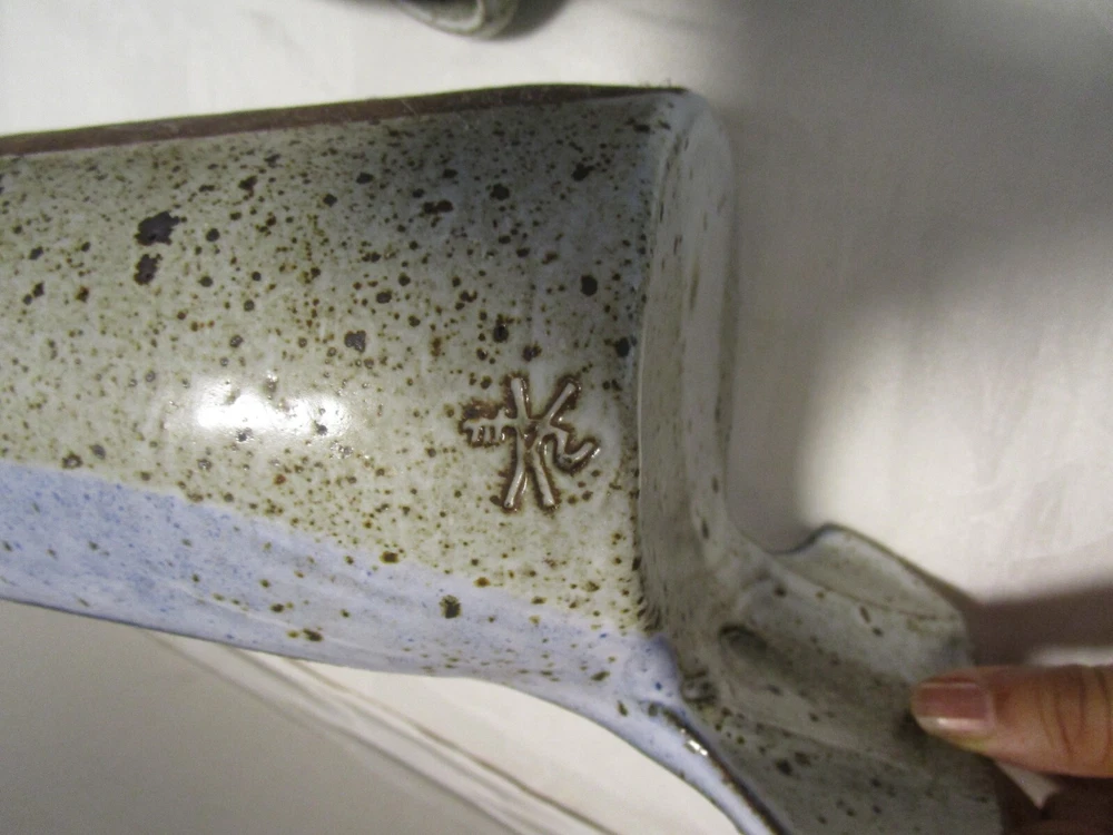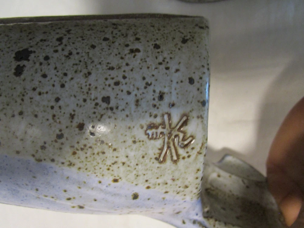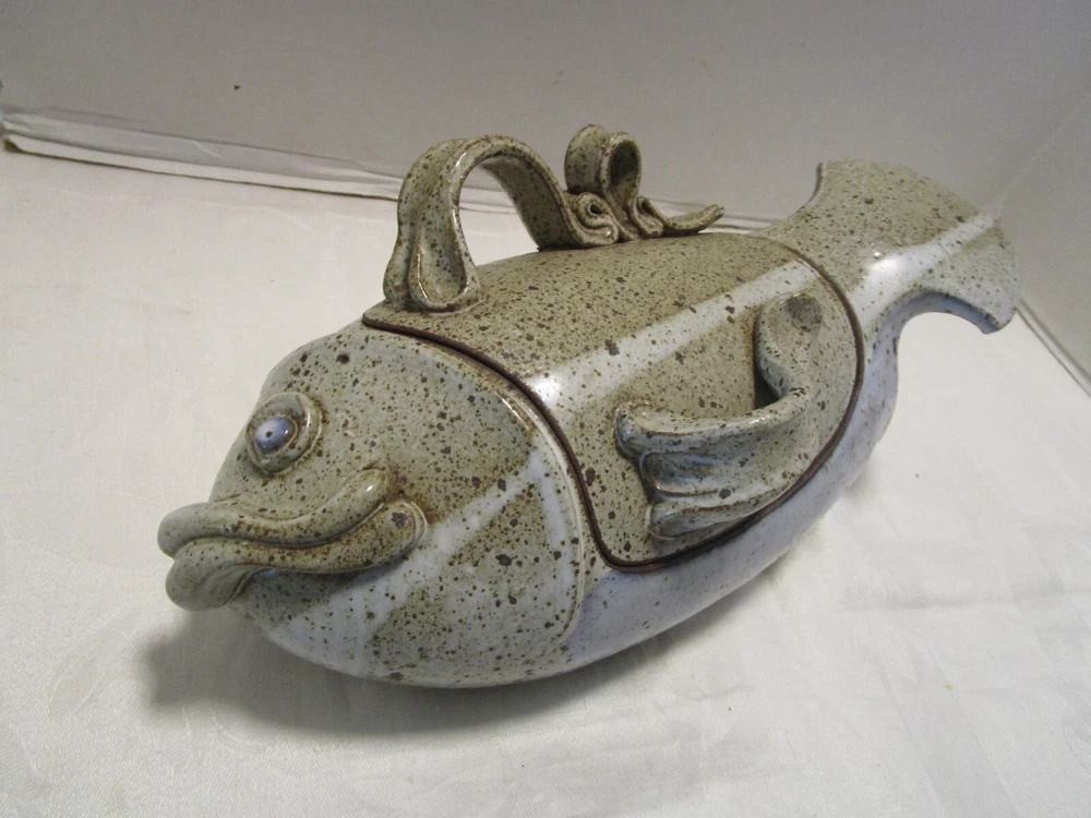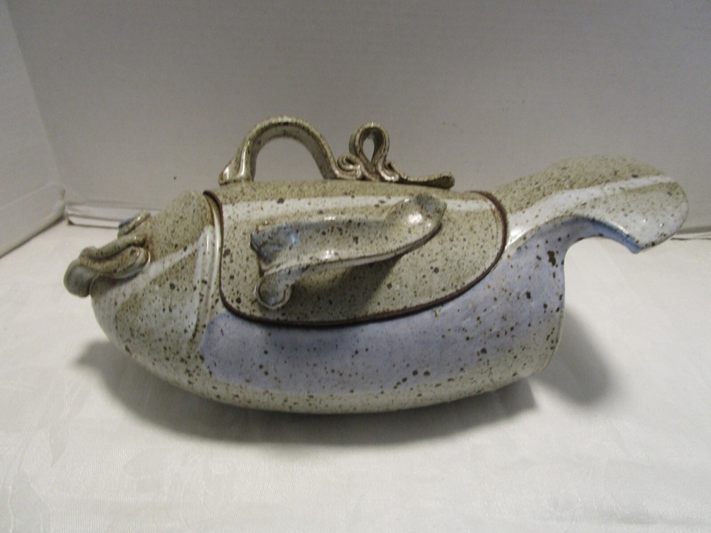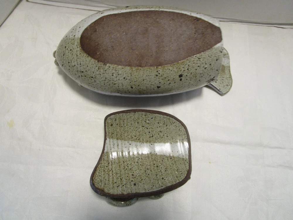 Description: 8/17/11/10 Book # 1698 Vintage Signed Studio Glazed Art Pottery Bowl Pot Lidded Fish shaped. Signed, I cannot read it- see last picture. Unique One of a Kind Versatile Multipurpose Nautical Coastal Lodge Cabin Beach House décor. Spectacular Coloration Inside and Out. Probably made in the 1980’s. Vintage by definition, is any item between 20 and 100 years old. Antique is any item 100 years old or more. It is 13” wide x 5.25” tall with lid on x 6” deep. It holds 1.50 quarts or 48 Oz. brim full. Unboxed it is 4 lbs. Excellent Vintage Condition- No Chips or cracks. Signed by the maker- see last picture. Zoom and view all pictures as they are part of the description. I DO MY BEST TO DESCRIBE EVERY LISTING BUT I AM NOT AN EXPERT AND ITEMS ARE SOLD “AS IS”. My idea of great/good may be different than yours, so EXAMINE PHOTOS CAREFULLY since they are binding and a supplement to the word description in case, I should miss something. If I fail to mention something, it does not qualify as “item not as described” if it shows in my pictures. EACH PHOTO IS WORTH A THOUSAND WORDS AND THEY ARE OF THE EXACT ITEM YOU WILL RECEIVE. RETURN POLICY: Returns are acceptable ONLY if the item doesn’t match the description, is defective, or grossly misrepresented. THIS MEANS I DO NOT ACCEPT RETURNS for FIT, SIZING, COLOR ISSUES, OR BUYER'S REMORSE. Please zoom and view ALL pictures for more details as they are part of the description. Email me with any questions you may have. Please note: Buyer pays ALL return shipping and fees. Postage fully tracked. FEEDBACK: I do not leave feedback until the end of a transaction. Transaction is considered over once I receive feedback from you confirming that you have received it and expressed satisfaction with it. If you are unsatisfied with your purchase, please contact me before leaving a neutral or negative feedback- so I can fix the issues.