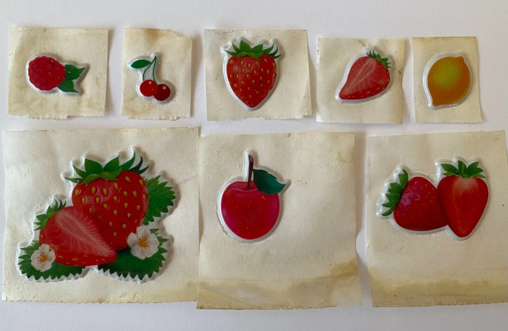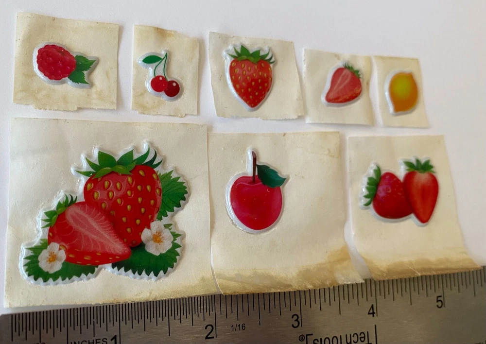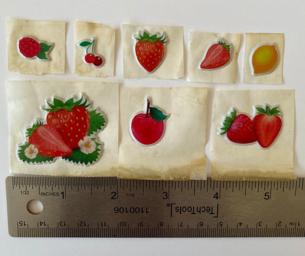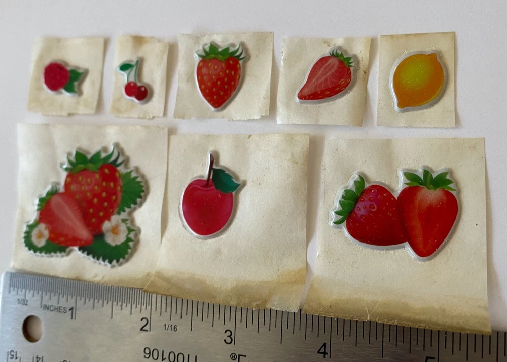 Vintage 1980s Puffy Fruit Scratch N Sniff Fruit Stickers Vinyl Stick-Ons With Smell 8 Loose Sheets show some wear. -Scent is not guaranteed due to age, but I am still able to smell every sticker. :) COLOR MAY VARY FROM DIFFERENT SCREENS PLEASE ASK ANY QUESTIONS YOU MAY HAVE ABOUT THE COLORING OF THIS ITEM BEFORE COMMITTING TO PURCHASING IT PLEASE. Check out my other collections! Thank you.