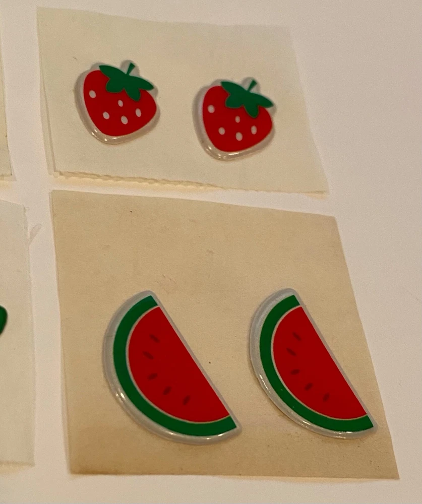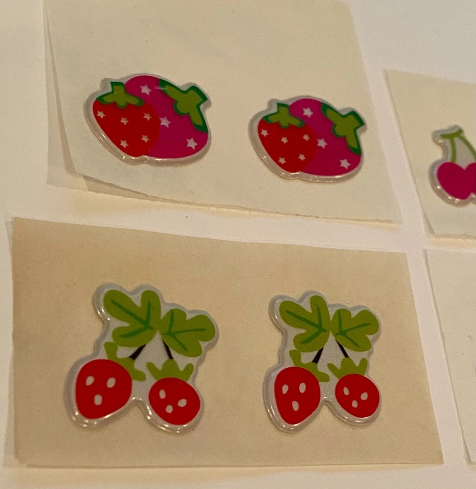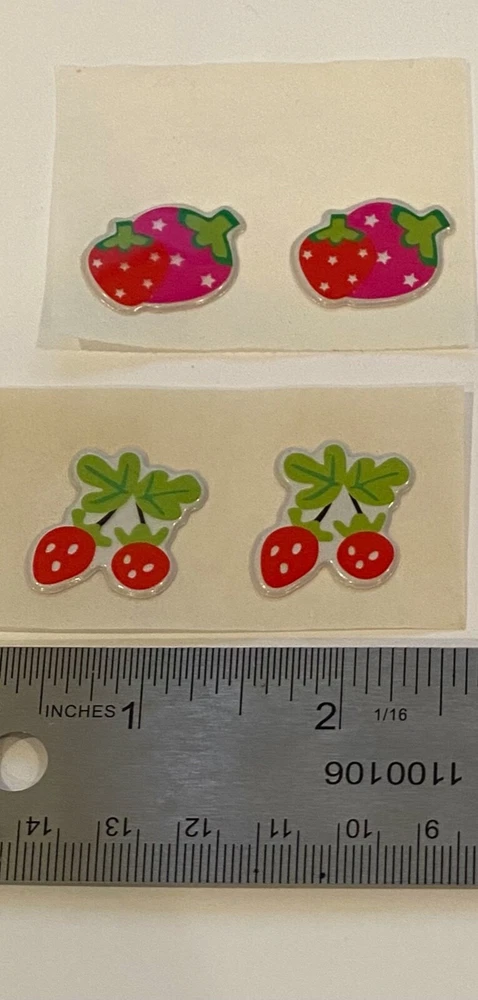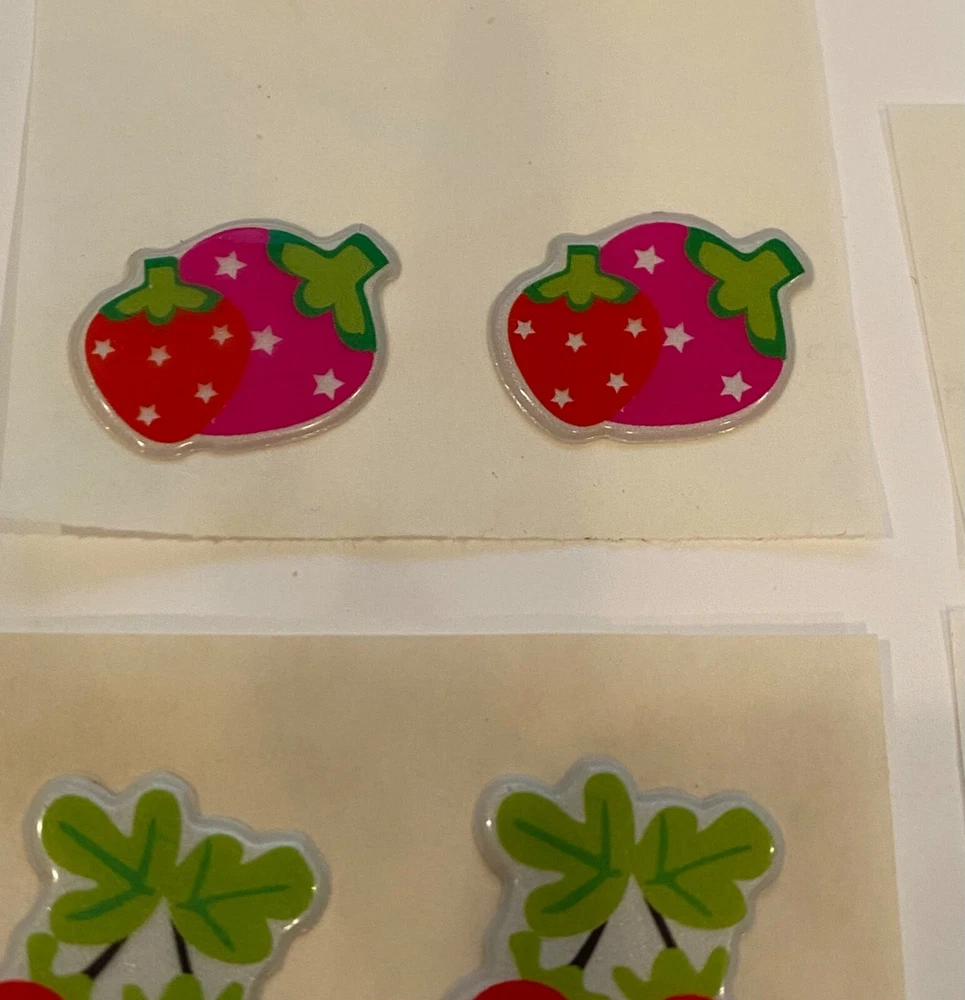 Vintage 1980s Puffy Fruit Scratch N Sniff Fruit Stickers Vinyl Stick-Ons With Smell 9 Loose Sheets show some wear. 2- Duo Strawberries 1- Pink Cherries 2 - Strawberries 2 -Watermelon Slices 2 - Duo Strawberries on Stem -Scent is not guaranteed due to age, but I am still able to smell every sticker. :) COLOR MAY VARY FROM DIFFERENT SCREENS PLEASE ASK ANY QUESTIONS YOU MAY HAVE ABOUT THE COLORING OF THIS ITEM BEFORE COMMITTING TO PURCHASING IT PLEASE. Check out my other collections! Thank you.