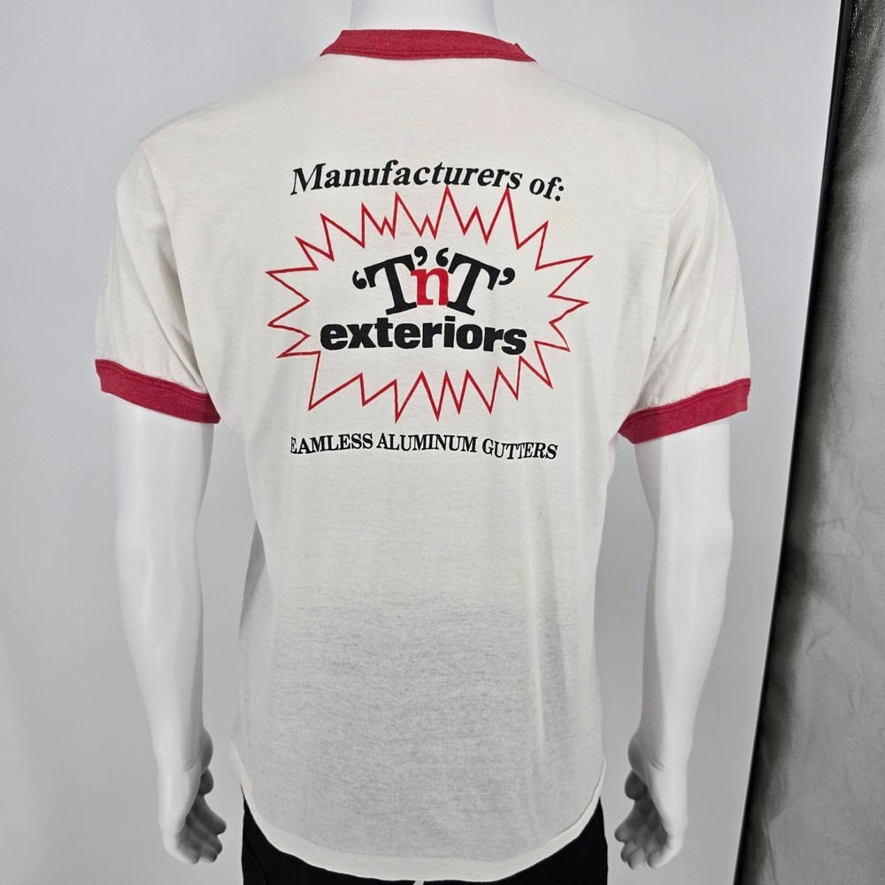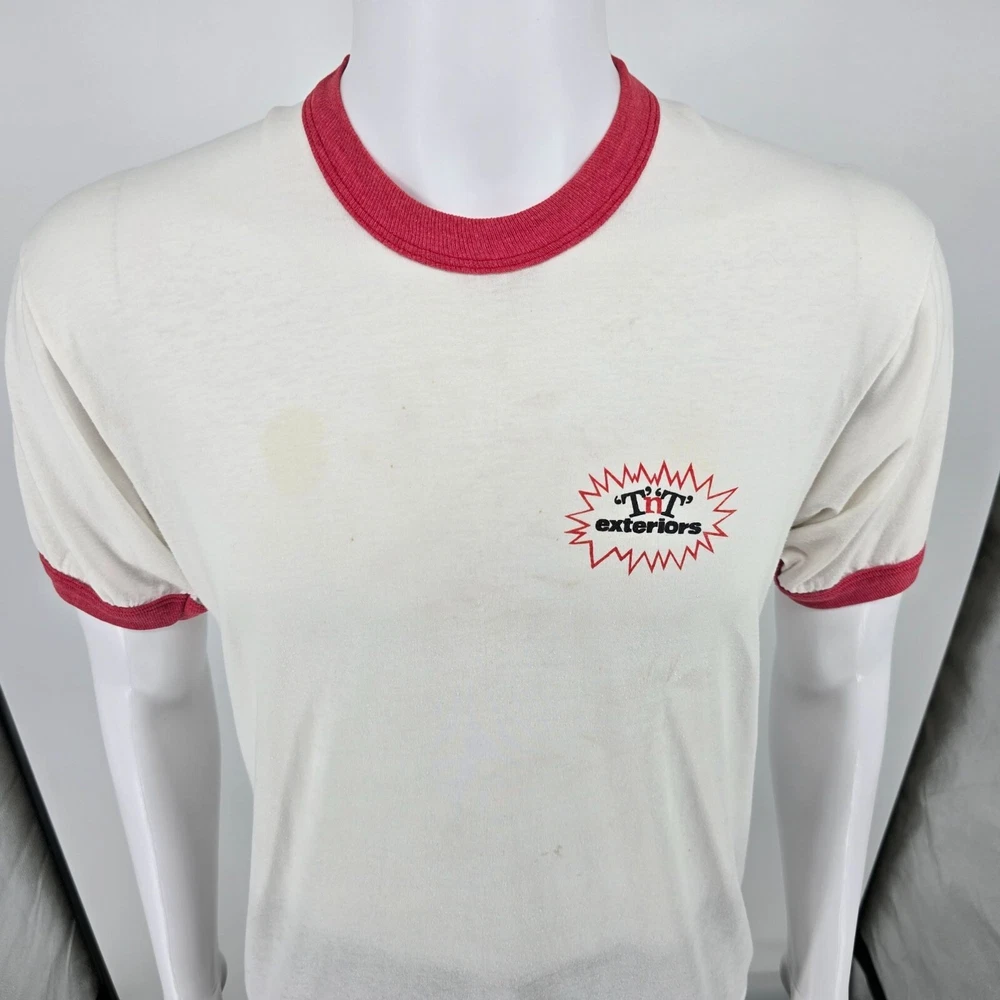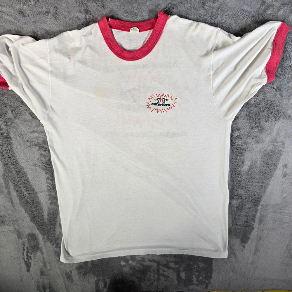 🔹 Item Details: Brand: Screen Stars Material: 50% Cotton and 50% Polyester Color: White, Red, and Black Decade of Manufacture: 1980s Country of Manufacture: USA Notable Features: Ringer Collar and Cuffs, Single Stitch Hem, small chest logo, large back logo Full Graphic Text (front and back): 'T'N'T Exteriors Manufacturers of Seamless Aluminum Gutters 🔹 Condition Notes: Fair to good used vintage condition. Multiple large but faint spots of staining and discoloration on both the front and the back of the ringer tee. A few spots residue on front of shirt. Light to moderate fabric wear throughout. See photos for details. 🔹 Size Notes: Vintage Tag Size: XL Modern Measured Size: M/L (falls between medium and large on modern size chart) 🔹 Measurements (Approximate): Chest (pit to pit): 41 inches Collar to Hem: 25 inches 🔹 Shipping & Returns: Ships worldwide from Lexington, KY. Ships within 3 business days of purchase. Returns accepted within 60 days for domestic orders and 30 days for international orders.