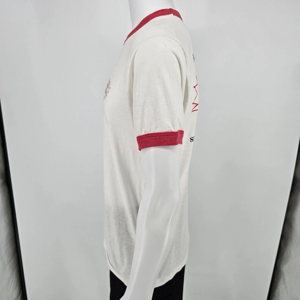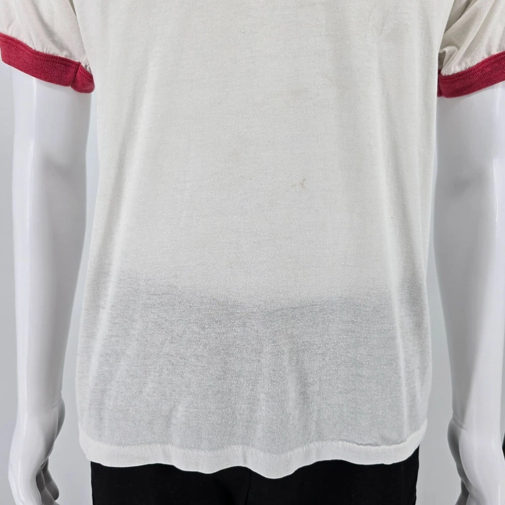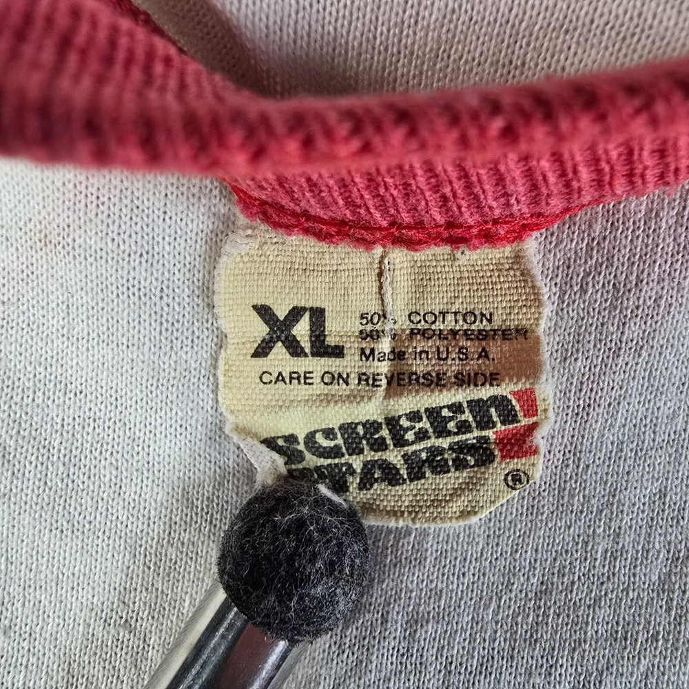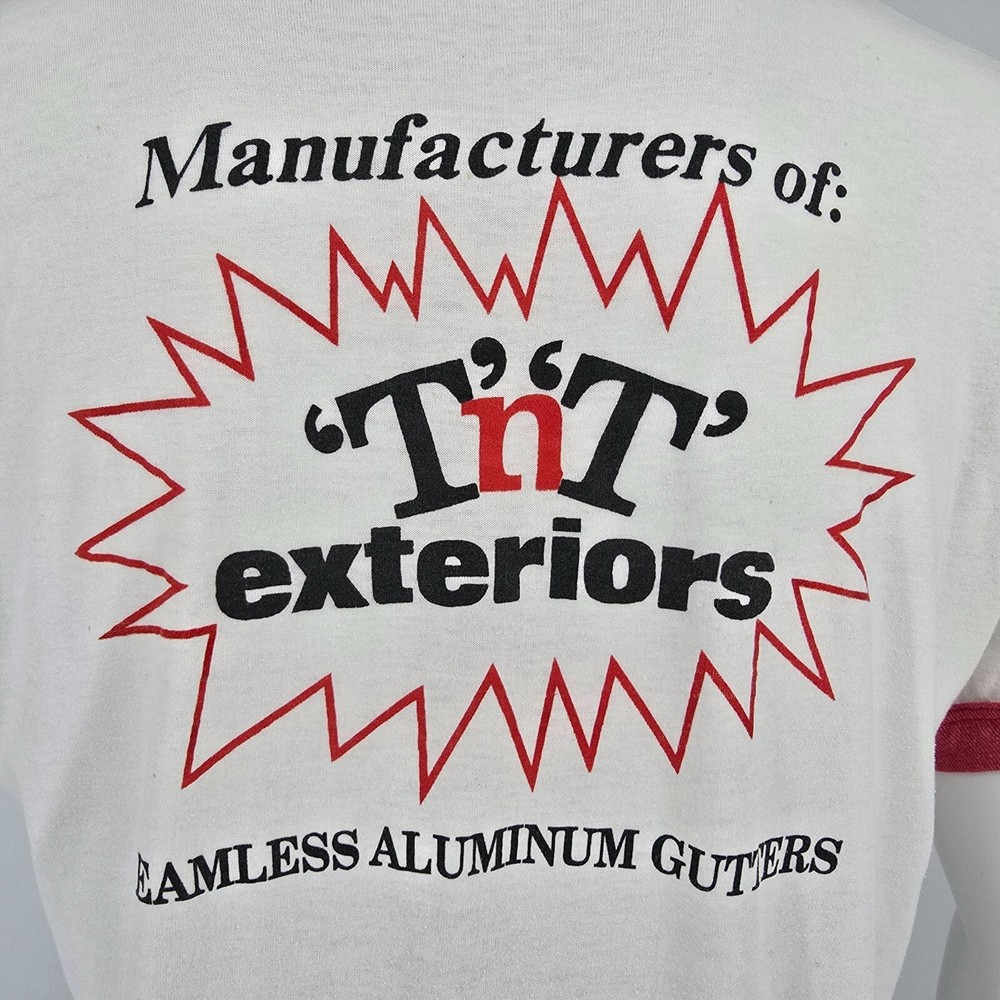 🔹 Item Details: Brand: Screen Stars Material: 50% Cotton and 50% Polyester Color: White, Red, and Black Decade of Manufacture: 1980s Country of Manufacture: USA Notable Features: Ringer Collar and Cuffs, Single Stitch Hem, small chest logo, large back logo Full Graphic Text (front and back): 'T'N'T Exteriors Manufacturers of Seamless Aluminum Gutters 🔹 Condition Notes: Fair to good used vintage condition. Multiple large but faint spots of staining and discoloration on both the front and the back of the ringer tee. A few spots residue on front of shirt. Light to moderate fabric wear throughout. See photos for details. 🔹 Size Notes: Vintage Tag Size: XL Modern Measured Size: M/L (falls between medium and large on modern size chart) 🔹 Measurements (Approximate): Chest (pit to pit): 41 inches Collar to Hem: 25 inches 🔹 Shipping & Returns: Ships worldwide from Lexington, KY. Ships within 3 business days of purchase. Returns accepted within 60 days for domestic orders and 30 days for international orders.