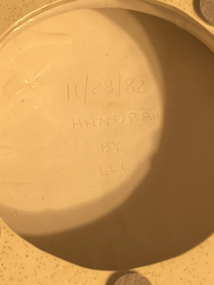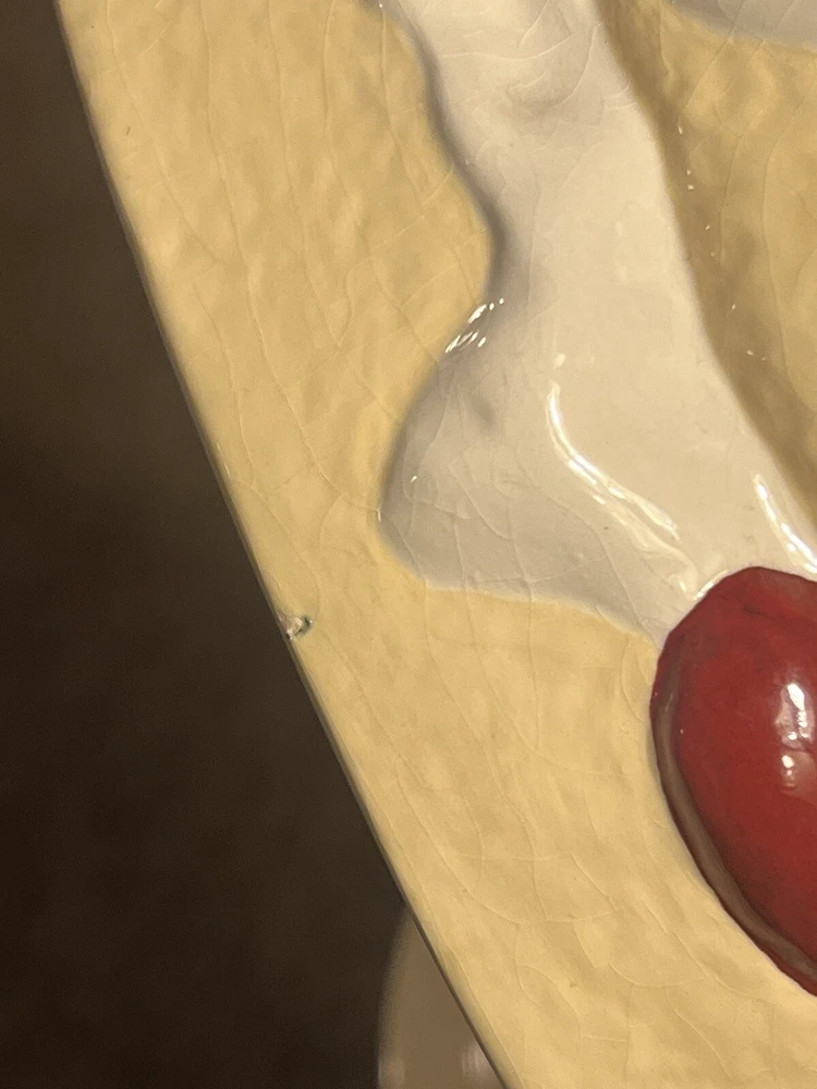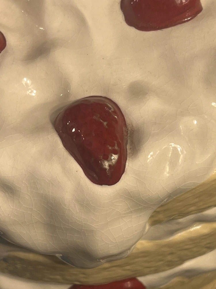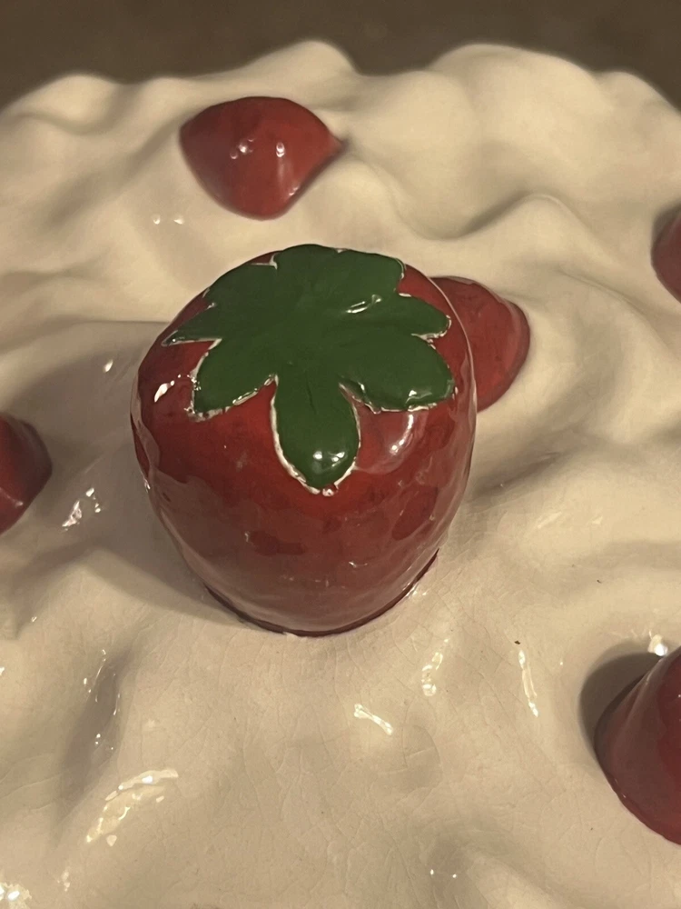 Great overall condition considering age. Few spots on strawberries that show some wear, a small Knick in the side, and crazing lines. All of these things are pictured. Measures: 10.5” H x 10.5” W Please view all pictures for overall condition!