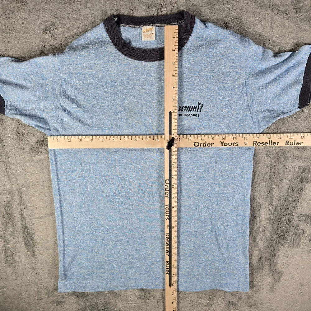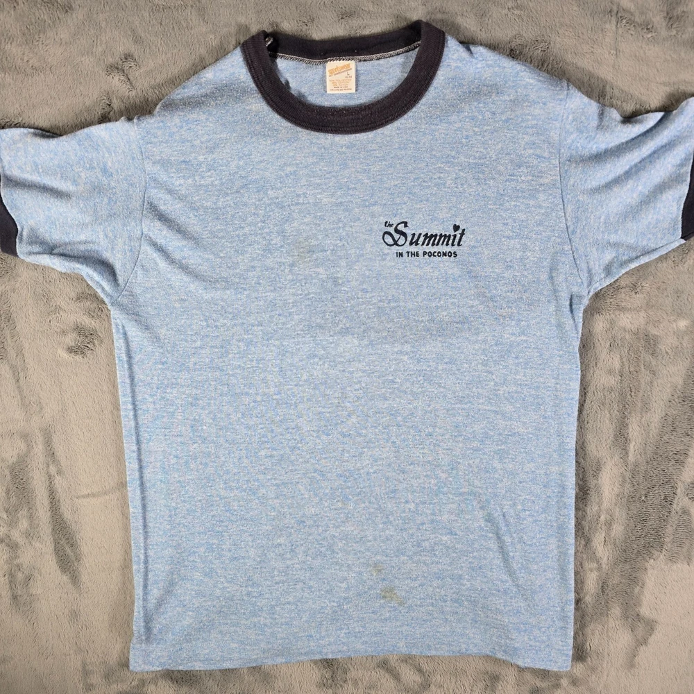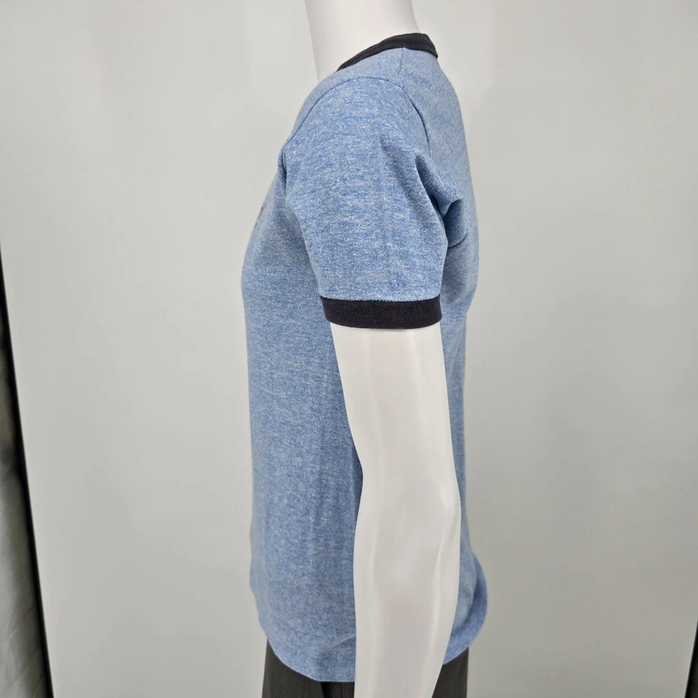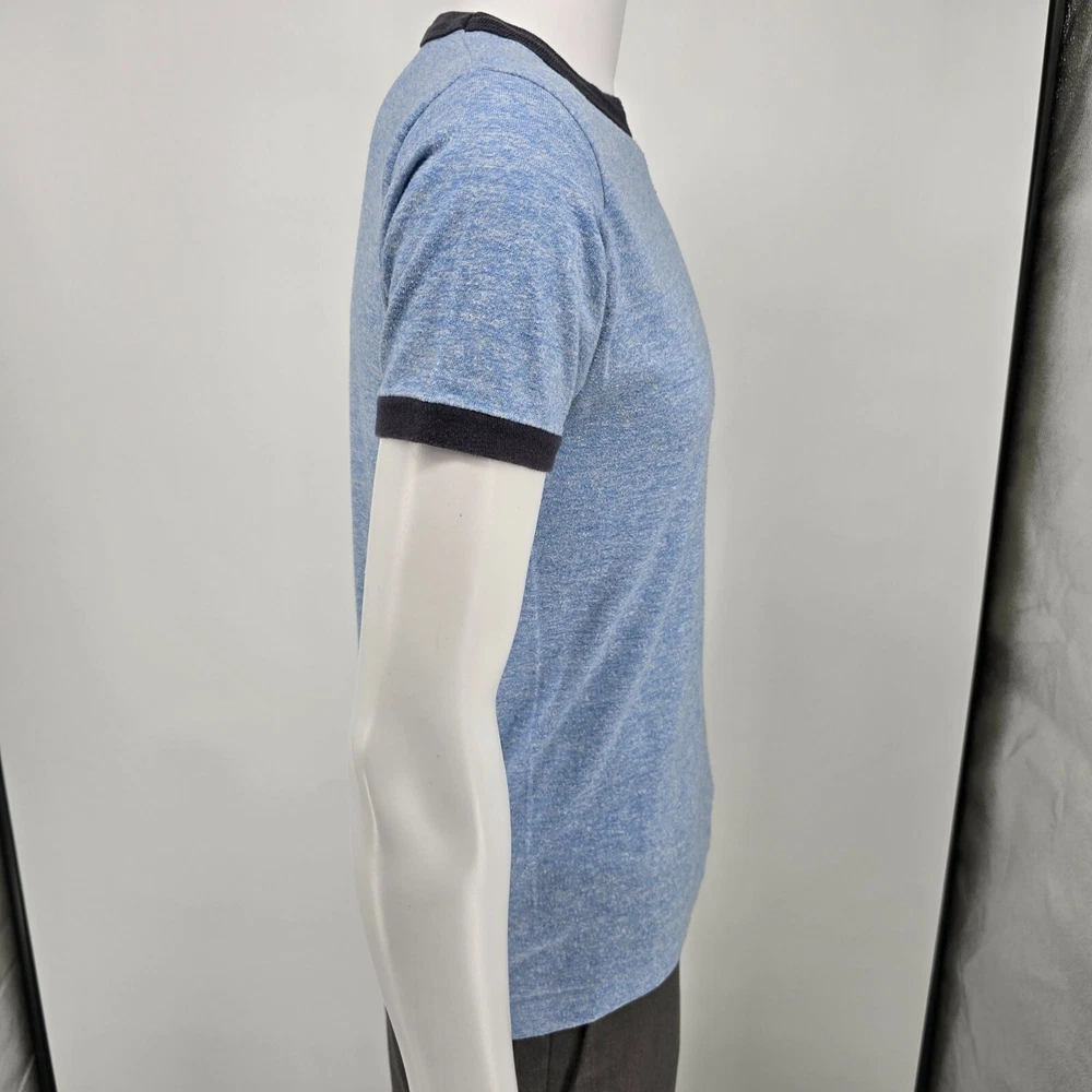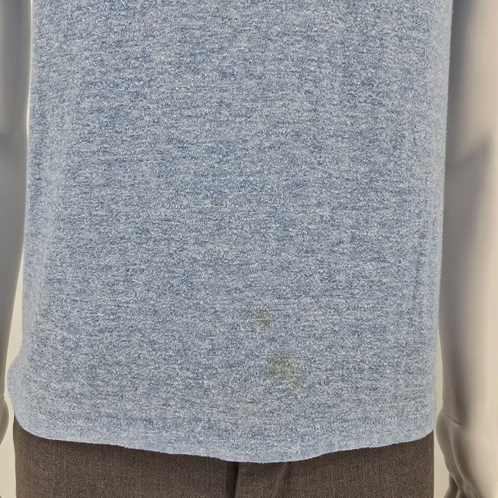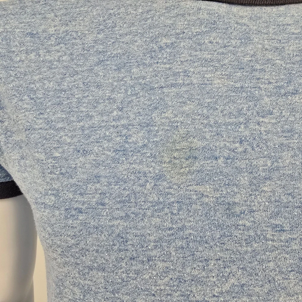 🔹 Item Details: Brand: Sportswear Material: 50% Polyester, 38% Cotton, 12% Rayon Color: Heather Blue Decade of Manufacture: 1980s (circa 1982-1983) Country of Manufacture: United States Notable Features: Single Stitch Hem, Ringer Tee 🔹 Condition Notes: Fair to good used vintage condition. Faint stain on chest to right of logo. Two yellow stains on front along bottom hem. Moderate fabric wear and pilling throughout. See photos. 🔹 Size Notes: Vintage Tag Size: Large (42-44) Modern Measured Size: Medium (38) 🔹 Measurements (Approximate): Chest (pit to pit): 38 inches Collar to Hem: 24.5 inches 🔹 Shipping & Returns: Ships worldwide from Lexington, KY. Ships within 3 business days of purchase. Returns accepted within 60 days for domestic orders and 30 days for international orders.