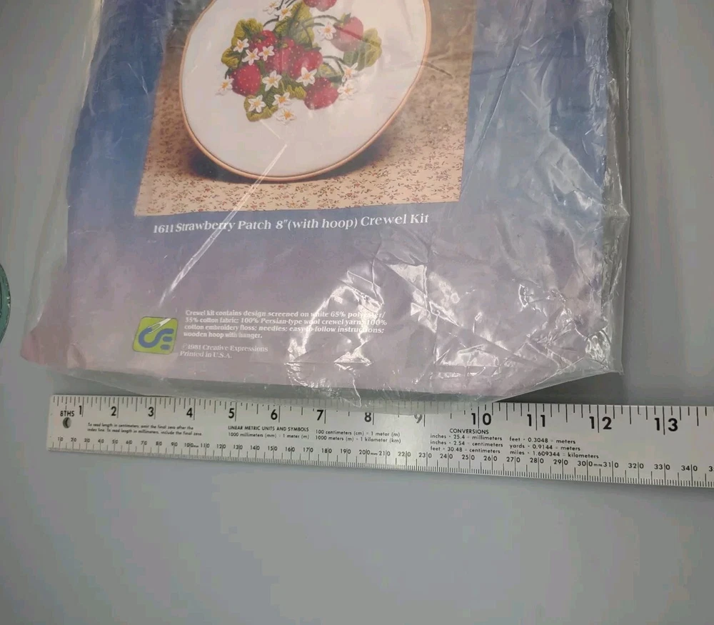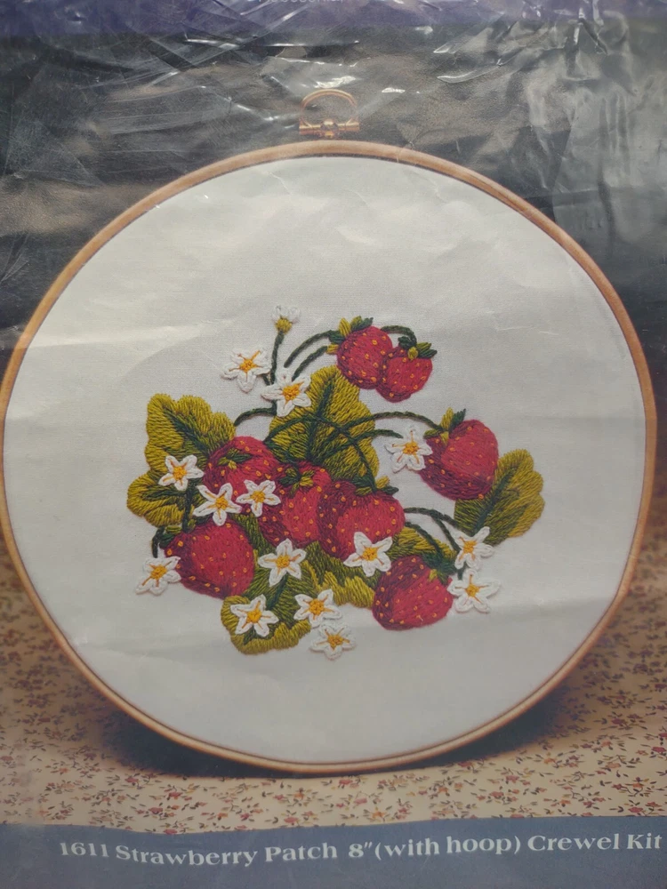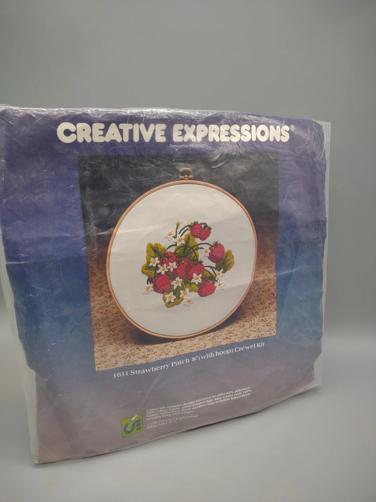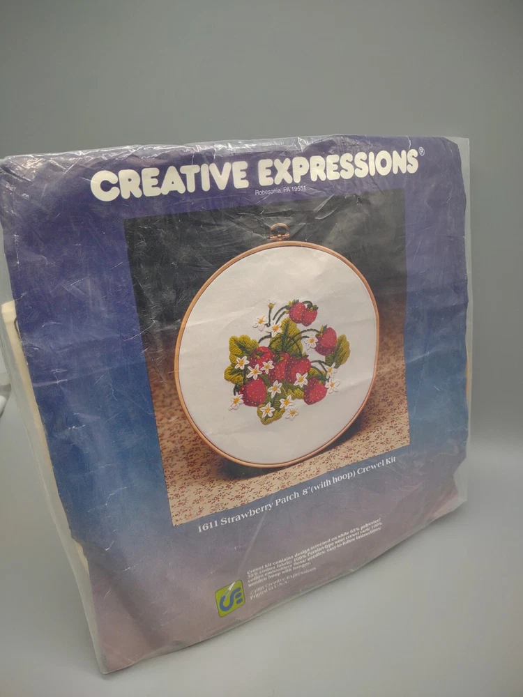 Vintage 1981 Crewel Embroidery Kit Strawberry Patch 8" Hoop by Creative Expressions. No. 1611. Made in the USA. New Old Stock. Unused, never used. NOTE: Top part of the plastic bag is opened and taped. Packed with care from a smoke-free home and ships in 1 business day. Thank you for supporting a homegrown US business and stray cat rescue/foster. Nicola @Rural Route Rarities