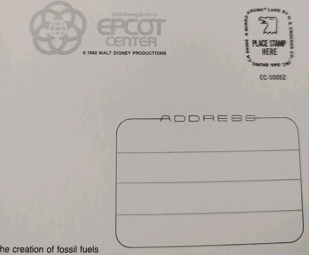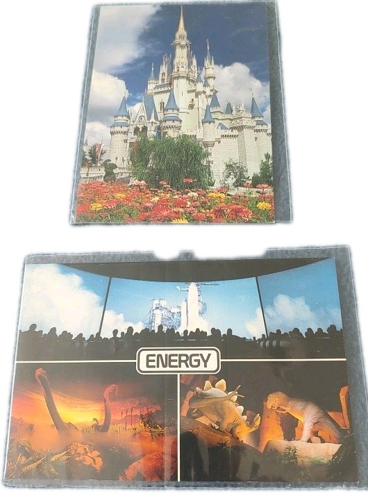 Capture the magic of Disney with this vintage lot of 2 postcards from 1982, featuring the iconic Energy Pavillion in Epcot center and the Walt Disney World princess Castle. Produced by Walt Disney productions, these real photo postcards (RPPC) are original and unposted, making them a collector's dream. The postcards measure 6 x 4 inches and are in continental size. The postcards are made of cardboard and paper and have a divided back, perfect for sending or displaying. These postcards are a great addition to any Disney or amusement park collection. They are also a perfect souvenir for any Disney enthusiast.