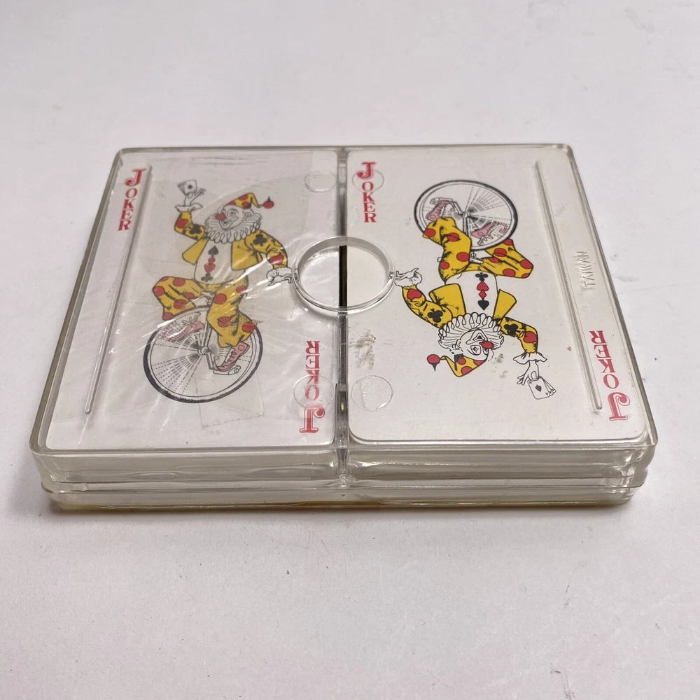 One is a complete 52 card deck plus 2 jokers. The second deck is still sealed. Top of clear case has a crack as pictured. Photos show the actual items you will receive.