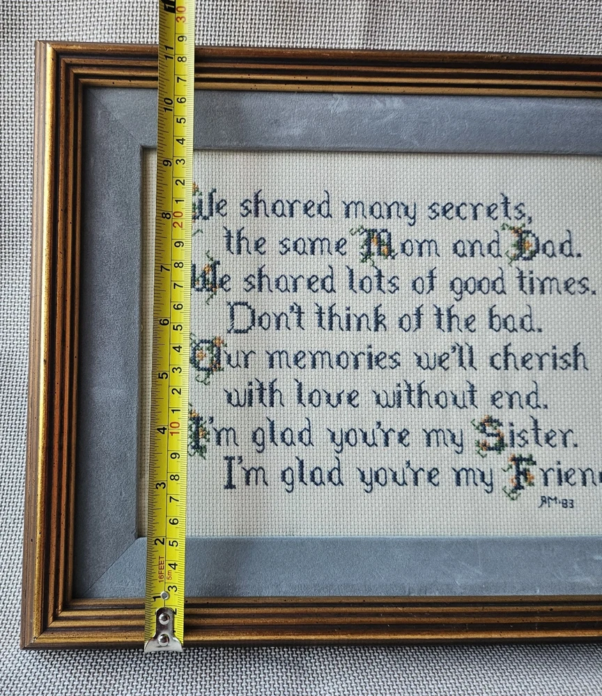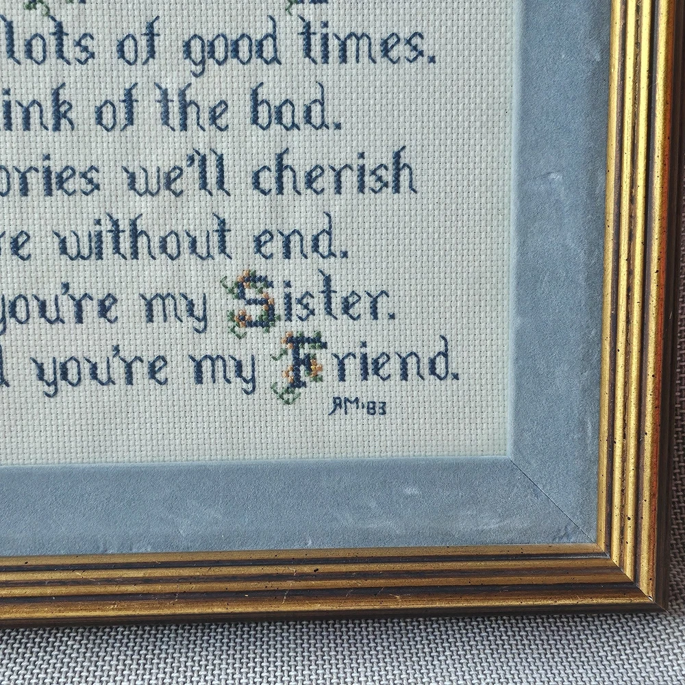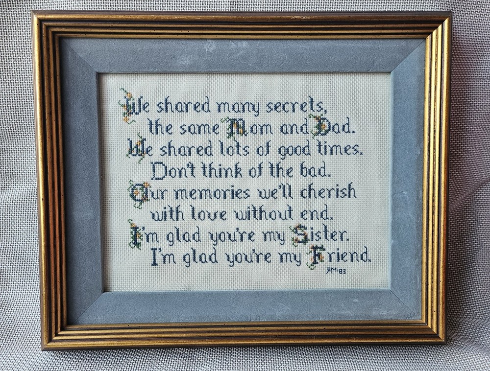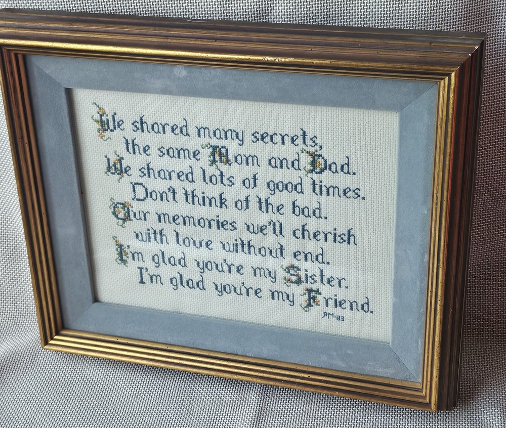 Beautifully preserved, handmade vintage cross-stitch from 1983. This charming piece of wall decor features a classic sentimental poem about the bond between sisters. It is a "completed" counted cross-stitch, professionally finished with high-quality matting and a vintage gold-toned frame. The Poem Reads: "We shared many secrets, the same Mom and Dad. We shared lots of good times. Don’t think of the bad. Our memories we’ll cherish with love without end. I’m glad you’re my Sister. I’m glad you’re my Friend."