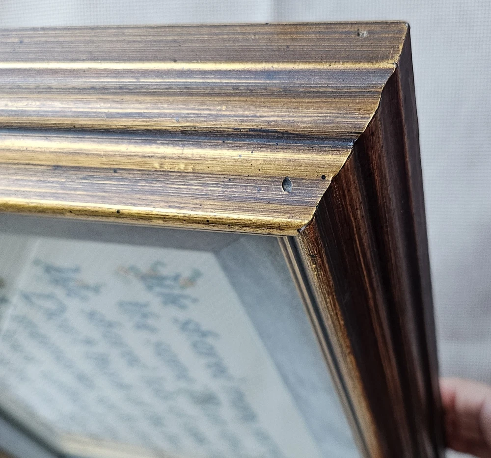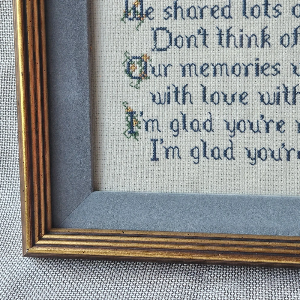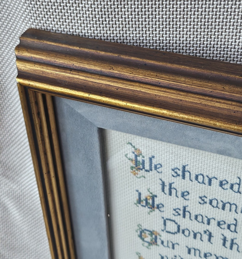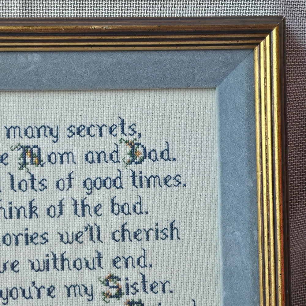 Beautifully preserved, handmade vintage cross-stitch from 1983. This charming piece of wall decor features a classic sentimental poem about the bond between sisters. It is a "completed" counted cross-stitch, professionally finished with high-quality matting and a vintage gold-toned frame. The Poem Reads: "We shared many secrets, the same Mom and Dad. We shared lots of good times. Don’t think of the bad. Our memories we’ll cherish with love without end. I’m glad you’re my Sister. I’m glad you’re my Friend."