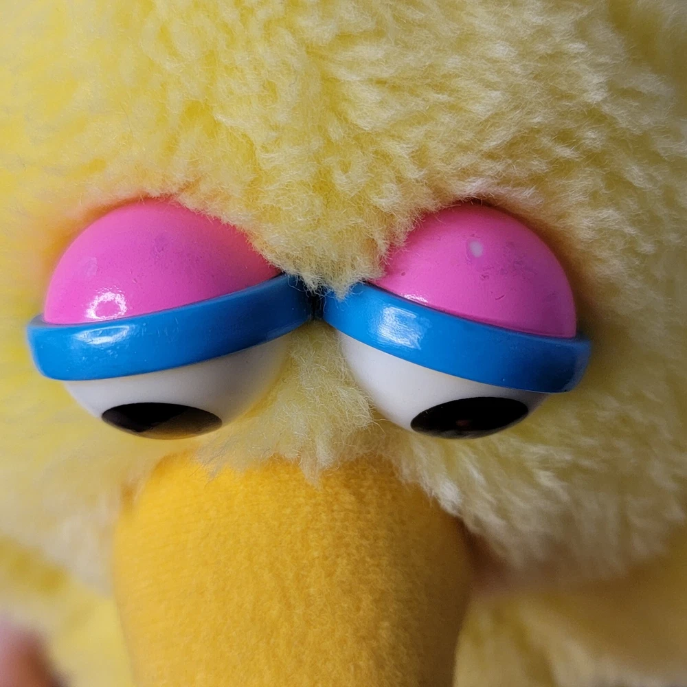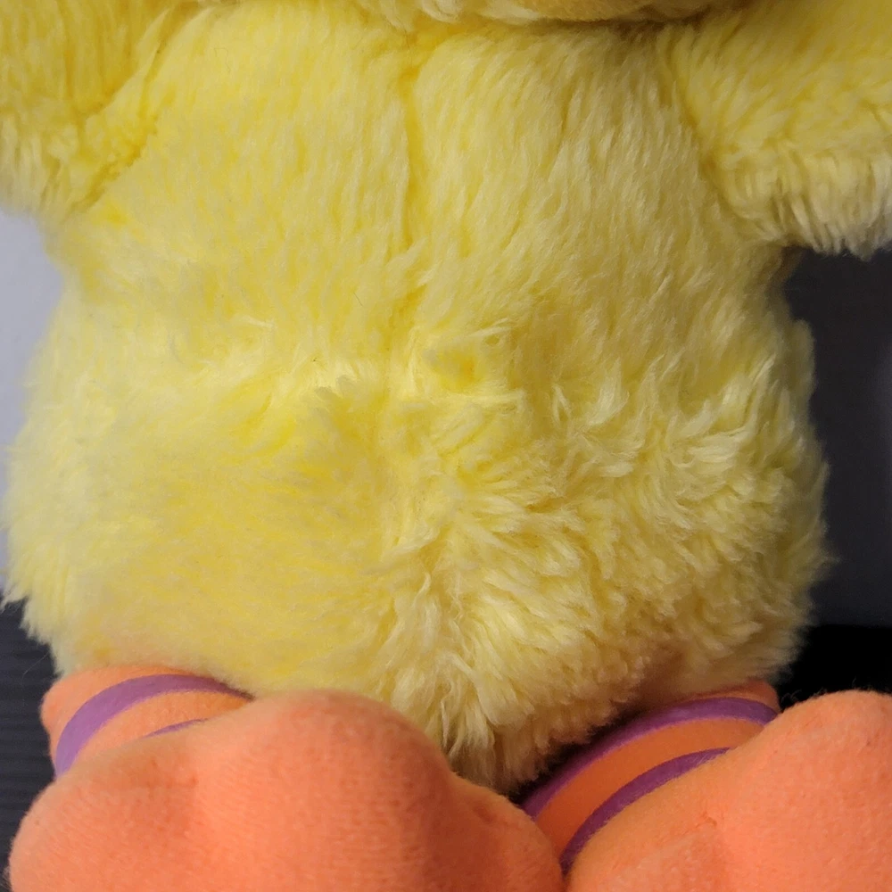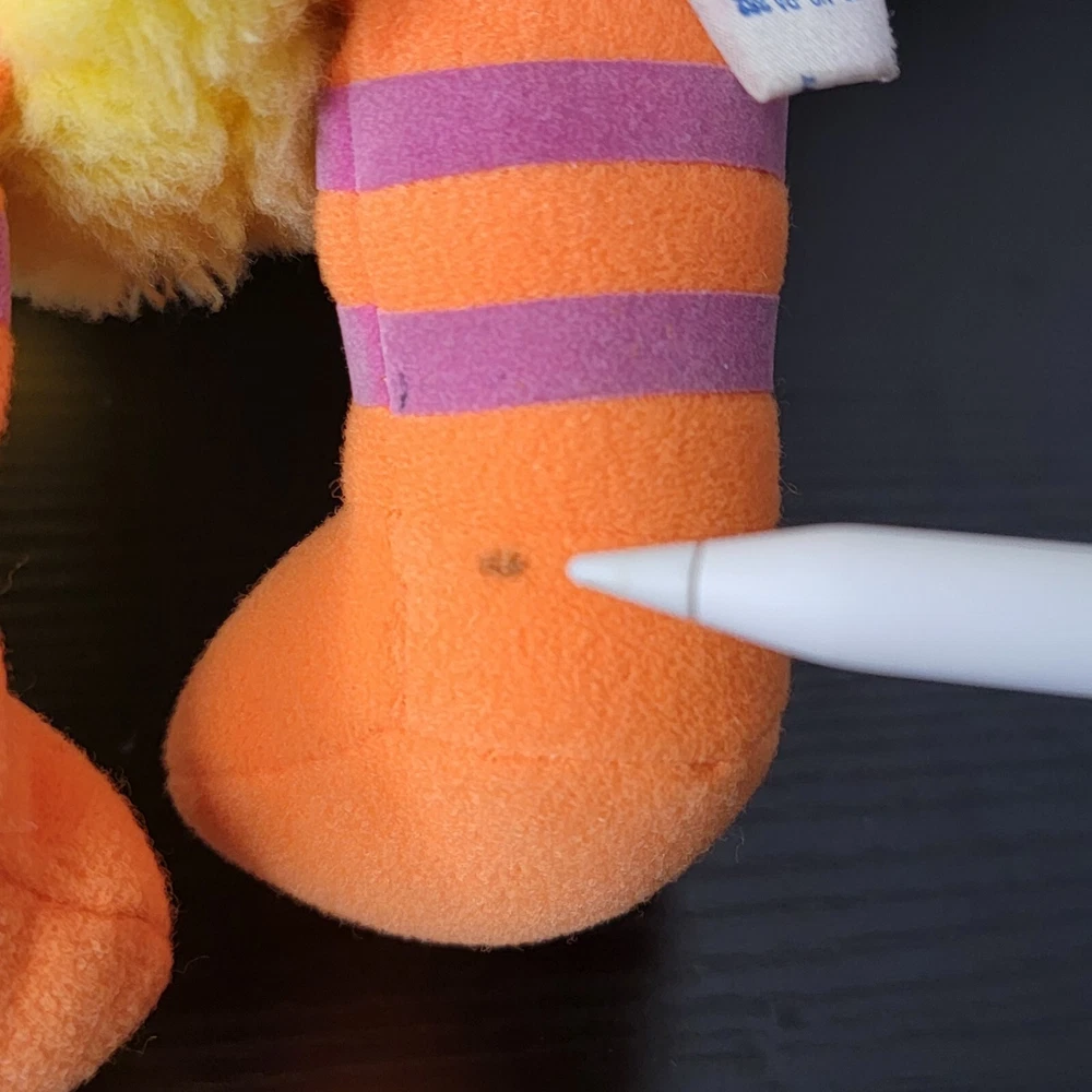 Has stains back of leg. His belly has a matted line shown in pictures and small chip on eye shown in pictures.