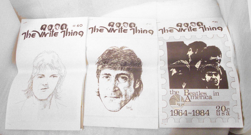 Lot of Three (3) THE WRITE THING Vintage Beatle Fanzines. #40, 41 and 42. Published by Barb Fenick, Minneapolis, MN. When folded out fanzines measure 8 ½” x 14”. They are as follows: 1. THE WRITE THING Issue #40 June/July 1983. Features Paul McCartney on cover. 26 pages. 2. THE WRITE THING Issue #41 Oct/Nov 1983. Features John Lennon on cover. 26 pages. 3. THE WRITE THING Issue #42 Feb/March 1984. Features Beatles 20th Anniversary of coming to America on cover. 26 pages. Items are from my personal collection and they come with address labels on them. Some aging to paper. No loose pages to magazines; solid. They are being offered, “As Is”. PLEASE NOTE: Please forgive the Lighting. I do my best to describe the item as well as possible. In the event item does not arrive to you as described, Please contact me before leaving a Feedback. --------------------------- Buyer pays Actual Shipping plus $0.60 Packaging Fee. Sorry, No Local Pickups. Shipping weight approximately 0 pounds 11 ounces. All communications must be in English. Items are packaged prior to Listing, Therefore No Combined Shipping. --------------------------- If I do not receive a response from the winning bidder after one week, the item will be re-listed. Please contract us if you have any questions. Thank you for your consideration. ZDZZ 250509 12x9x2 KLH0105