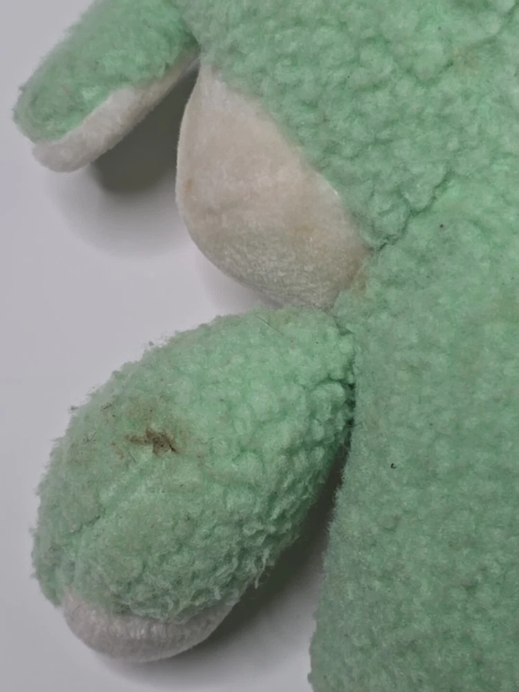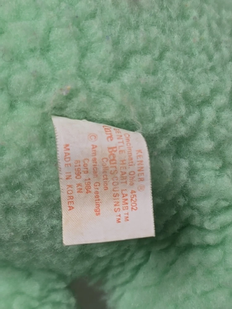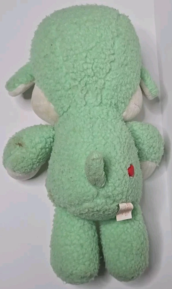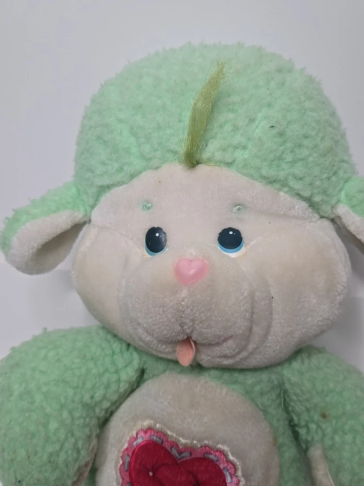 This vintage 1984 Care Bear Cousins Gentle Heart Lamb plush toy is a 13-inch green stuffed animal from the Care Bears franchise. Made of plush material, this gentle lamb with blue eyes is a nostalgic collectible from the 1980s. Manufactured by Kenner in Taiwan, this Care Bear Cousins toy is a beloved piece for fans of vintage Care Bears merchandise. Perfect for collectors or nostalgic individuals, this adorable Gentle Heart Lamb is a charming addition to any Care Bears collection. DOES HAVE STAINS , SHOWN IN PICTURES. SOLD AS IS.