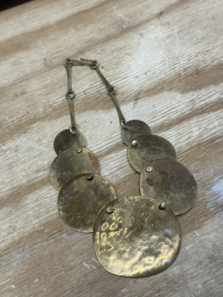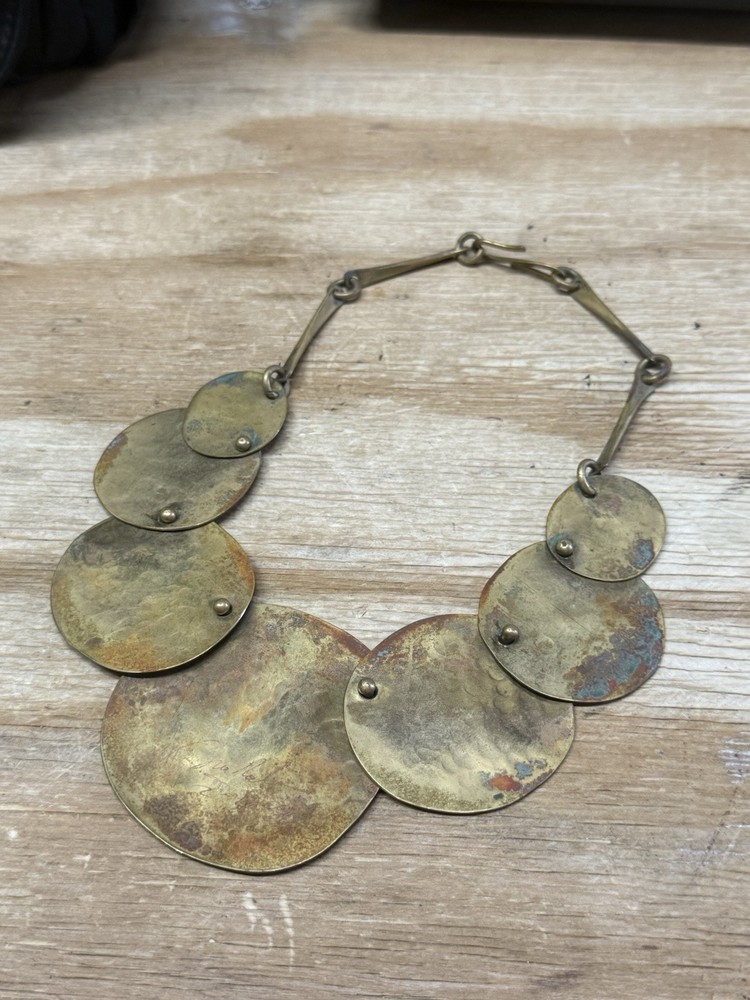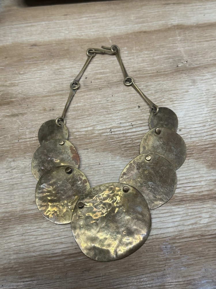 This is a vintage handmade necklace by Joseph Boris in 1984. The necklace is made of brass and has a brutalist style with a chain and choker design. The metal purity is 100%, and the necklace is crafted in the United States. The main stone color is brass, and the necklace does not have any stones. The necklace is rare and has a brass color. RARE AND VERY COOL PIECE! FAST SHIPPING!