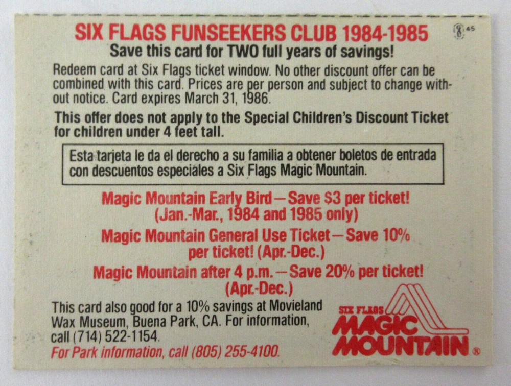 Check out our store under the "Souvenirs & Memorabilia > U.S. > California" category for other similar items and save on shipping! Estate sale find, original vintage Magic Mountain Ticket Six Flags Fun Seekers Club Discount Coupon 1984 . The item measures approximately 2" X 3", approximate shipping weight 2 ounces. PLEASE SEE DESCRIPTION AND PHOTOS FOR ADDITIONAL DETAILS - The item appears to be in overall Fair to Good Minus used condition, signs of wear, creases, fading, tears, chipping, sunning and age toning, soiling, stains, writing, no odors, please see images. (PH22-306)