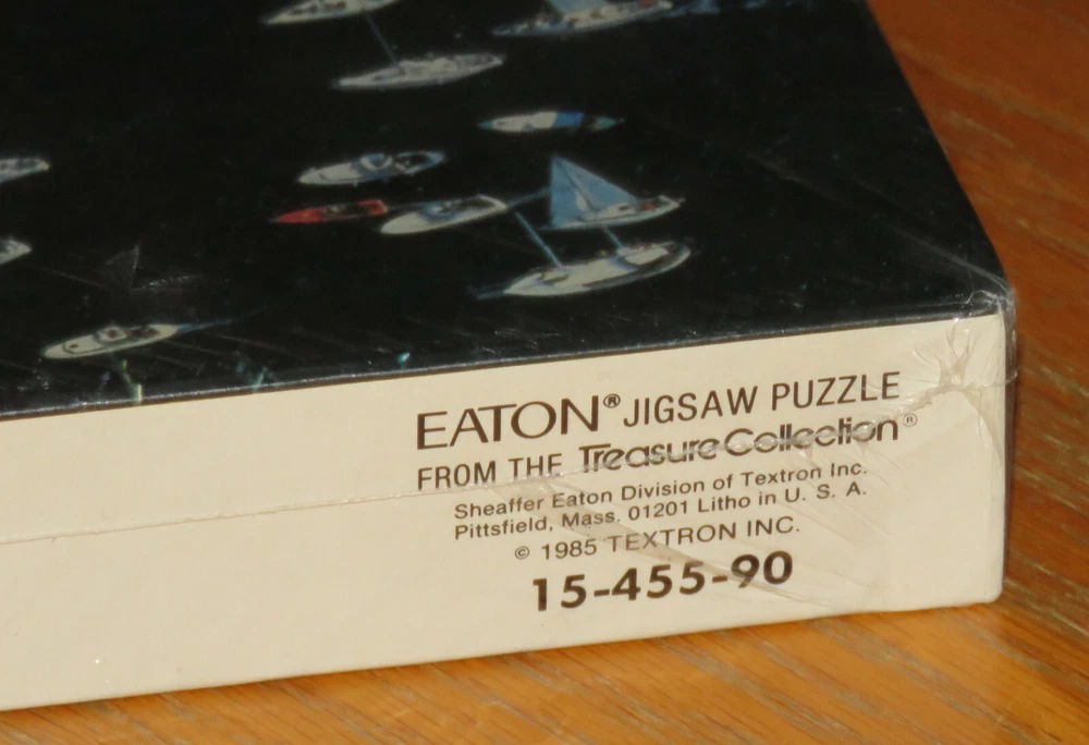 Vintage Factory Sealed Puzzle "Full Sails" No.15-455-90 Over 500 Pieces Finished Size: 18" x 24" Made in U.S.A.©1985 Sheaffer Eaton, Textron Inc. Pictures are of the actual puzzle you will receive. Will be shipped in a box. Package weighs over 2 pounds.