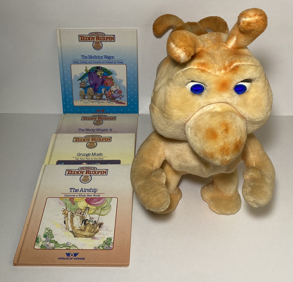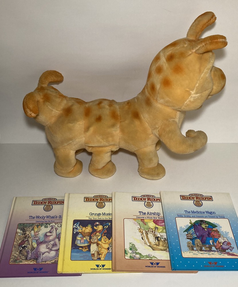 Vtg 1985 Worlds of Wonder Teddy Ruxpin Grubby Caterpillar No Cord/Battery Cover. The item looks to be in overall good condition but I have no way of testing it. I’m unsure of its working condition. It is missing the battery cover and animation cord. It does include the 4 books pictured. The lot will ship out safely and securely the same or next business day.