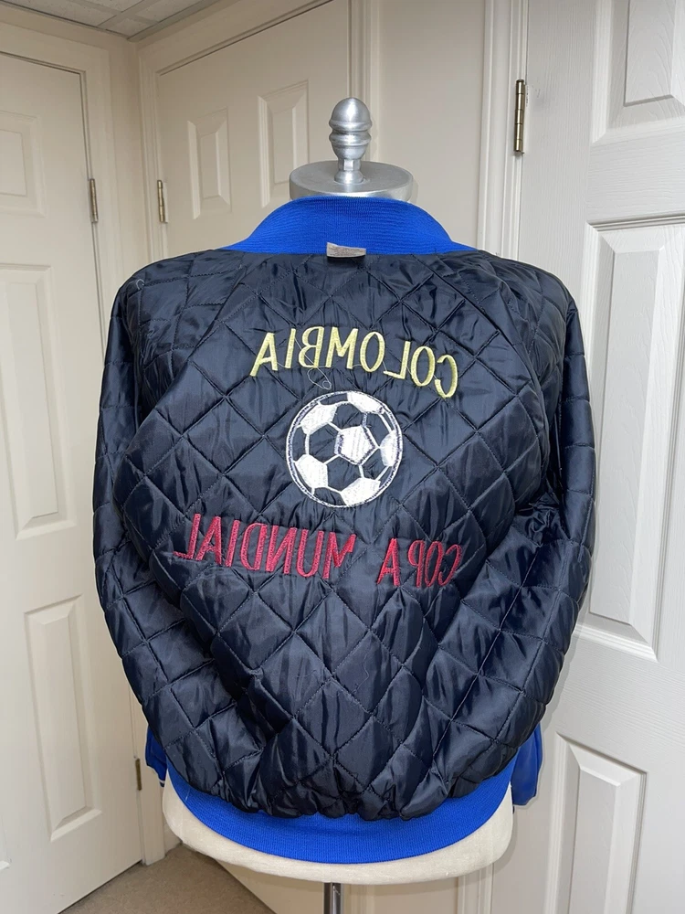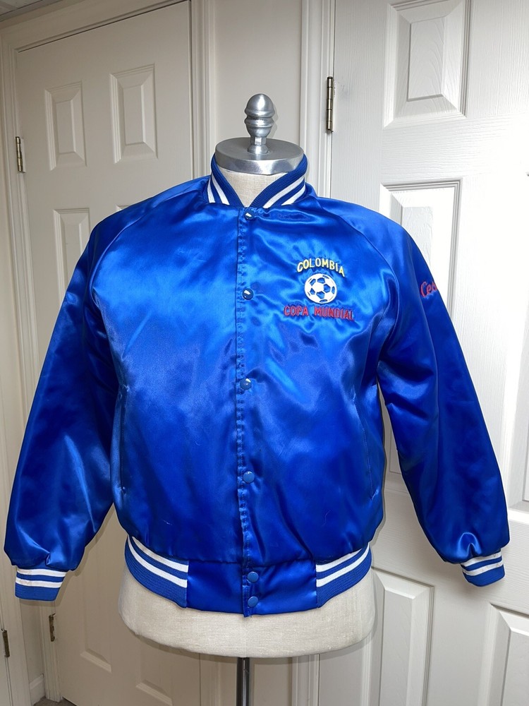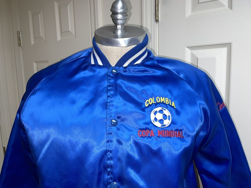 Vtg Auburn Sportswear Blue Satin Jacket Sz L 1986 SOCCER WORLD CUP COLOMBIA RARE. Colombia tournament was cancelled. What happen? There is only one edition of the World Cup which nobody remembers, and that is Colombia ‘86. There are no iconic images from the tournament, no footage survives and there is barely a mention of it in FIFA’s official history. That is because Colombia ‘86 never happened. It remains the only World Cup to be cancelled after the host nation had formally been decided, though Mexico later stepped up and took on the role of hosts. Origins of the tournament The 1986 World Cup was initially granted to Colombia in 1974, this after an unopposed bid was approved by the FIFA Executive Committee. By the early eighties, however, the Colombian government was seriously reconsidering the wisdom of hosting the tournament. Not only was the country in the grip of one of the world’s most infamous narcotics crises – the Medellin cartel, as globally popularised by Netflix’s Narcos, was in its ultra-violent ascendancy at this stage – the government was also facing a brutal internal conflict against various left-wing guerrilla groups. The FARC, M-19 and other insurgent organisations were a huge thorn in the side of the Colombian authorities. Combating their influence cost an enormous amount of money, while the national debt had grown to menacing proportions. With the World Cup expanded to 24 teams ahead of Spain ‘82, the cost of the tournament became an increasing source of anxiety for a government fighting a war on several fronts. In November 1982, the situation finally came to a head. As reported in The New York Times, Colombian president Belisario Betancur announced: “The 1986 World Football Championship will not be held in Colombia. We have a lot of things to do here, and there is not enough time to attend to the extravagances of FIFA and its members.” Citing economic concerns – there was also the small issue of a worldwide recession at the time, while the main national export, coffee, was on the wane – Colombia officially renounced their host status. According to contemporary reports there had been little serious planning with regards to the necessary infrastructure and facilities, with FIFA officials becoming increasingly exasperated with successive Colombian governments and their failure to live up to expectations. Mexico to the rescue The hosting process was quickly reopened, with Canada, Mexico and the United States all entering the race. Come May 1983, Mexico were named the new hosts by a unanimous vote Measurements back flat: Armpit to armpit 24.5” Length 26” Neck seams to sleeve ends 33”